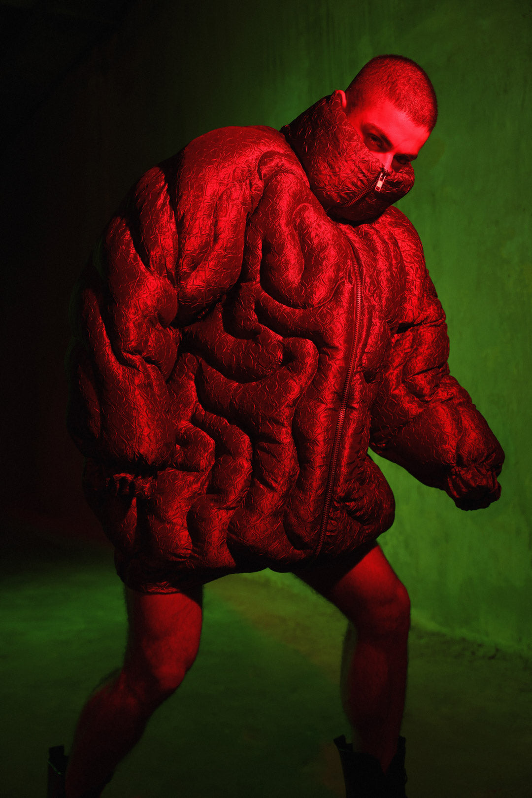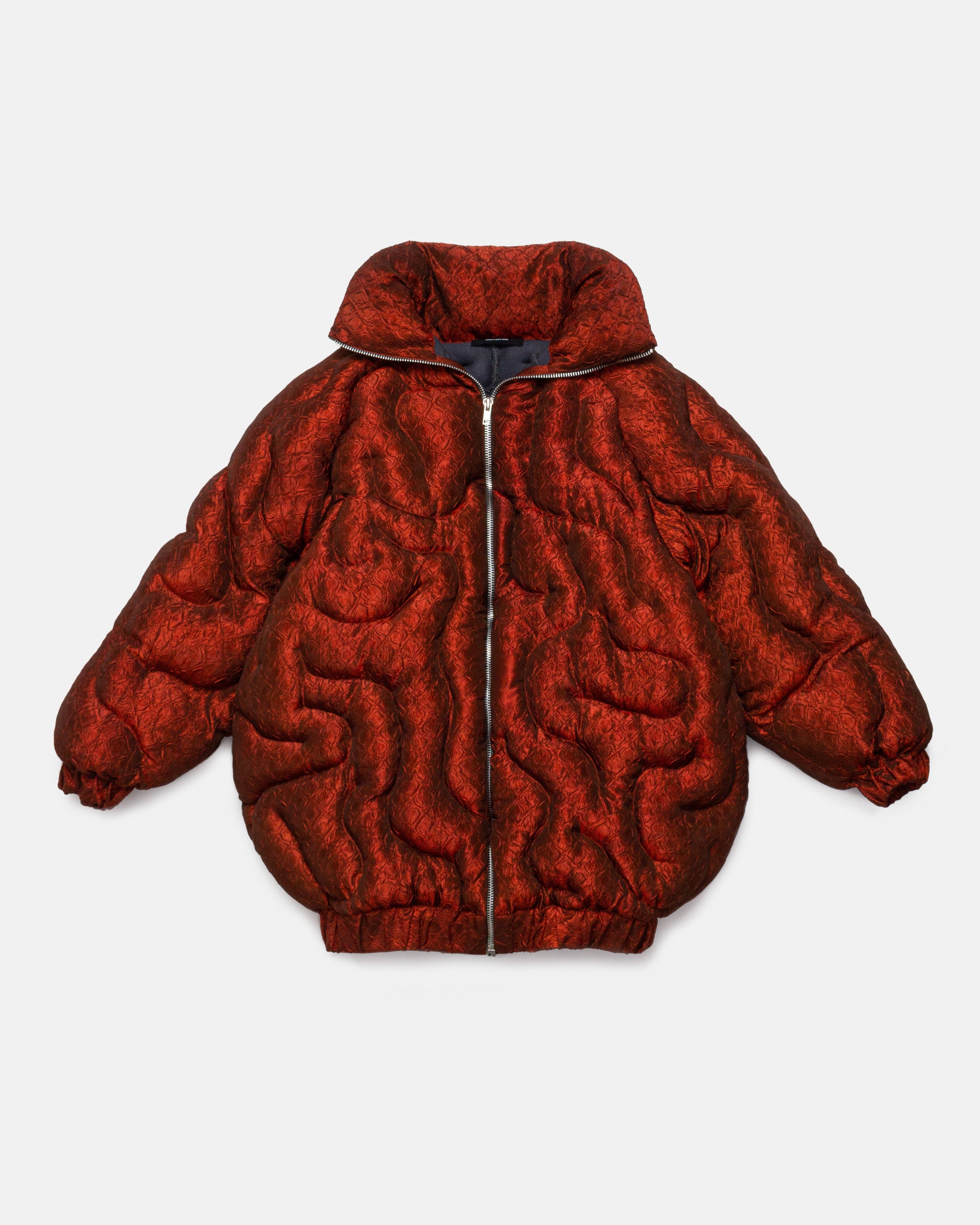 A dramatically oversized puffer jacket in a shiny crinkled burgundy fabric featuring a bulky zipper and comfortable knit jersey lining with embroidered wool yarn from the inside.