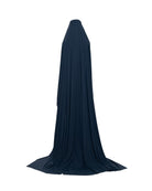 A navy jersey dress that combines classical draping with contemporary minimalism. The stretch polyester-spandex fabric hugs the body, while a cowl neckline extends from the back of the head and flows into cape-like panels. A gathered cowl like drape at the waist breaks the silhouette with subtle dimensionality.