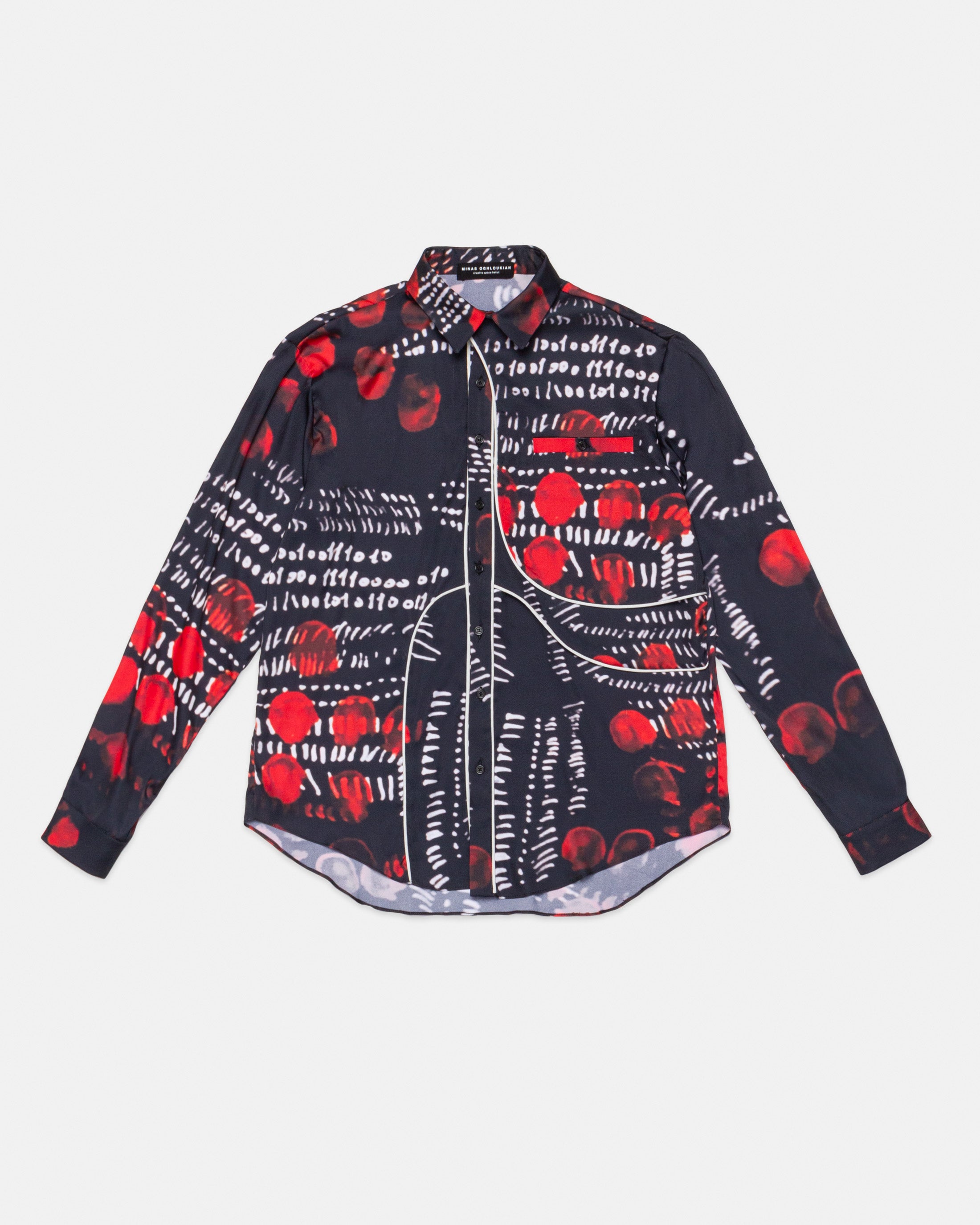 Digitally printed satin shirt featuring a gun flap, welt pocket and white piping.