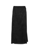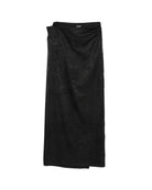 Long black skirt in a structured cotton-silk blend. The minimalist piece wraps around the waist in double layers fastened by hidden buttons. Featuring a front slit and inseam pockets.