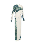 Cut from cotton-polyester jersey, this maxi dress features a cyanotype print and carefully placed pintucks reinforced with plastic boning. This sculpts the silhouette and add dynamic movement, reshaping the body as the garment flows.