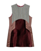 An A-line dress in muted denim, designed with curved chest cutouts and sculptural side pockets. The combination of cotton denim, silk taffeta, and soft corduroy gives the piece both textural contrast and depth, blending structured tailoring with subtle volume.