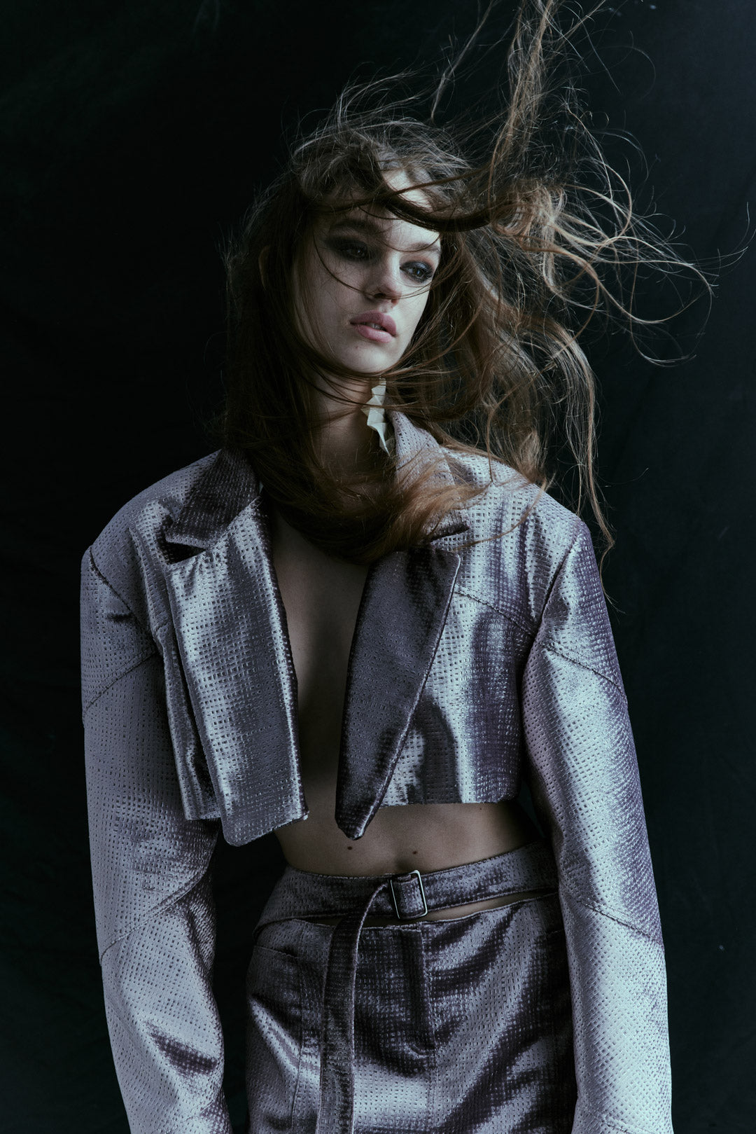 Cropped oversized blazer with pleated collar and spiral sleeves