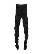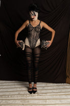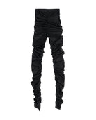 High-waisted compression leggings in ruched black mesh. Made from nylon-spandex net, they contour the body with stretch and structure. Shapewear reimagined through texture and tension.