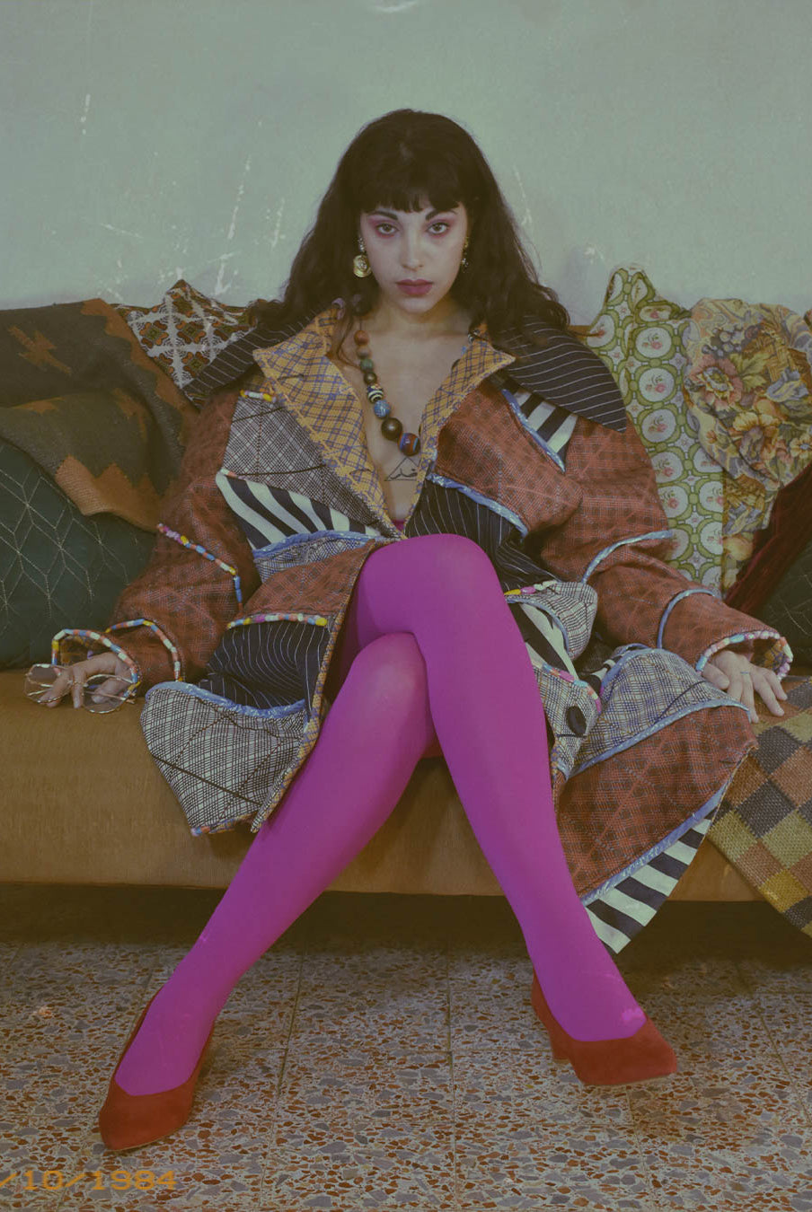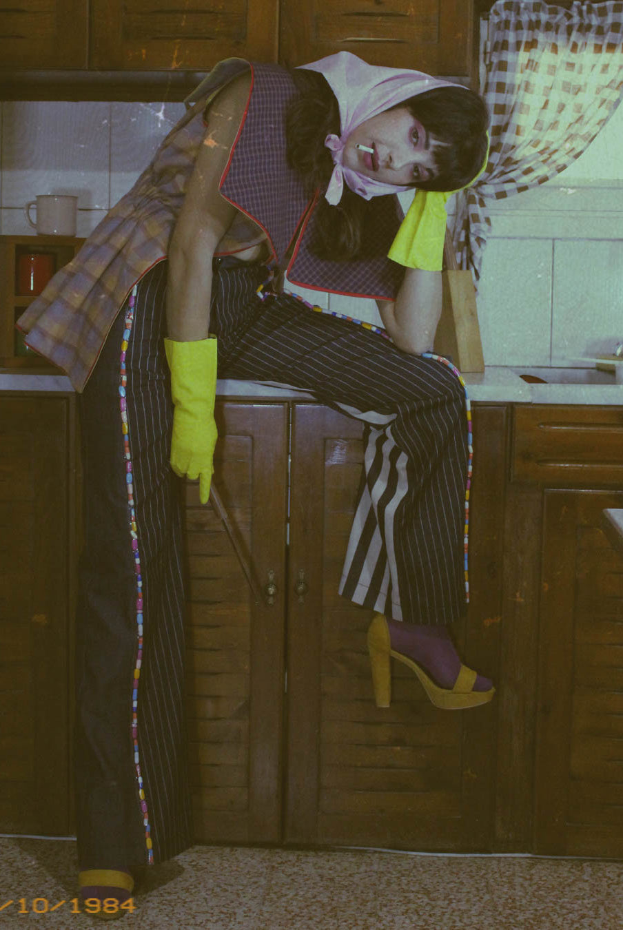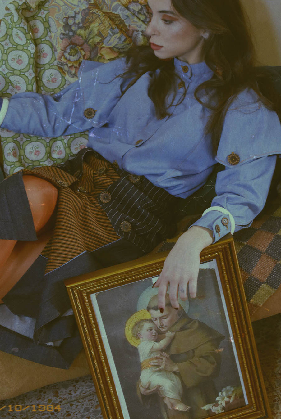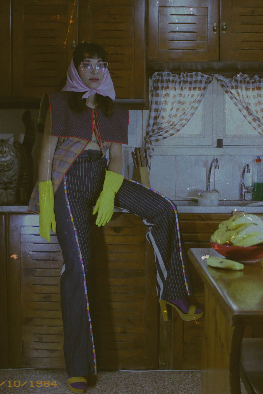 Titled ‘Dependence’, this collection was inspired by the Pedro Almodovar film, "What Have I Done to Deserve This?" The film revolves around Gloria, a housewife residing in a cramped apartment with her husband Antonio, mother-in-law, and two teenage sons. A family consumed by the pursuit of wealth, Gloria grapples with dependencies on money, pills, and cleanliness. In denim, poplin, pvc, and Jacquard, the collection vividly portrays Gloria's addictions, using contrasting fabrics in patchwork to highlight the dichotomy she faces in confronting the two sides of her struggles. The collection is adorned with lining hand-stuffed with colorful pills.