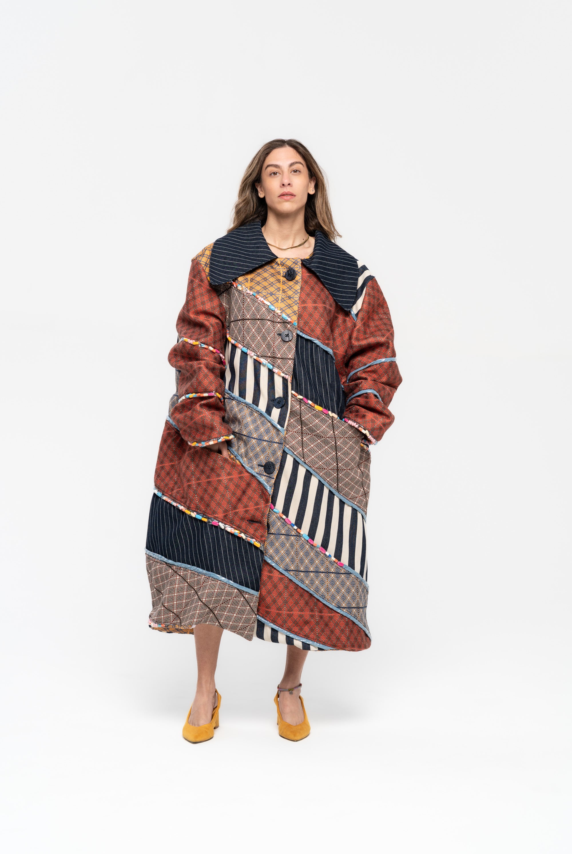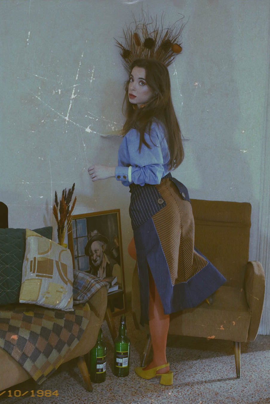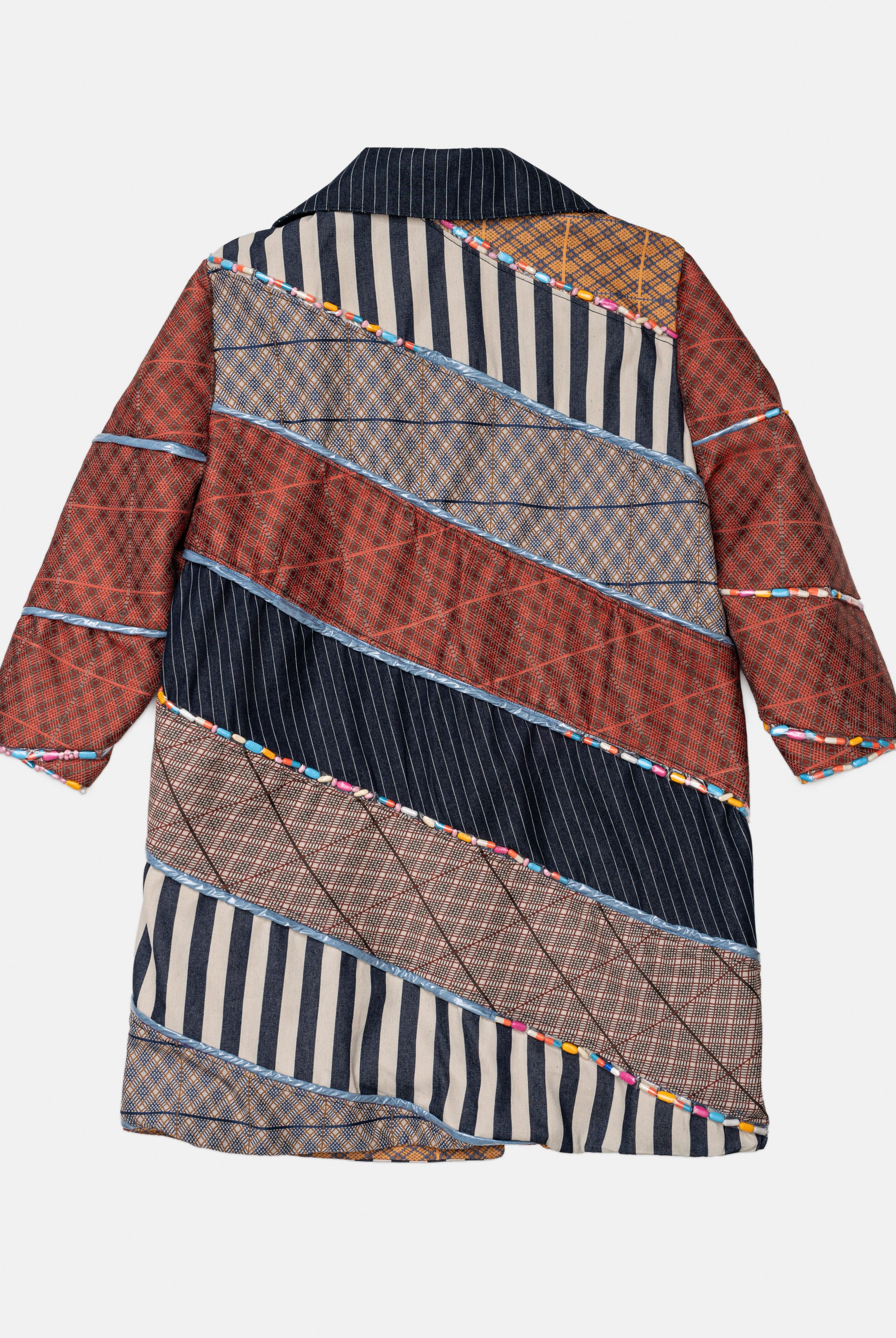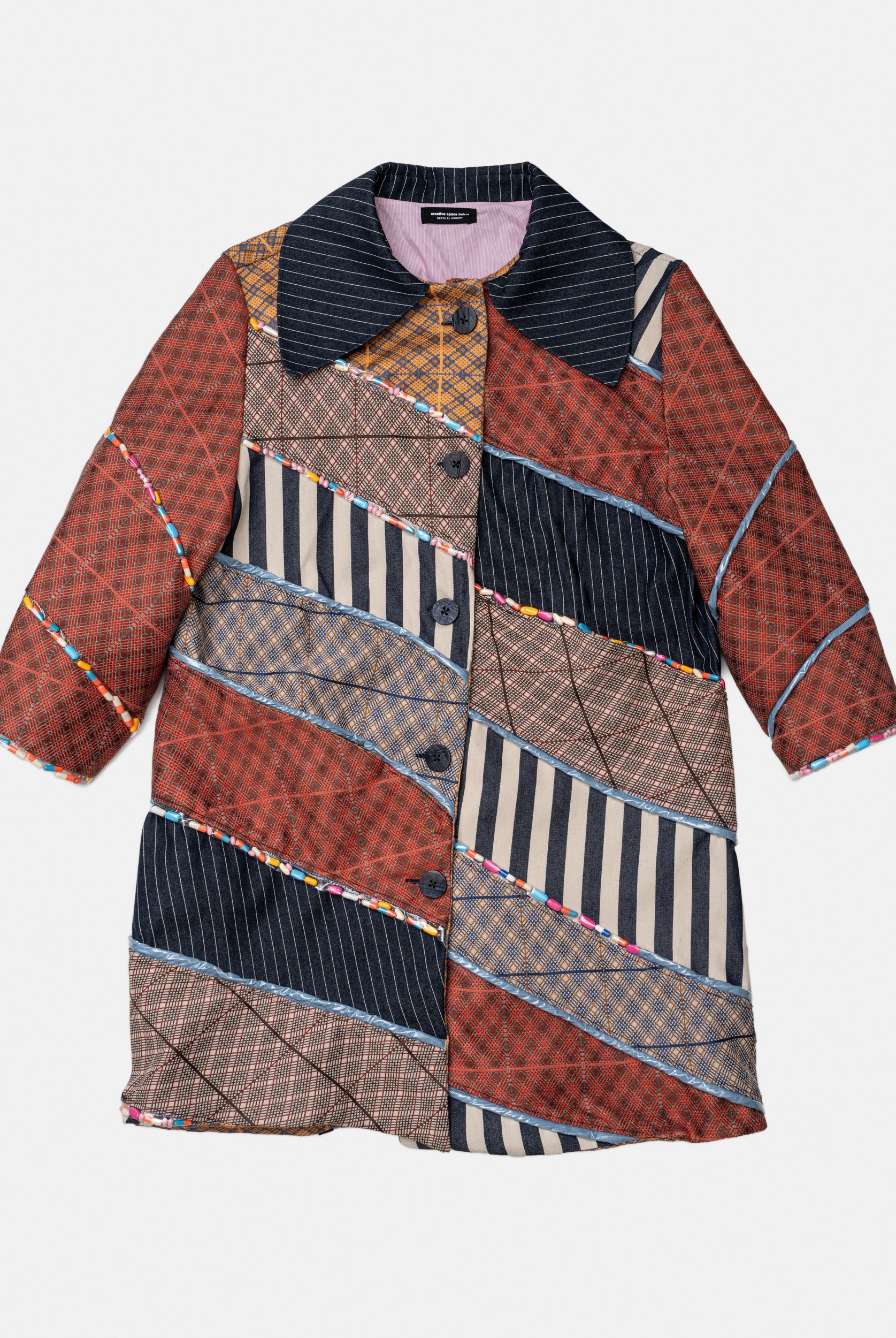 Titled ‘Dependence’, this collection was inspired by the Pedro Almodovar film, "What Have I Done to Deserve This?" The film revolves around Gloria, a housewife residing in a cramped apartment with her husband Antonio, mother-in-law, and two teenage sons. A family consumed by the pursuit of wealth, Gloria grapples with dependencies on money, pills, and cleanliness. In denim, poplin, pvc, and Jacquard, the collection vividly portrays Gloria's addictions, using contrasting fabrics in patchwork to highlight the dichotomy she faces in confronting the two sides of her struggles. The collection is adorned with lining hand-stuffed with colorful pills.