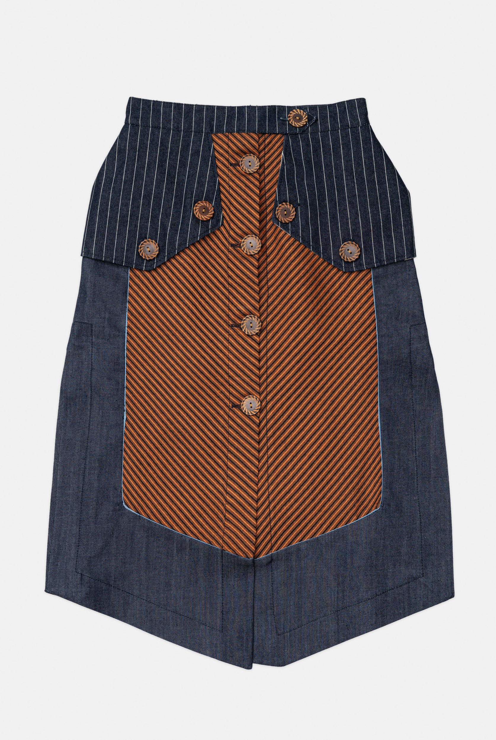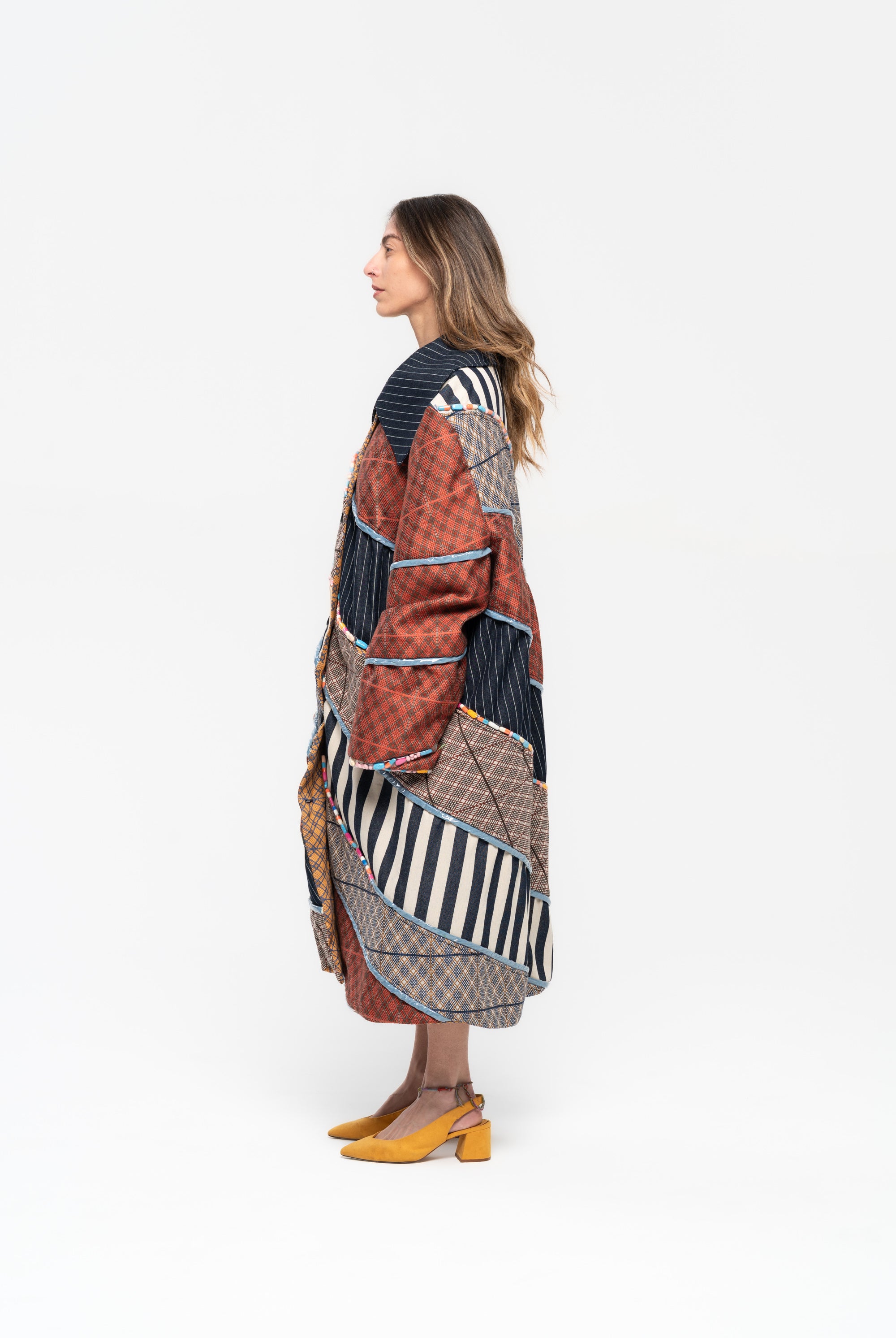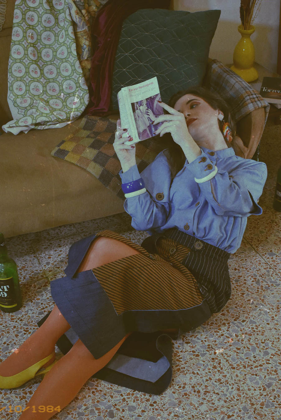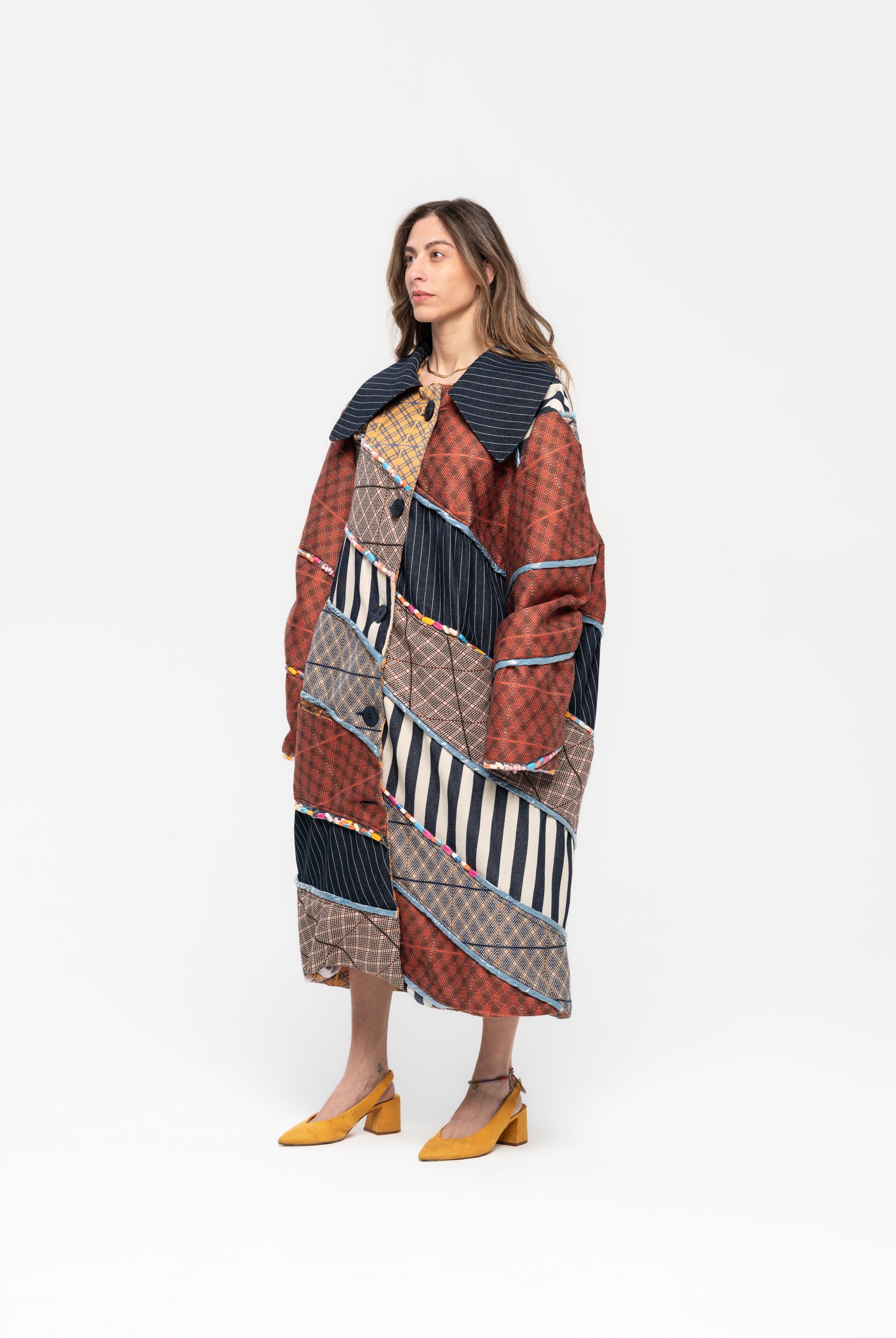 Titled ‘Dependence’, this collection was inspired by the Pedro Almodovar film, "What Have I Done to Deserve This?" The film revolves around Gloria, a housewife residing in a cramped apartment with her husband Antonio, mother-in-law, and two teenage sons. A family consumed by the pursuit of wealth, Gloria grapples with dependencies on money, pills, and cleanliness. In denim, poplin, pvc, and Jacquard, the collection vividly portrays Gloria's addictions, using contrasting fabrics in patchwork to highlight the dichotomy she faces in confronting the two sides of her struggles. The collection is adorned with lining hand-stuffed with colorful pills.