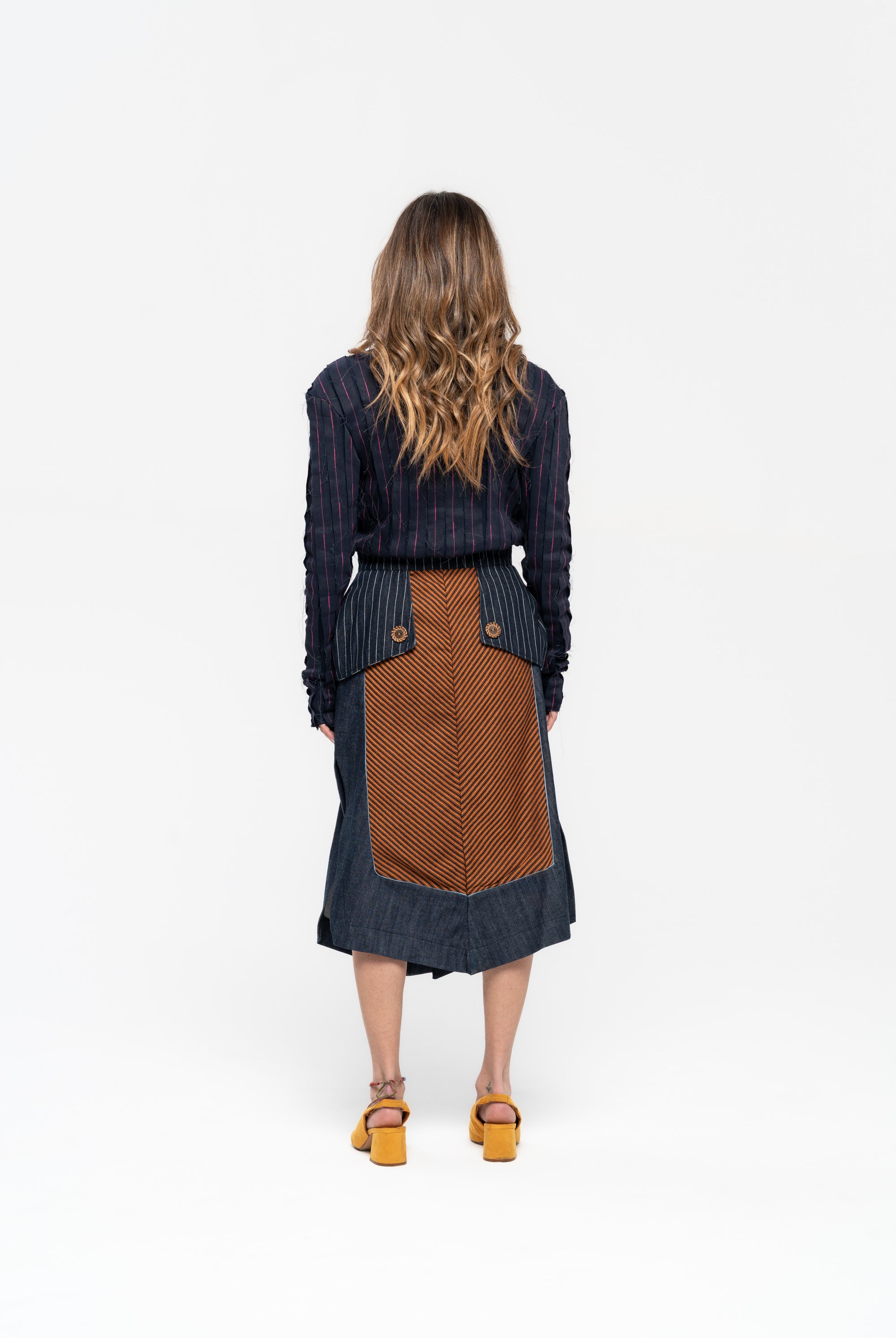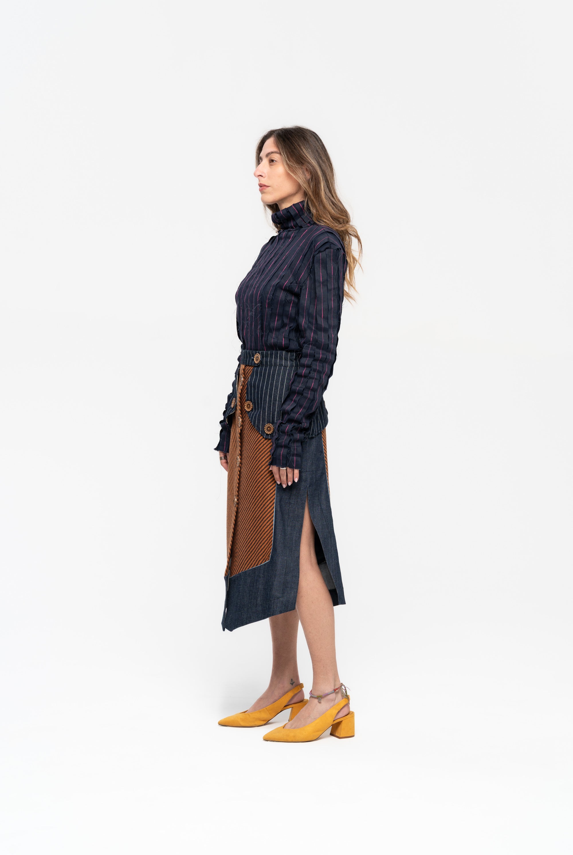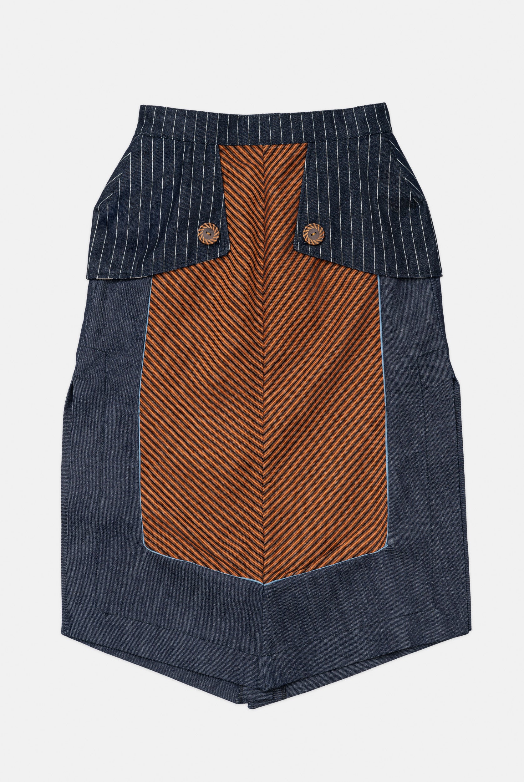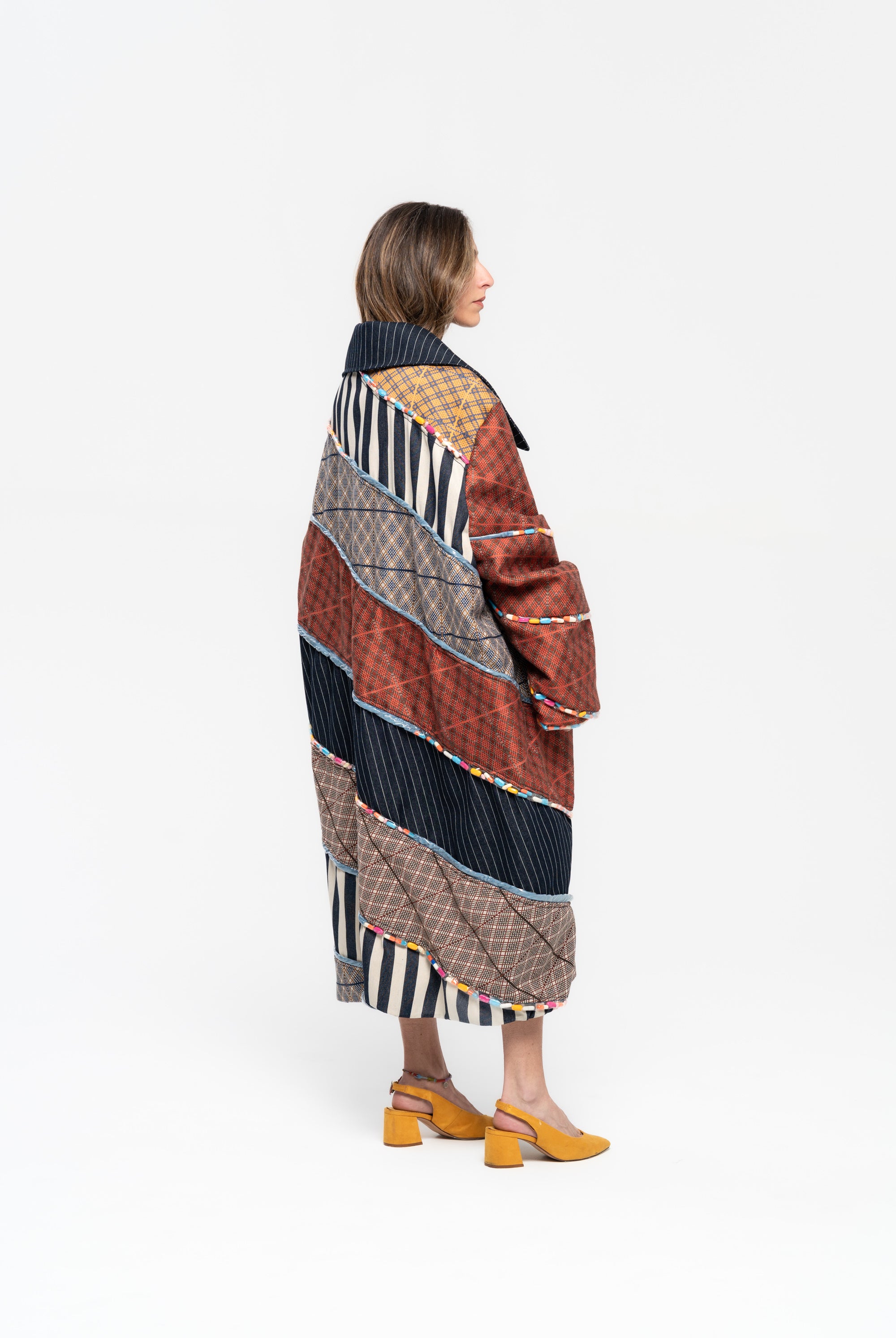 Titled ‘Dependence’, this collection was inspired by the Pedro Almodovar film, "What Have I Done to Deserve This?" The film revolves around Gloria, a housewife residing in a cramped apartment with her husband Antonio, mother-in-law, and two teenage sons. A family consumed by the pursuit of wealth, Gloria grapples with dependencies on money, pills, and cleanliness. In denim, poplin, pvc, and Jacquard, the collection vividly portrays Gloria's addictions, using contrasting fabrics in patchwork to highlight the dichotomy she faces in confronting the two sides of her struggles. The collection is adorned with lining hand-stuffed with colorful pills.