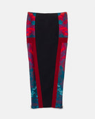 Maxi pencil skirt with cuts featuring digitally printed fabric, burgundy silk fabric, and black cotton