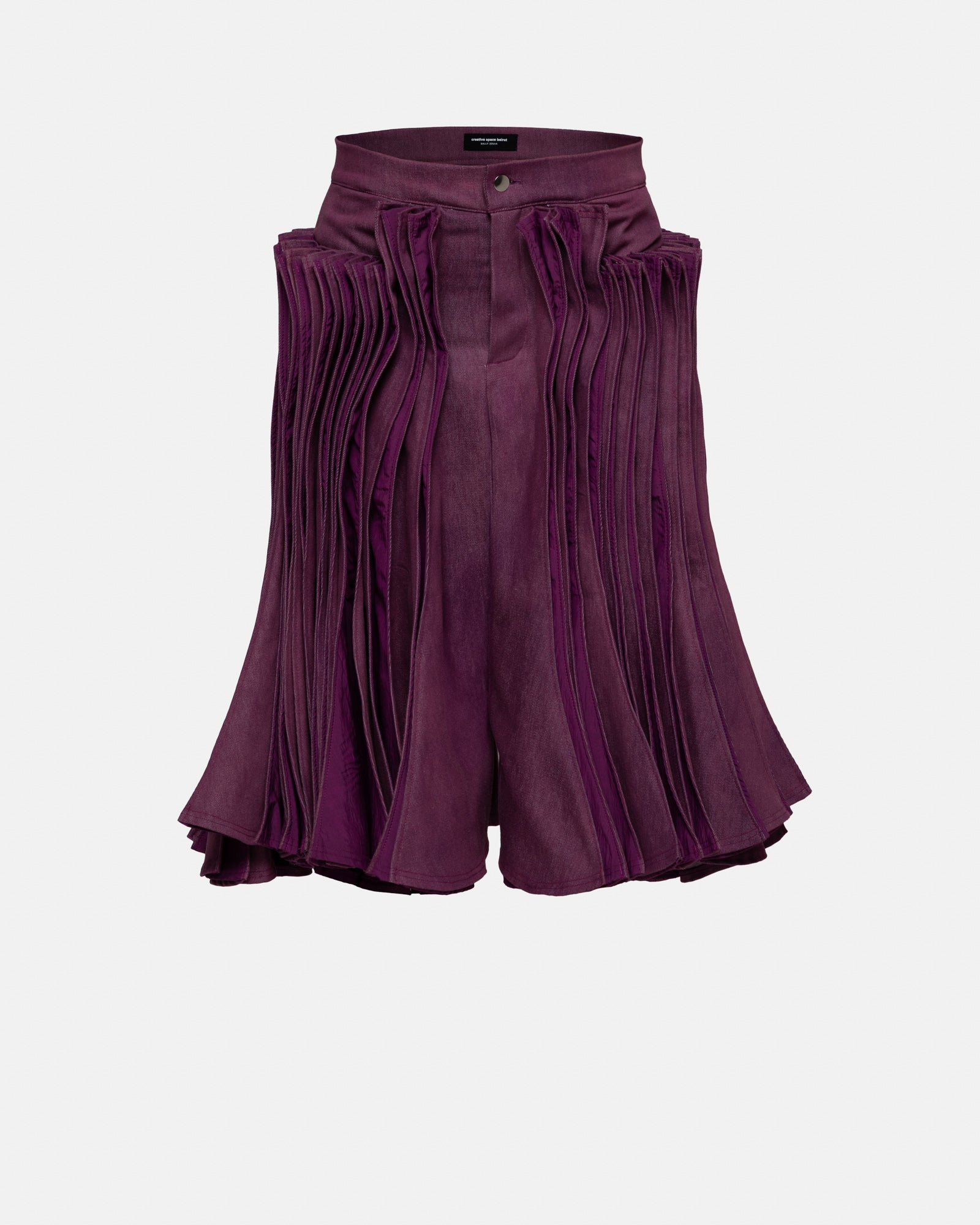 Midi denim and nylon skirt with extruding pleats at the front. Featuring denim out-panels, nylon inner panels and an attached under short.