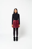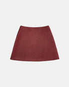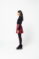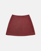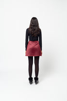 A straight cut miniskirt in a black splashed red satin.