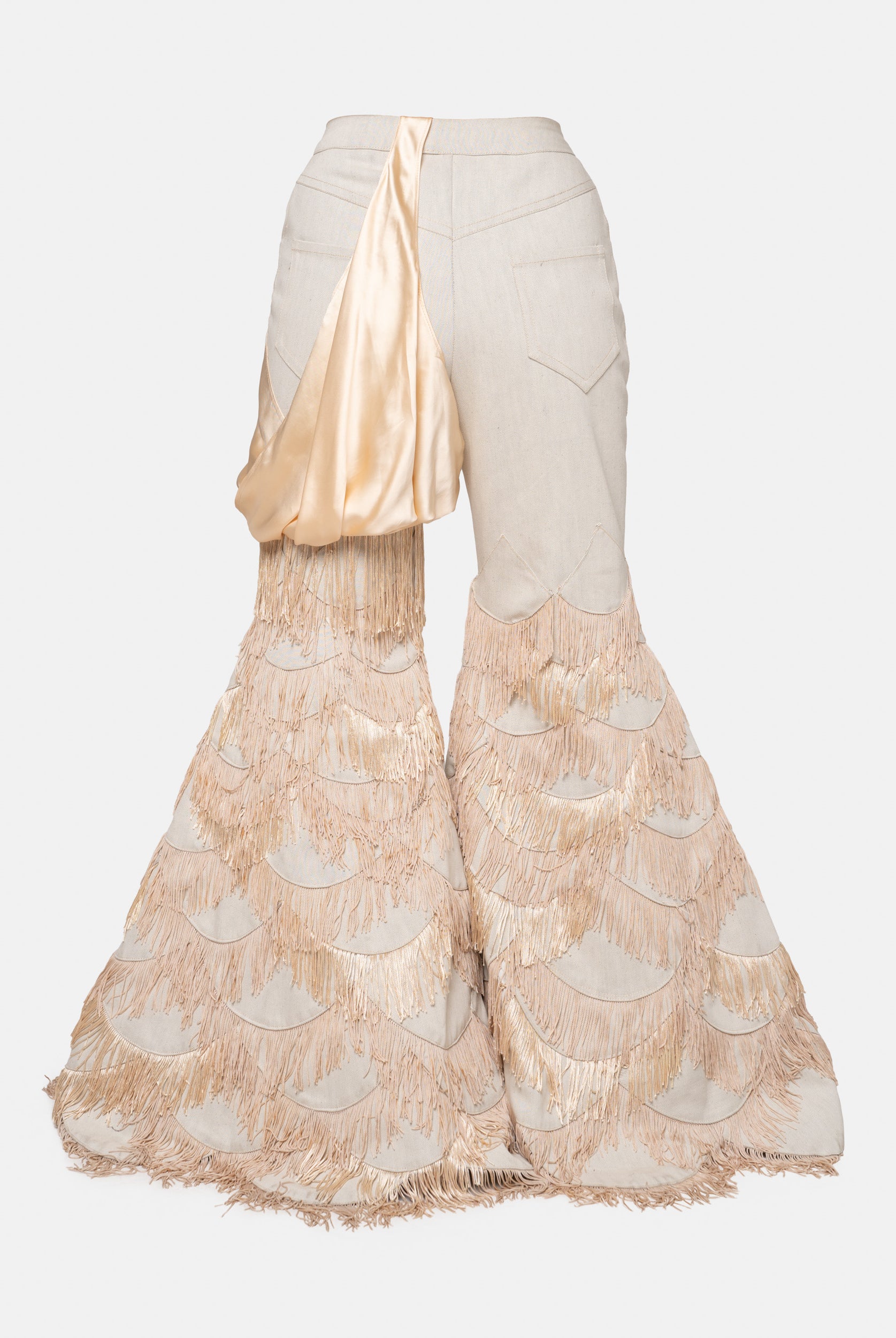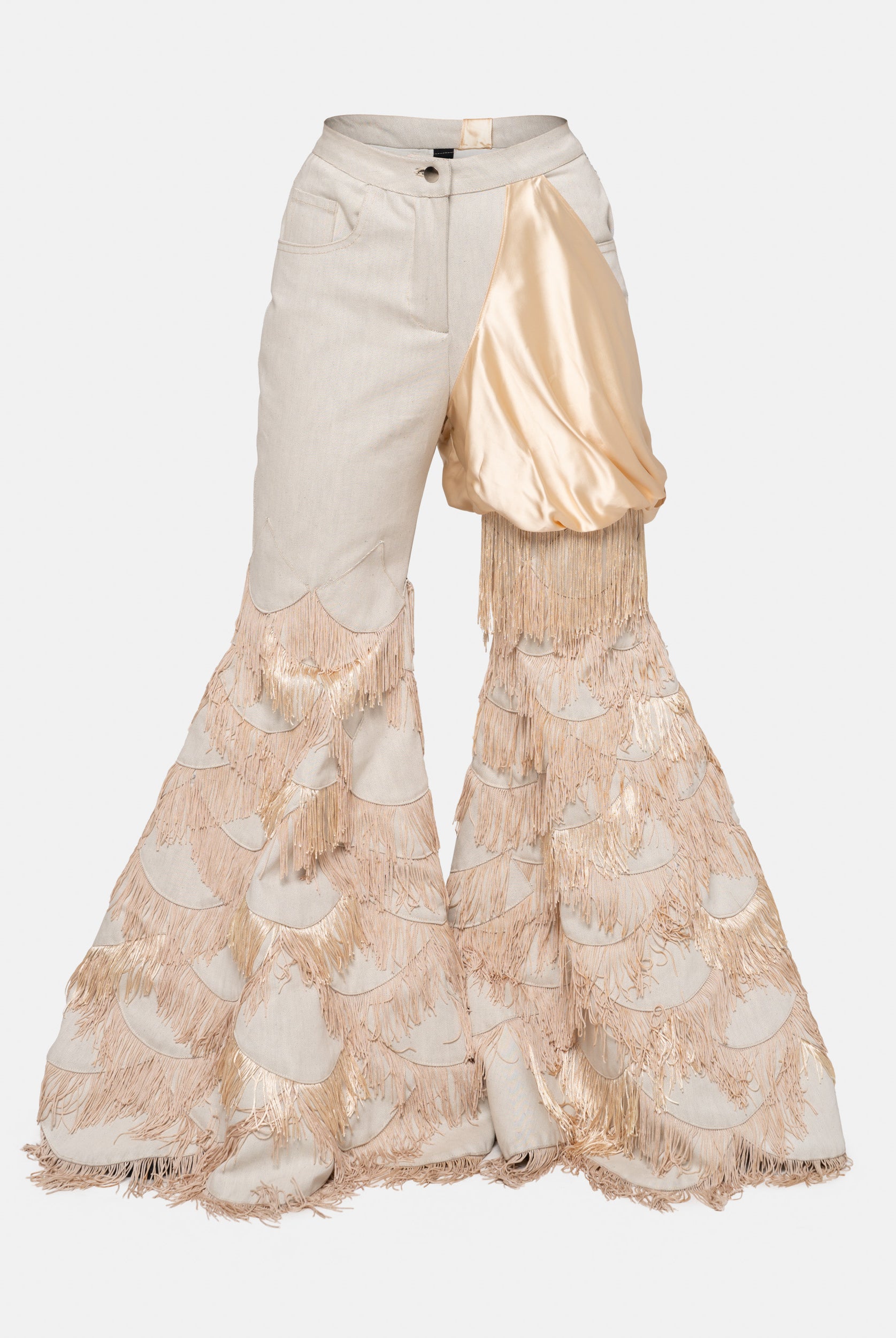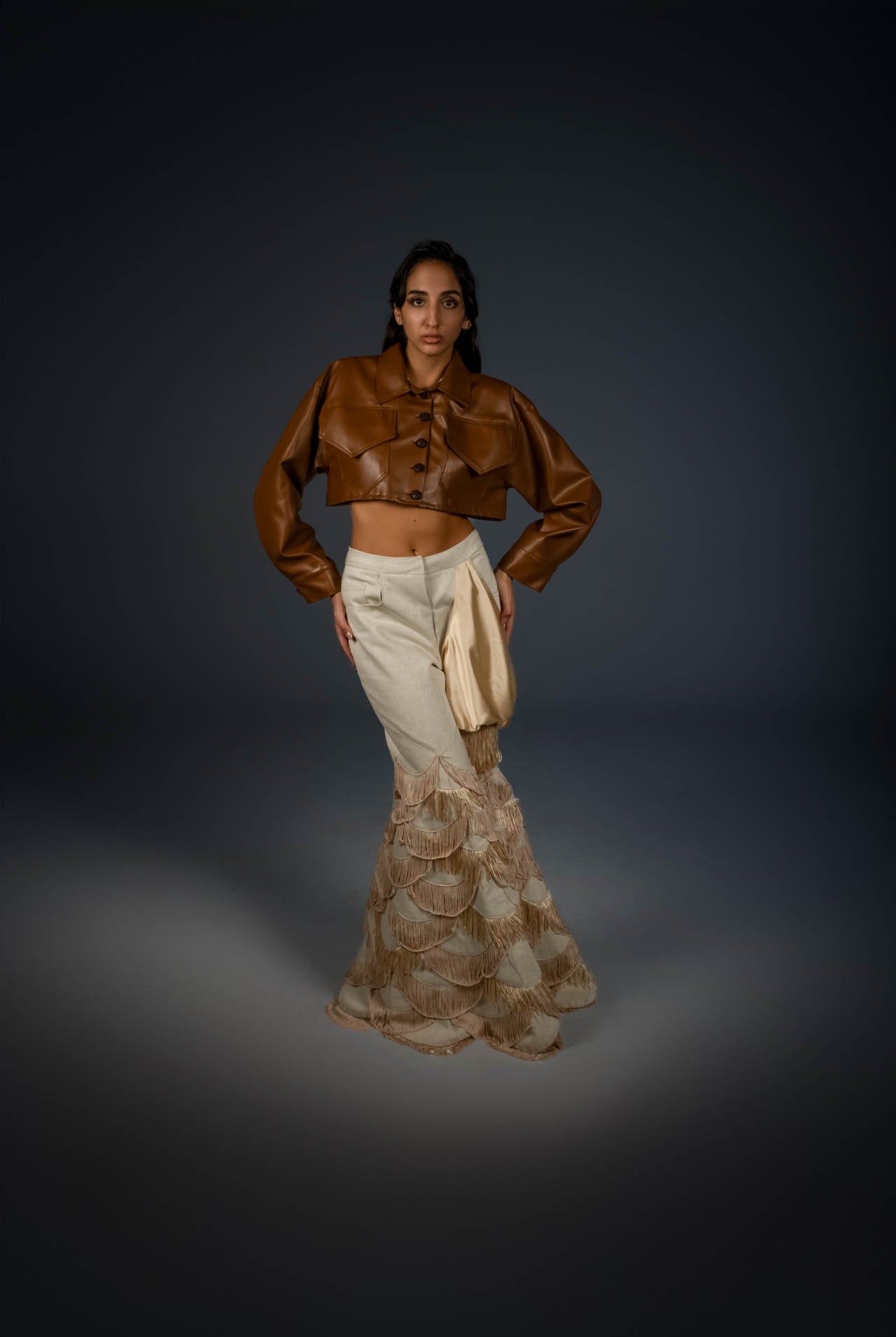Driven by the exhilaration of discovering the essence of the "she" in each piece, this collection, titled ‘Is She There?’, draws inspiration from the Spanish movie "Broken Embraces" by Almodóvar. The film vividly illustrates the reality of the adage "love is blind." Centered around two lovers, a director and an actress, who attempt to escape their troubles but find themselves in a car crash, the narrative unfolds with the director losing his two most cherished possessions: his love and his sight. The pivotal question posed after losing his sight was, "Is she there?" The collection, designed predominantly in poplin, satin, and chiffon, offers a muted color palette of black, white, beige, and brown, and is animated with techniques such as beading, patchwork, draping and dyeing.