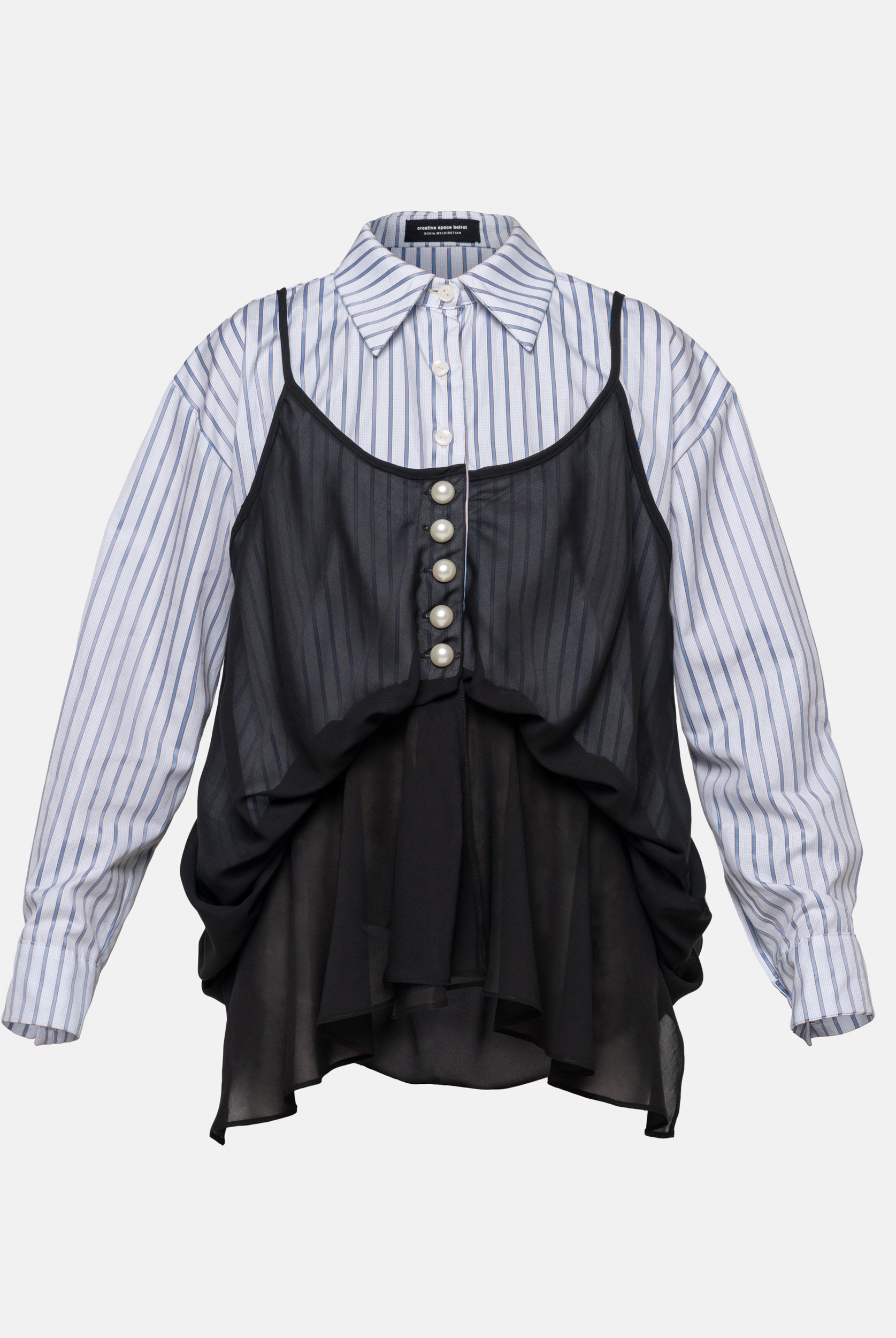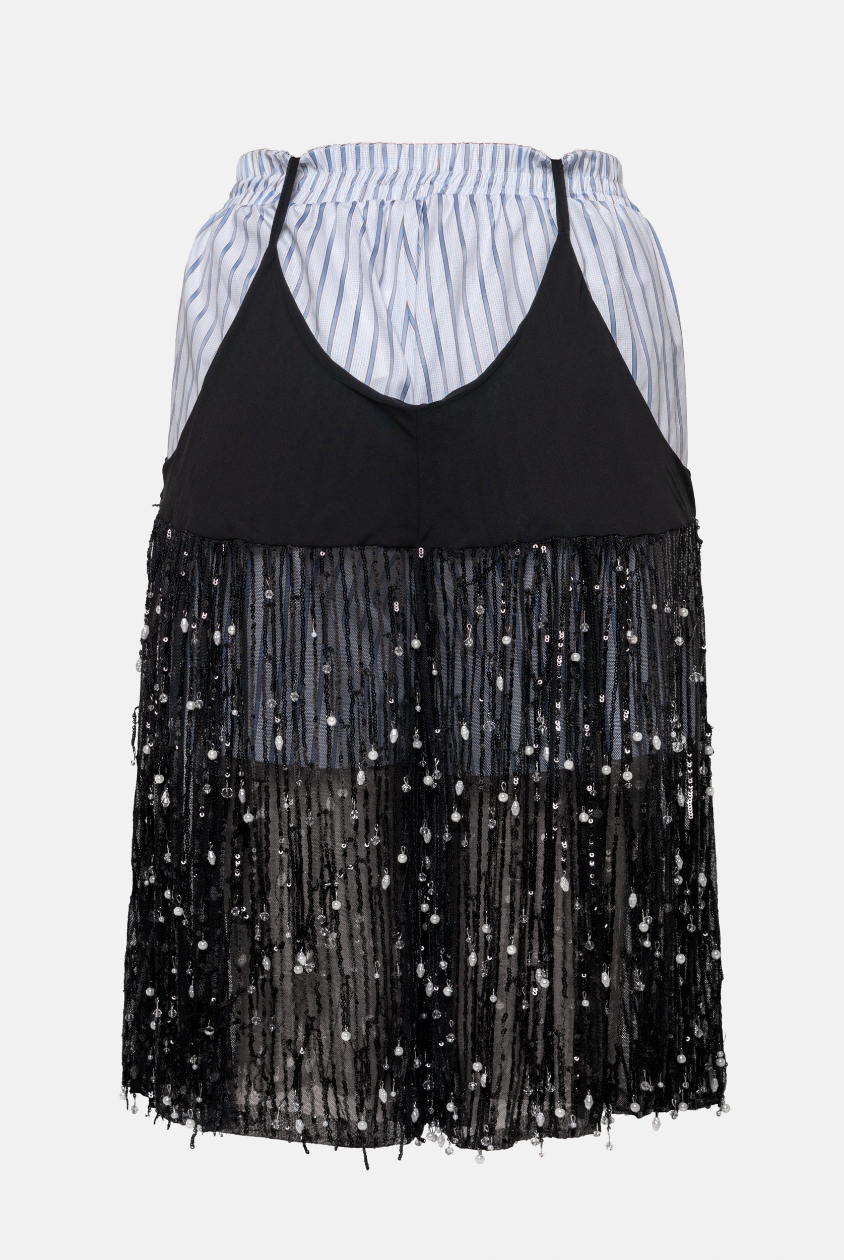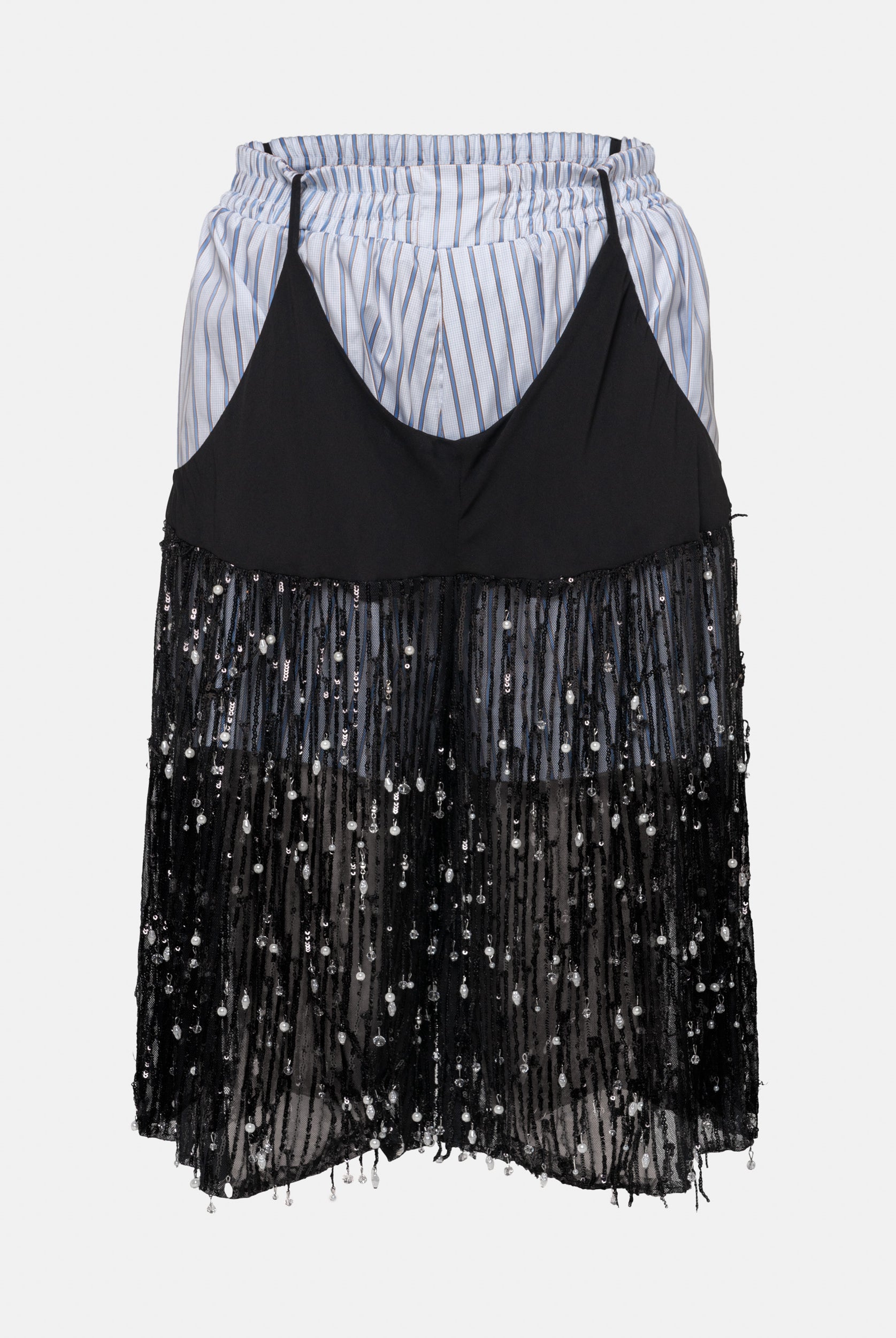 Driven by the exhilaration of discovering the essence of the "she" in each piece, this collection, titled ‘Is She There?’, draws inspiration from the Spanish movie "Broken Embraces" by Almodóvar. The film vividly illustrates the reality of the adage "love is blind." Centered around two lovers, a director and an actress, who attempt to escape their troubles but find themselves in a car crash, the narrative unfolds with the director losing his two most cherished possessions: his love and his sight. The pivotal question posed after losing his sight was, "Is she there?" The collection, designed predominantly in poplin, satin, and chiffon, offers a muted color palette of black, white, beige, and brown, and is animated with techniques such as beading, patchwork, draping and dyeing.