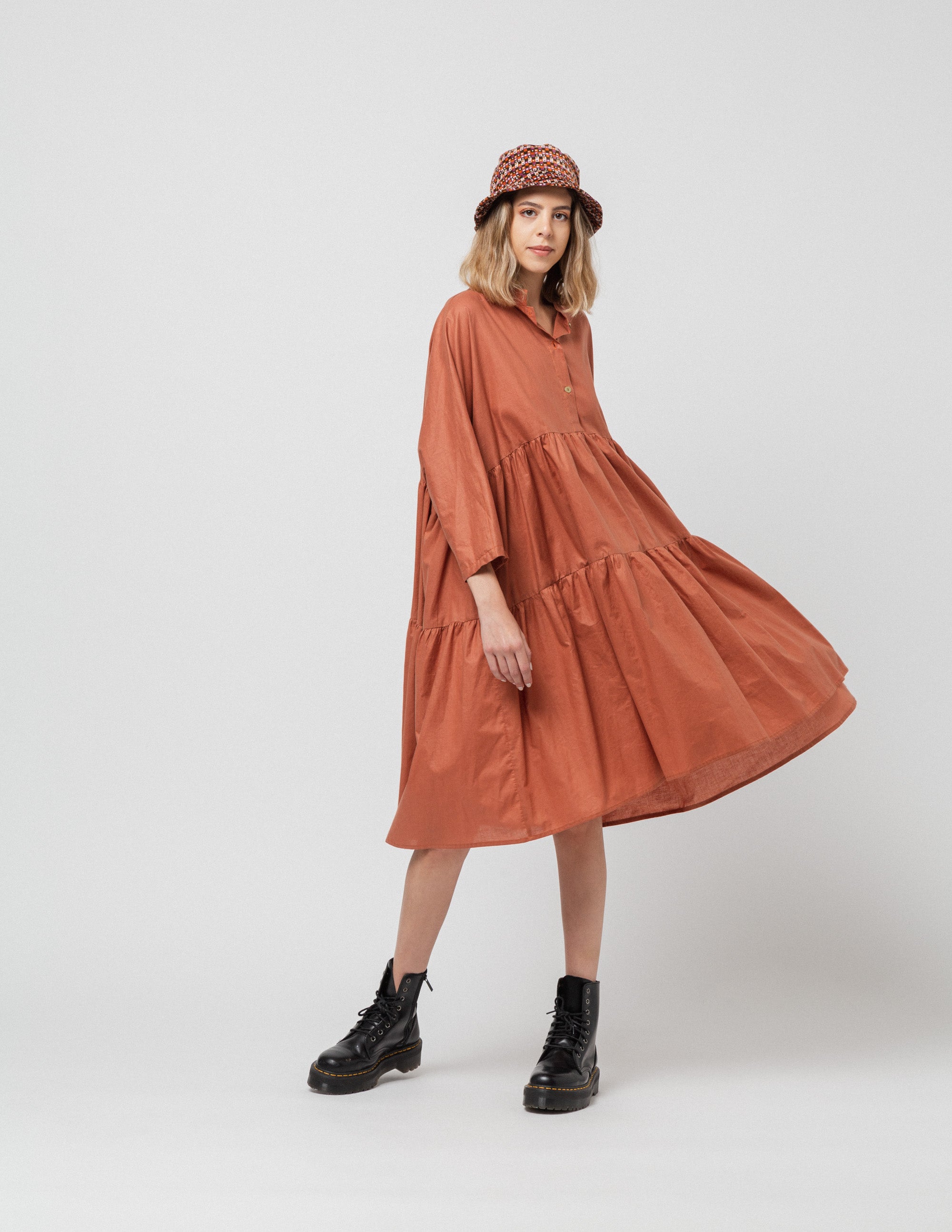 The Two Ruffle Long Dress in a brick-colored cotton features two-tiered layers and a mandarin collar.