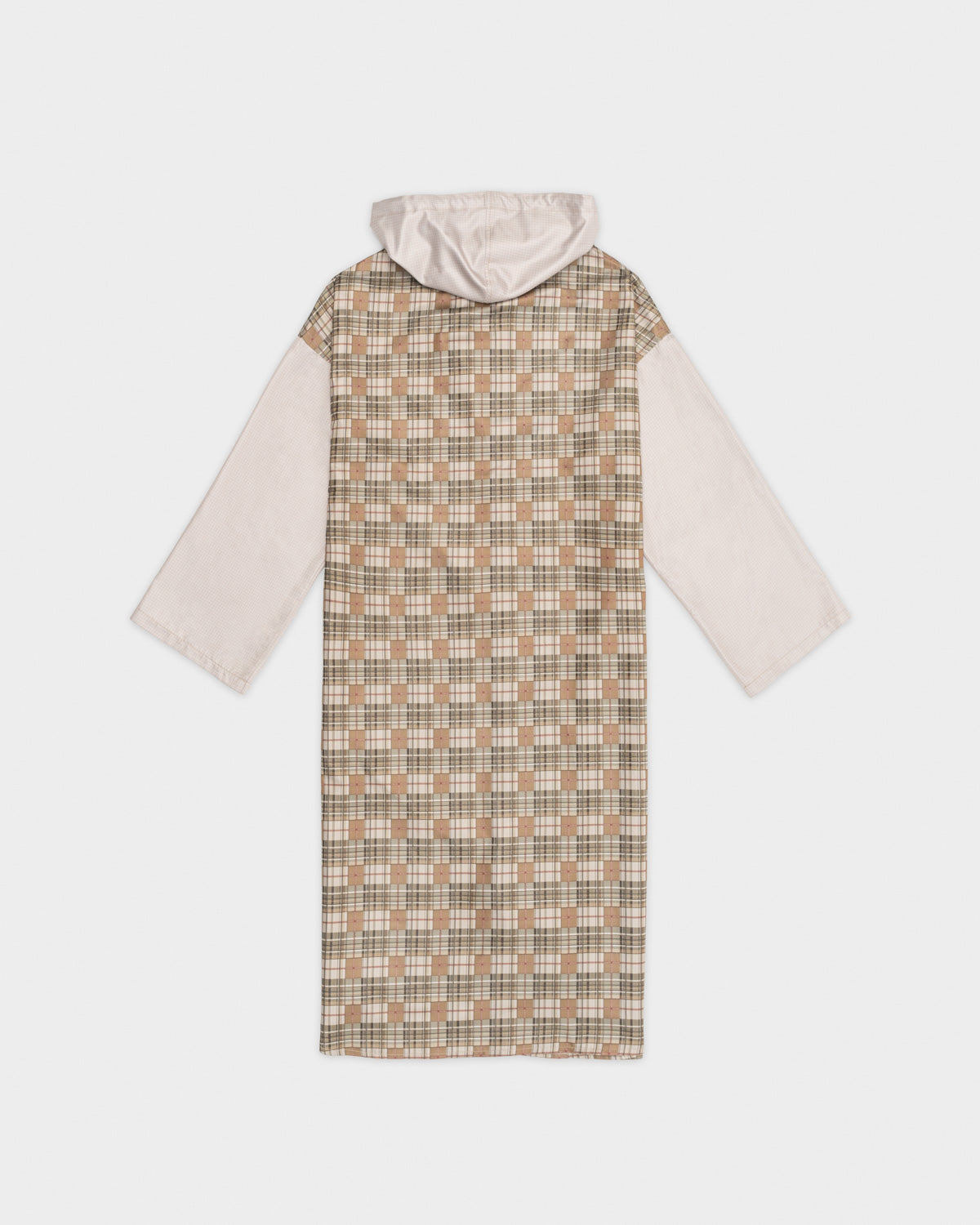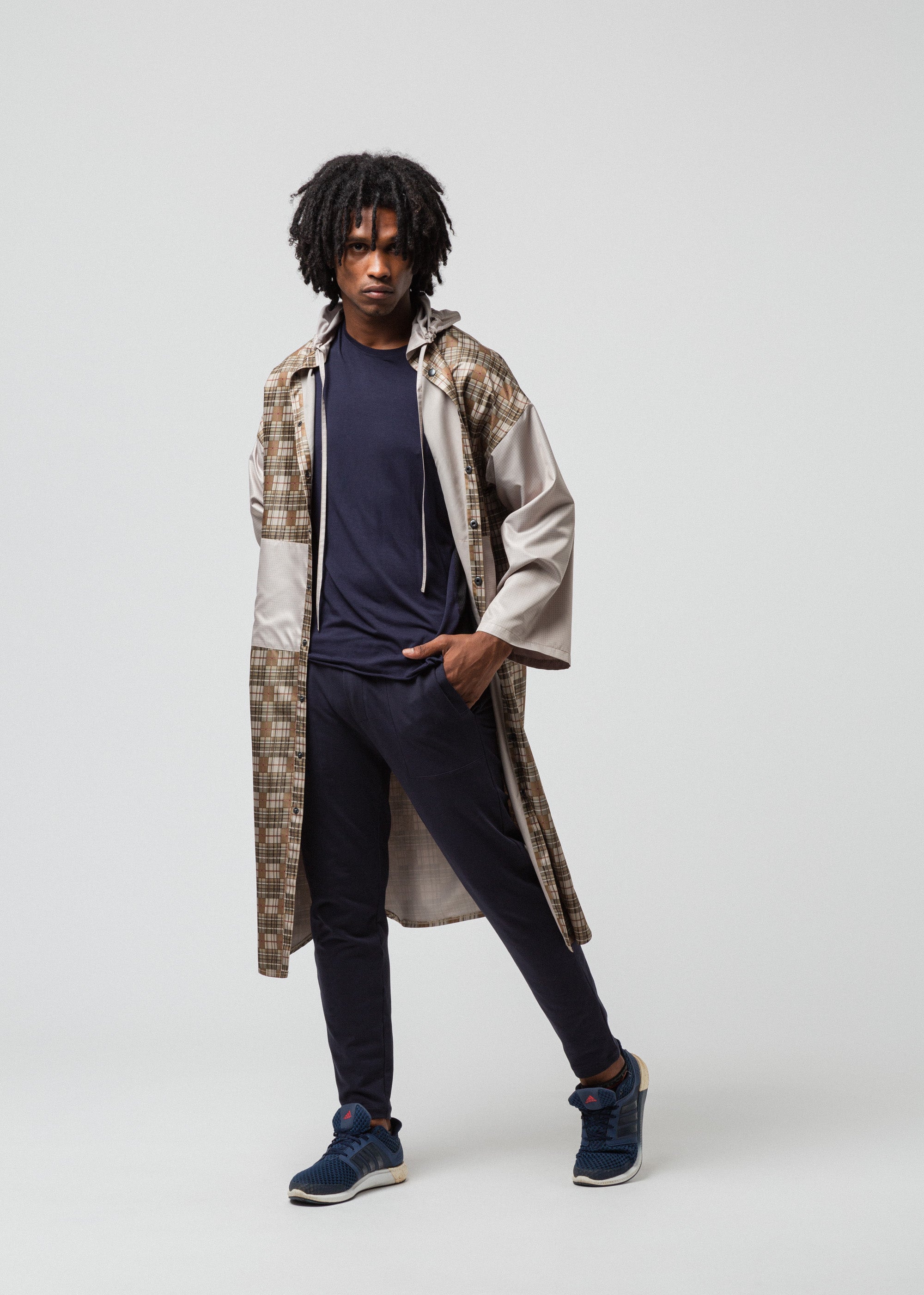 Two-tone button-down nylon jacket with side zipper slits, sideways pockets, and three-quarter sleeves.