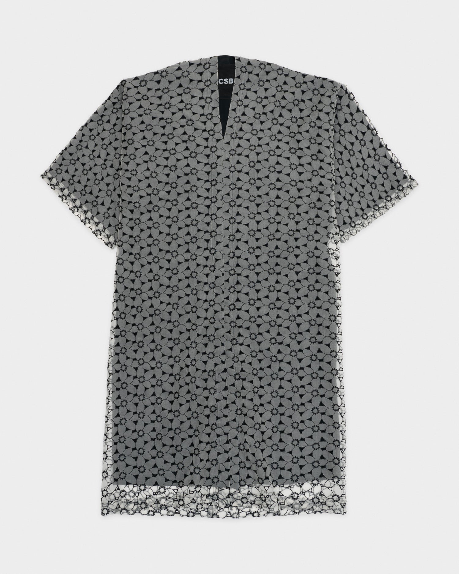 The Flower Caftan has an embroidered organza floral exterior, and black, silk lining.