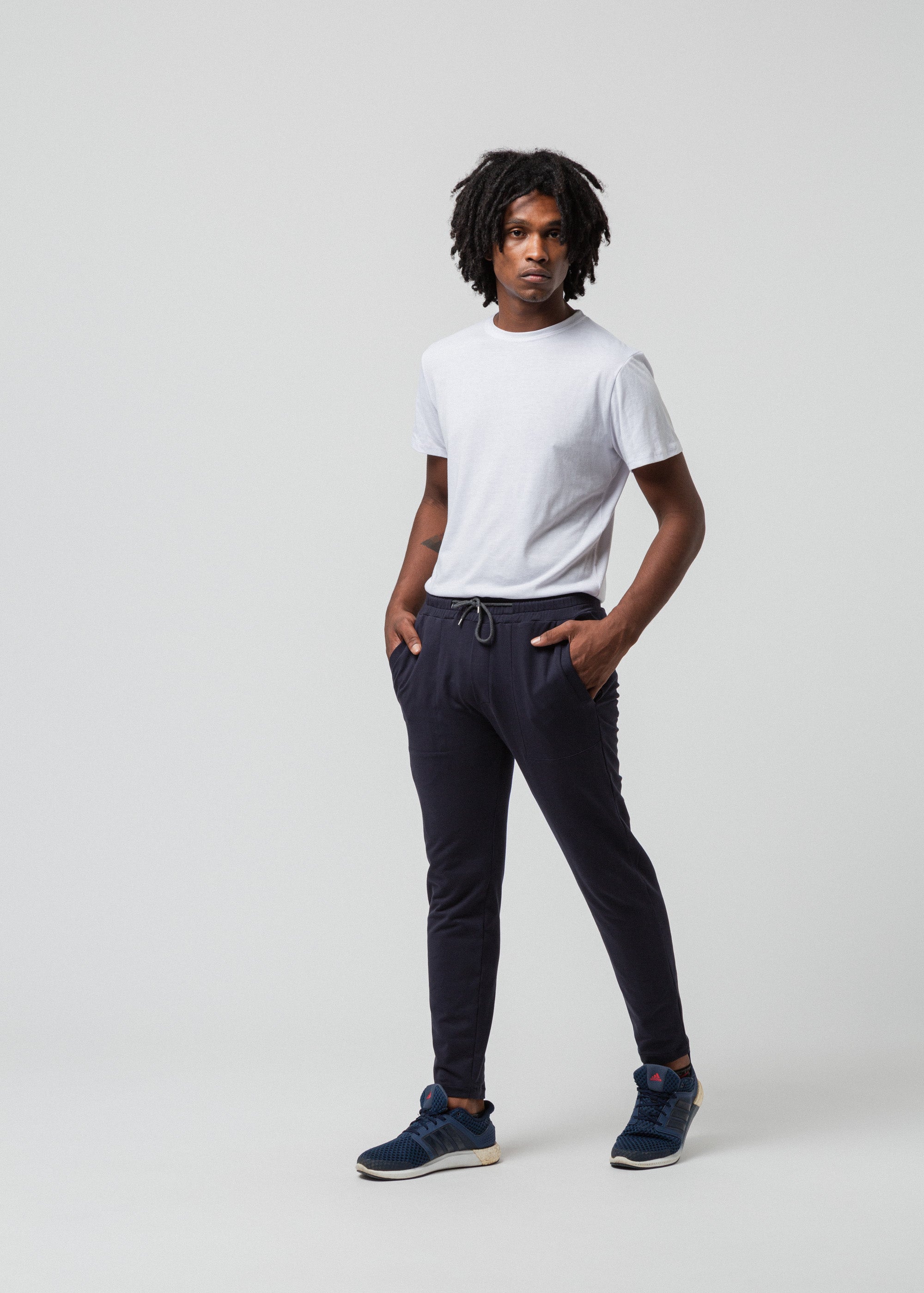 Classic navy sweatpants with a drawstring waistline.