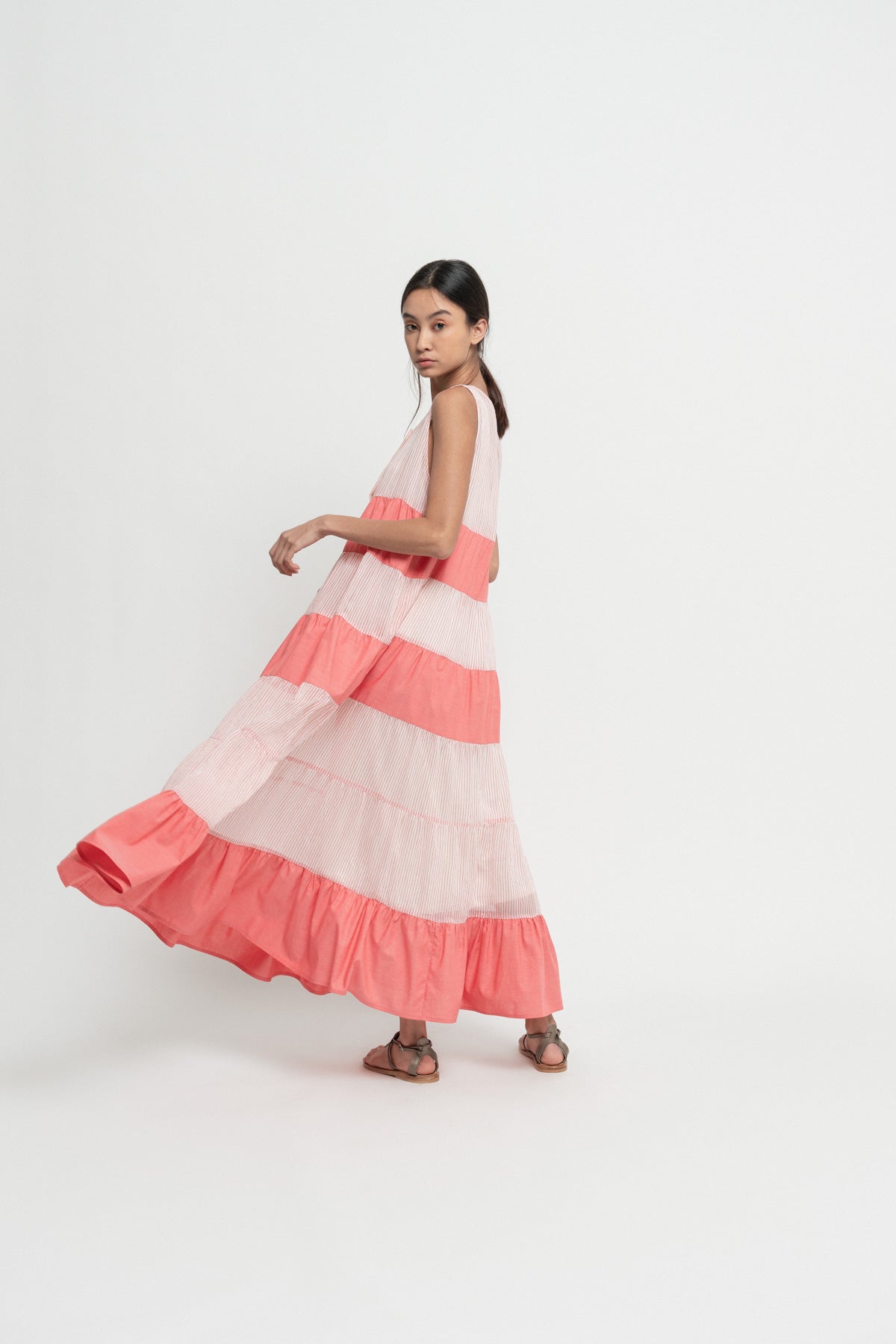 Breezy cotton, full-length sleeveless dress. Pink-red tiered and flared at the mid-calf with partial front button placket and U-neck.