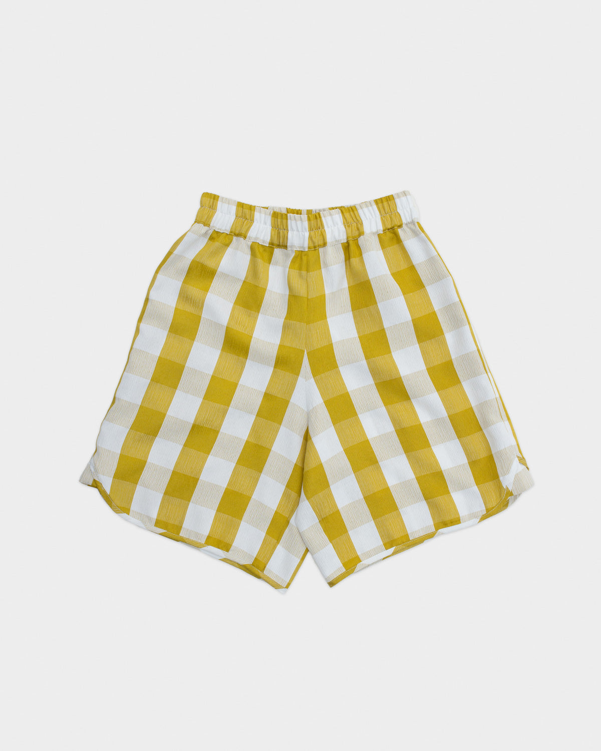Loose yellow and white gingham mid-thigh length shorts with an elastic waist, back patch pocket and curved hem.