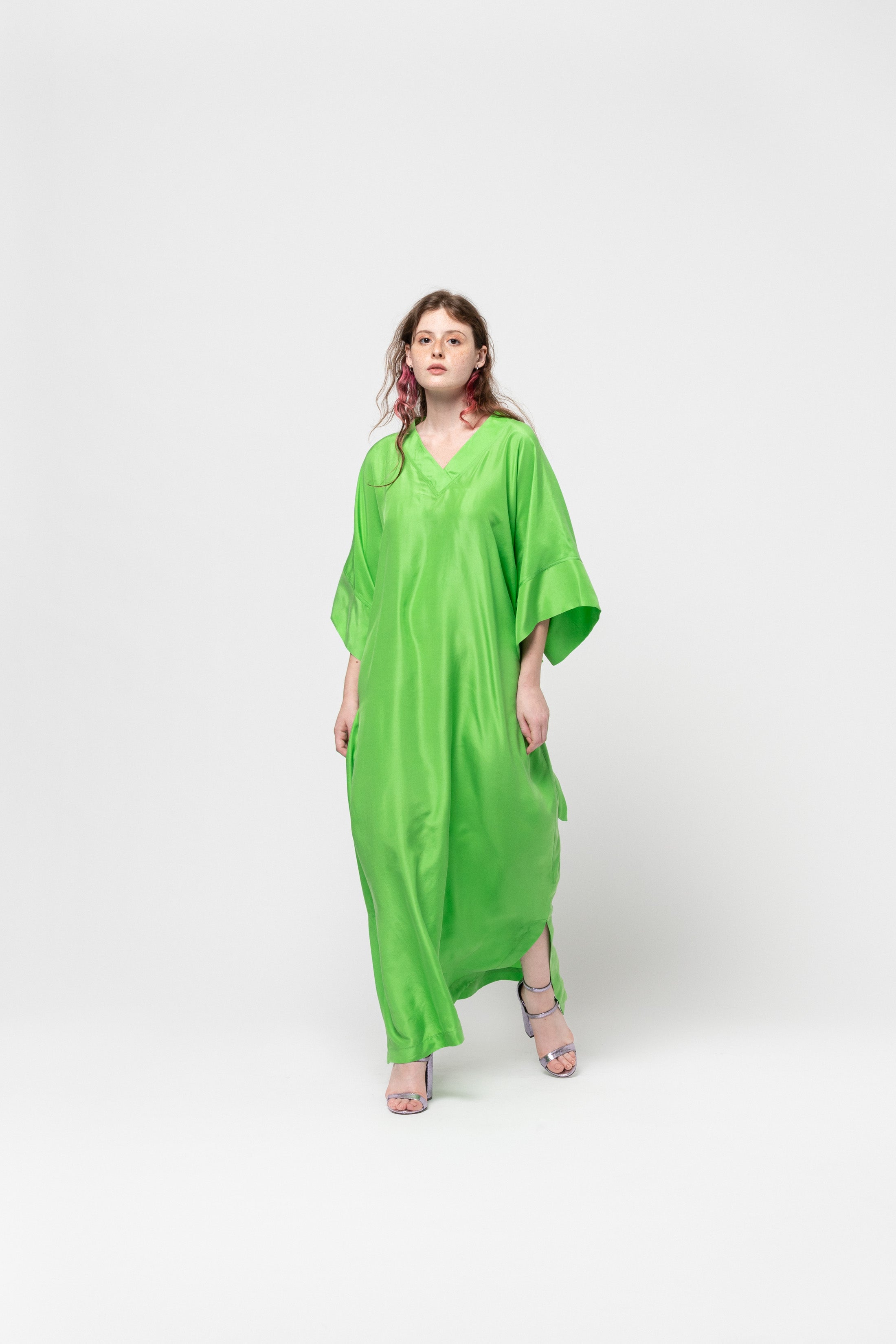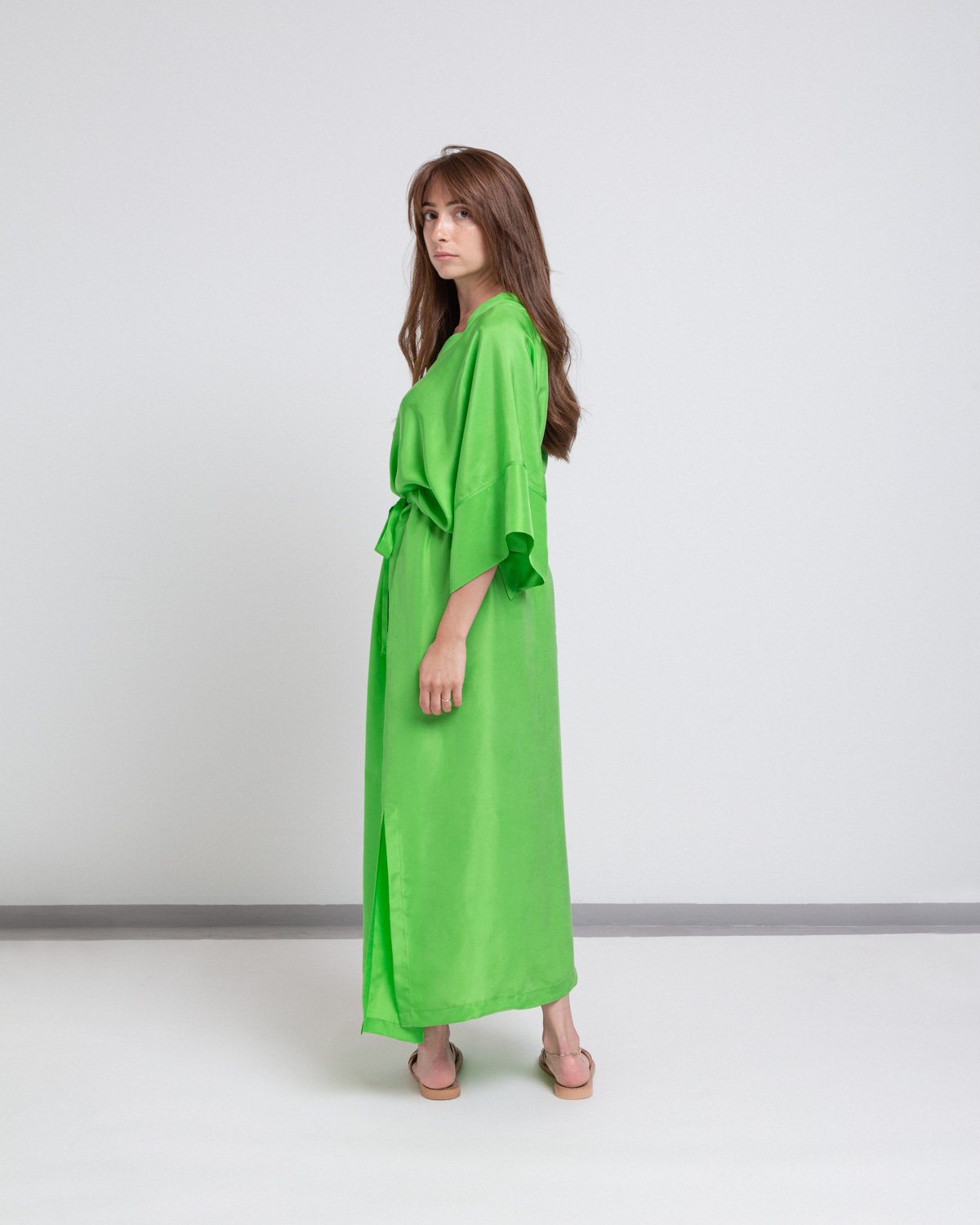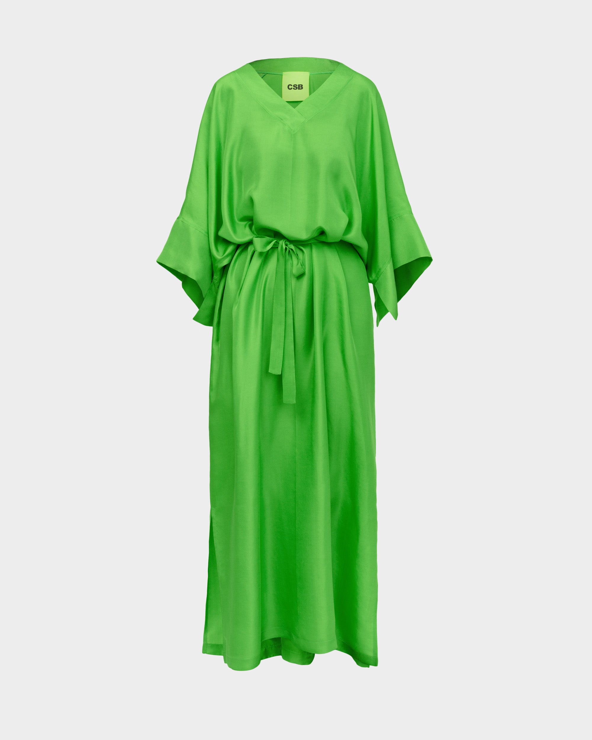 Full length, flowy V-neck dress in bright green silk with an adjustable waistline and loose sleeves.