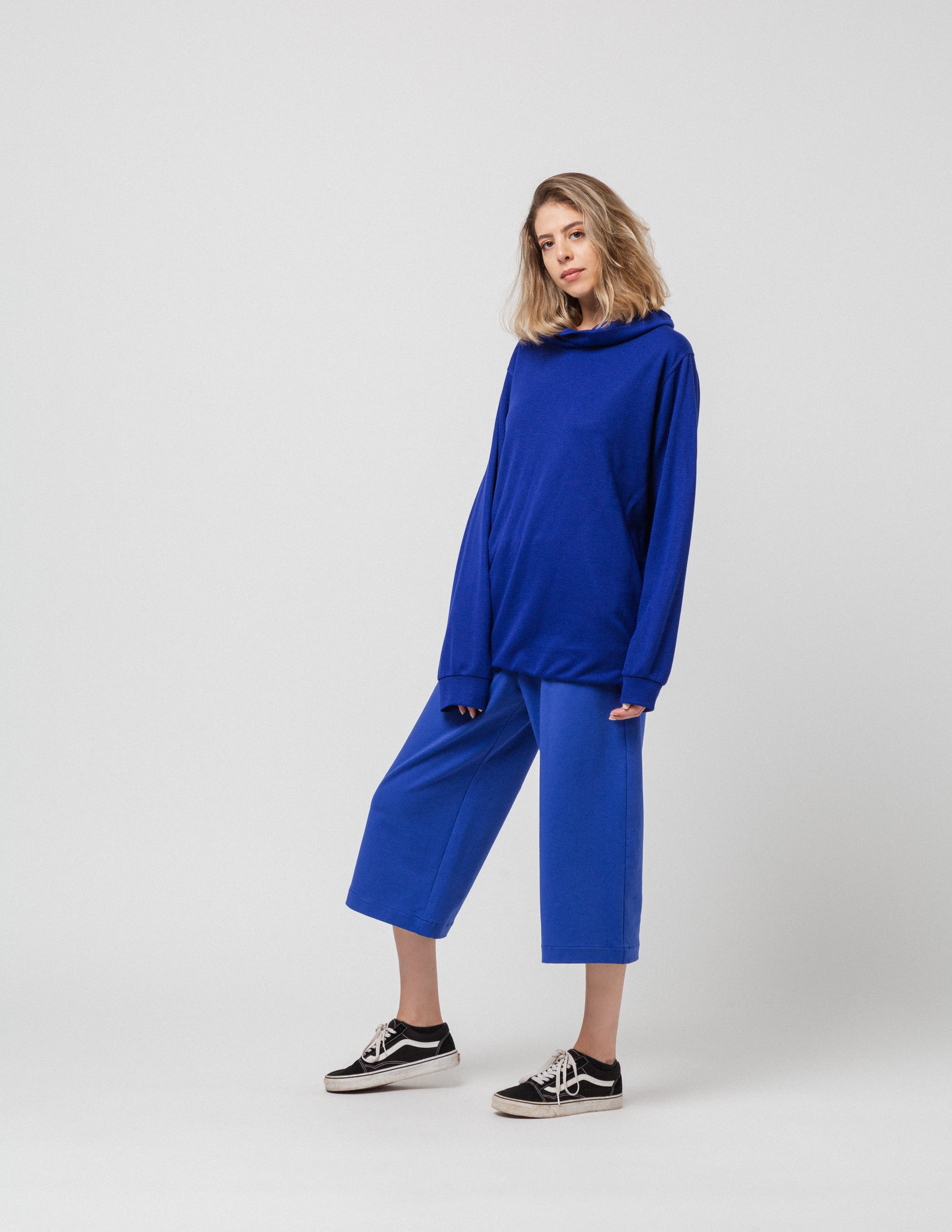 Electric blue, wide-legged, ankle-length sweatpants in cotton jersey.