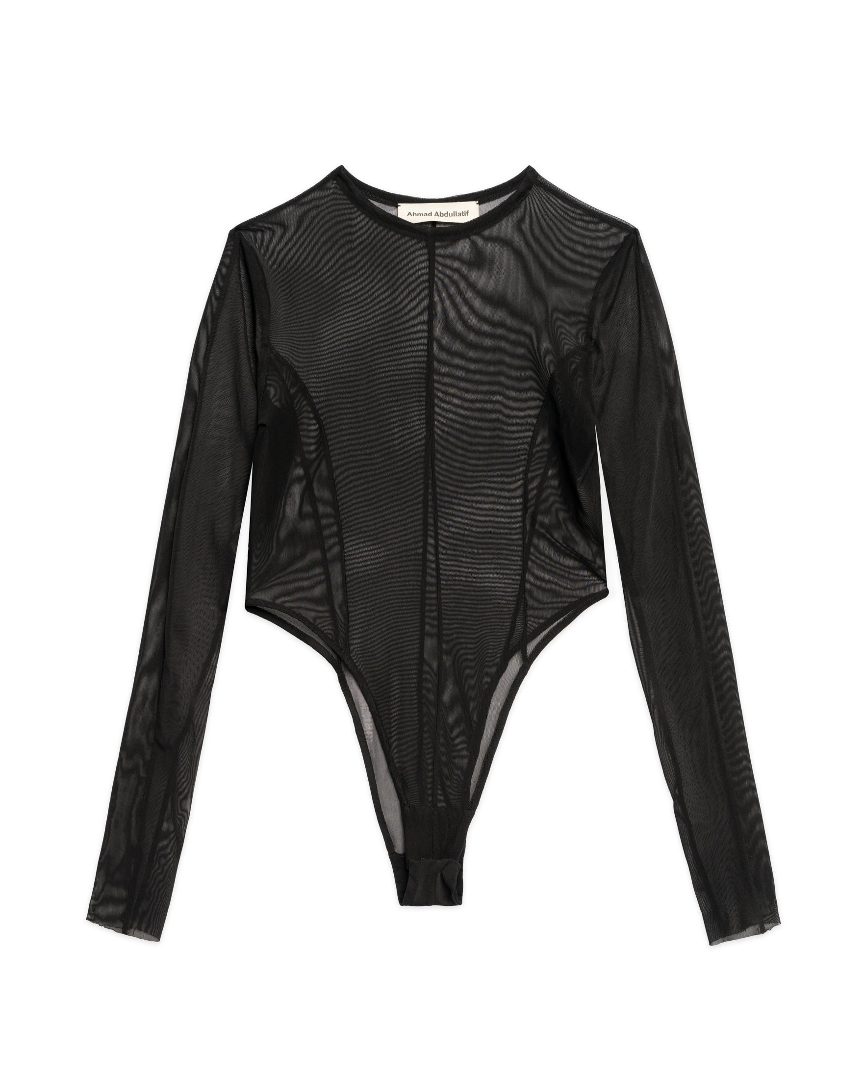 Black Powernet bodysuit with sheer panels, two-piece sleeves, and princess seams.