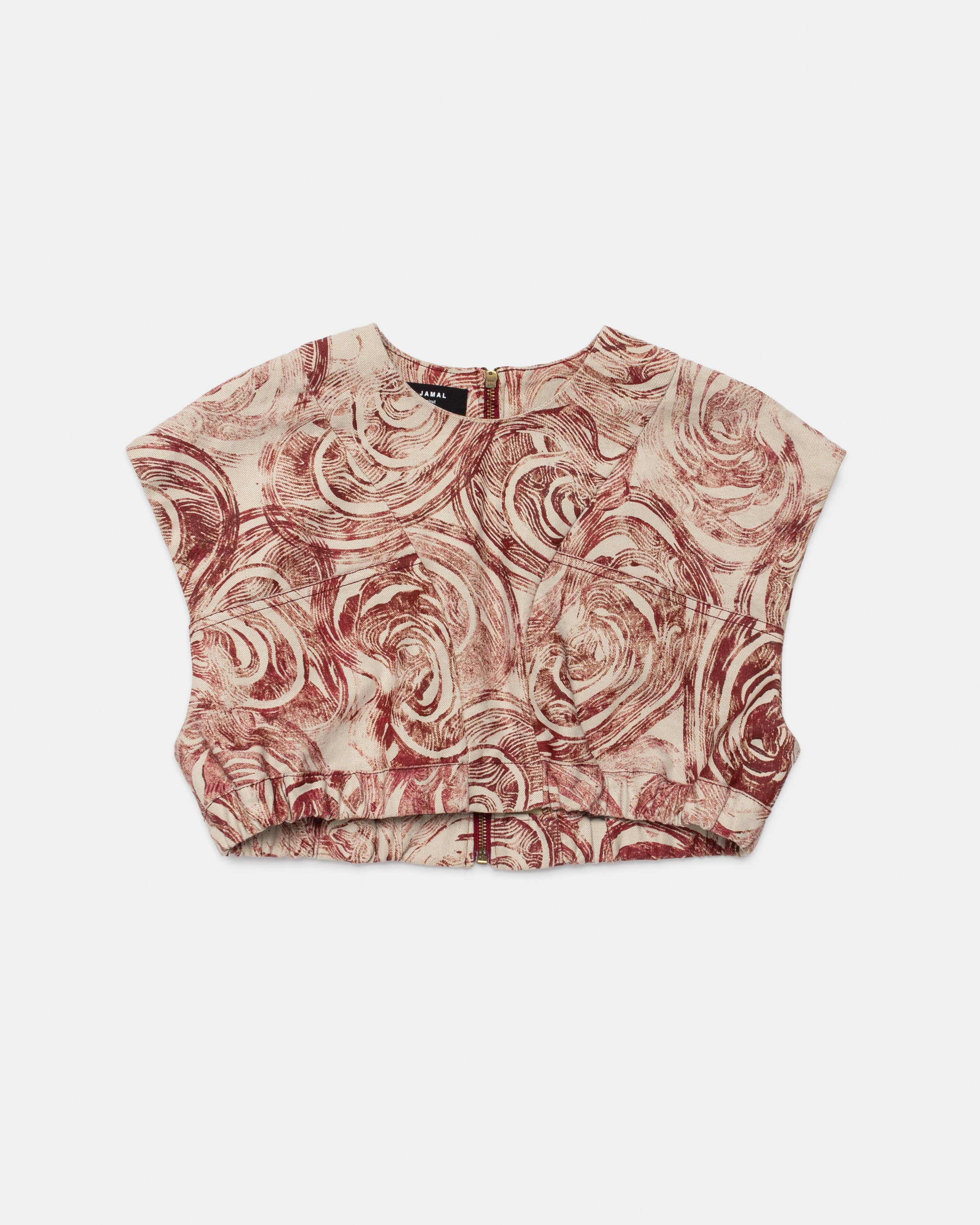 Block-printed denim crop top featuring two front pockets, cuts, an elastic hem and a zipper in the back.