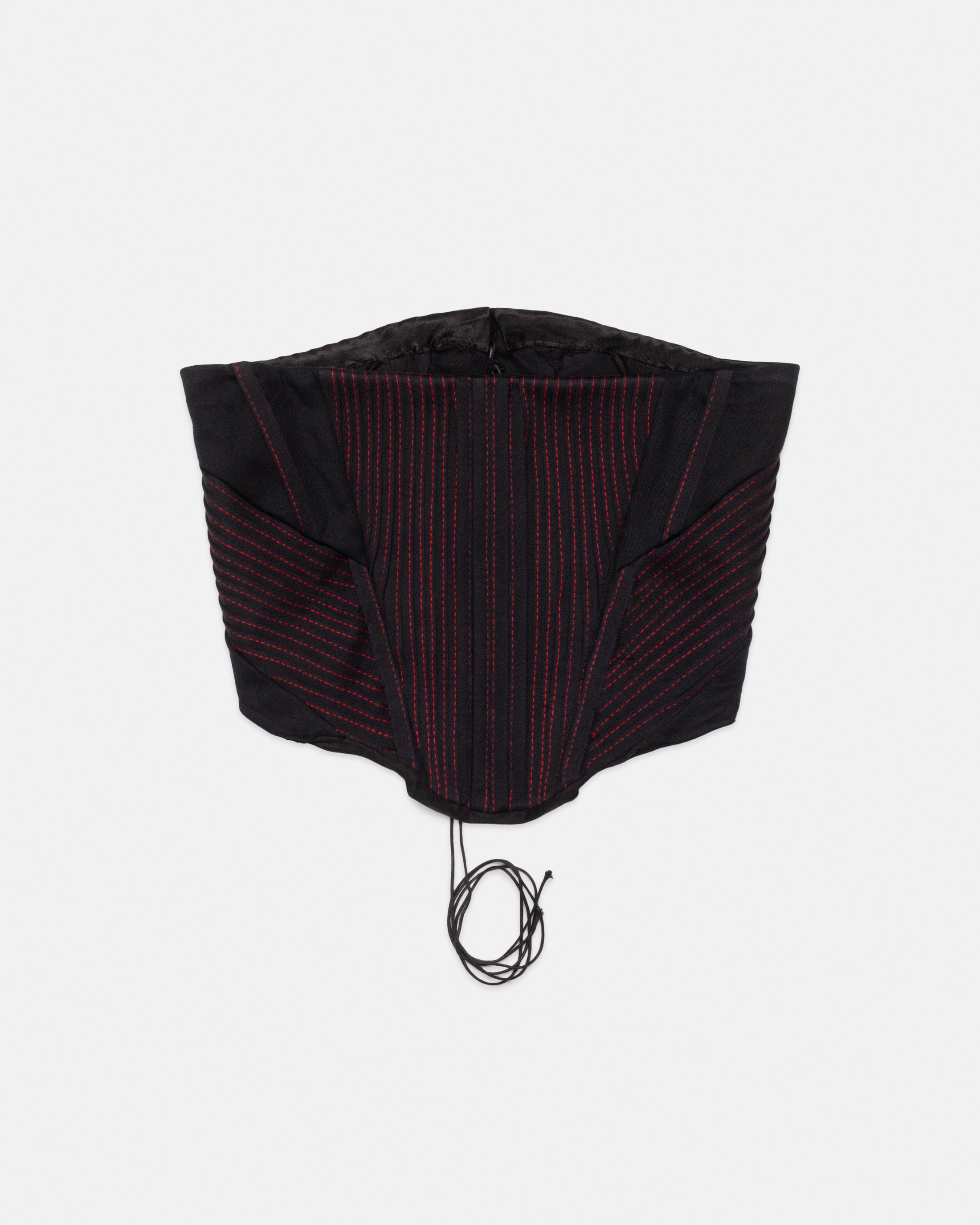 A marquise corset featuring cuts, material work with red-top stitching and a lace-up detail in the back.