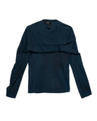 A navy cotton-polyester jersey top with sculptural folds inspired by origami. Built-in pleats wrap dynamically around the chest and shoulders, creating a sense of movement. Finished with hand stitching on hem and sleeves with an invisible shoulder zipper.