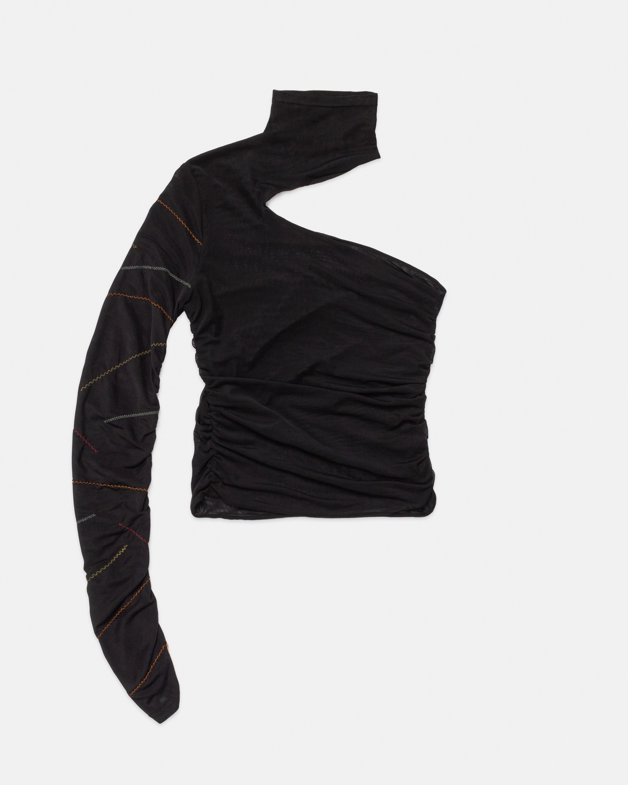 Net shirt with one sleeve with a coloured embroidery on the hand .