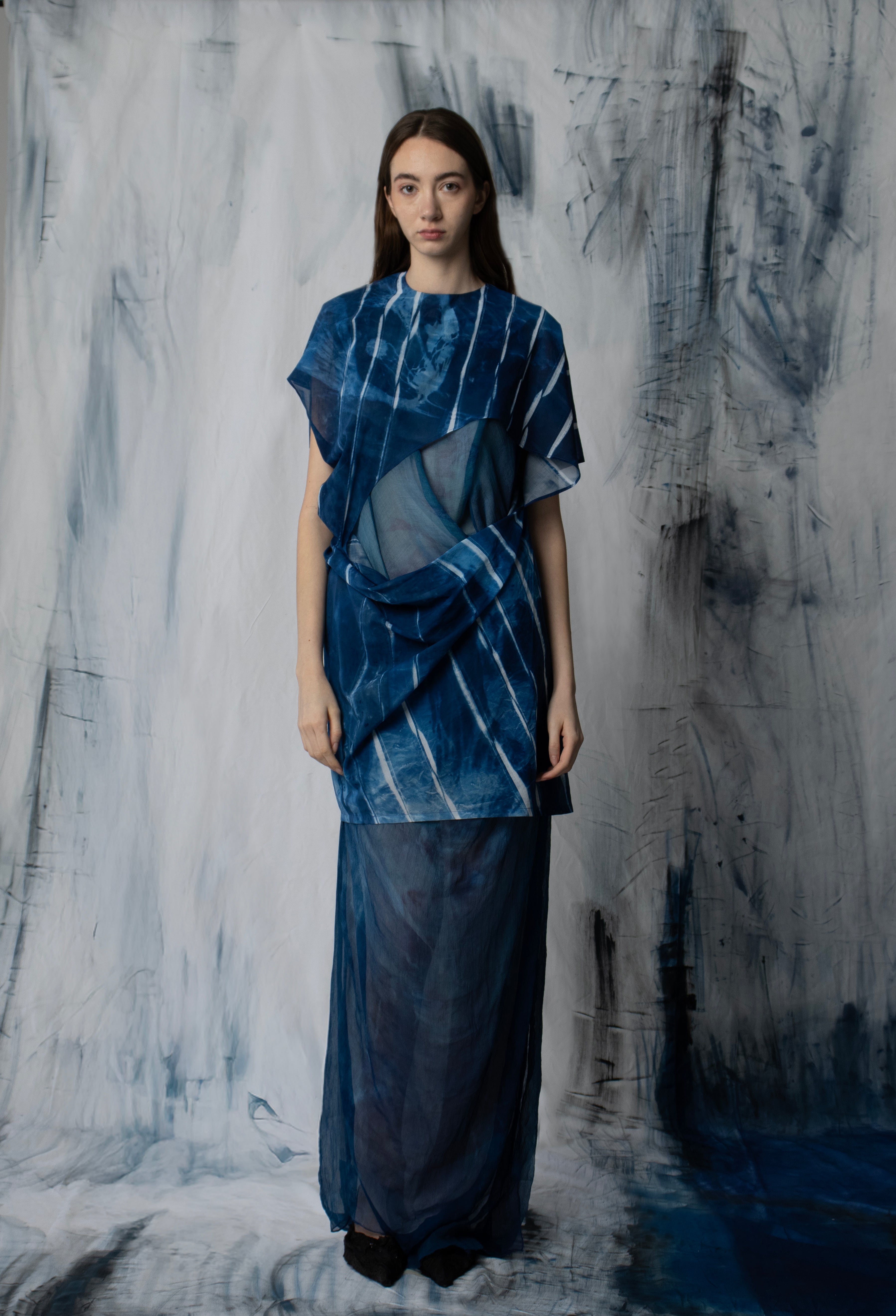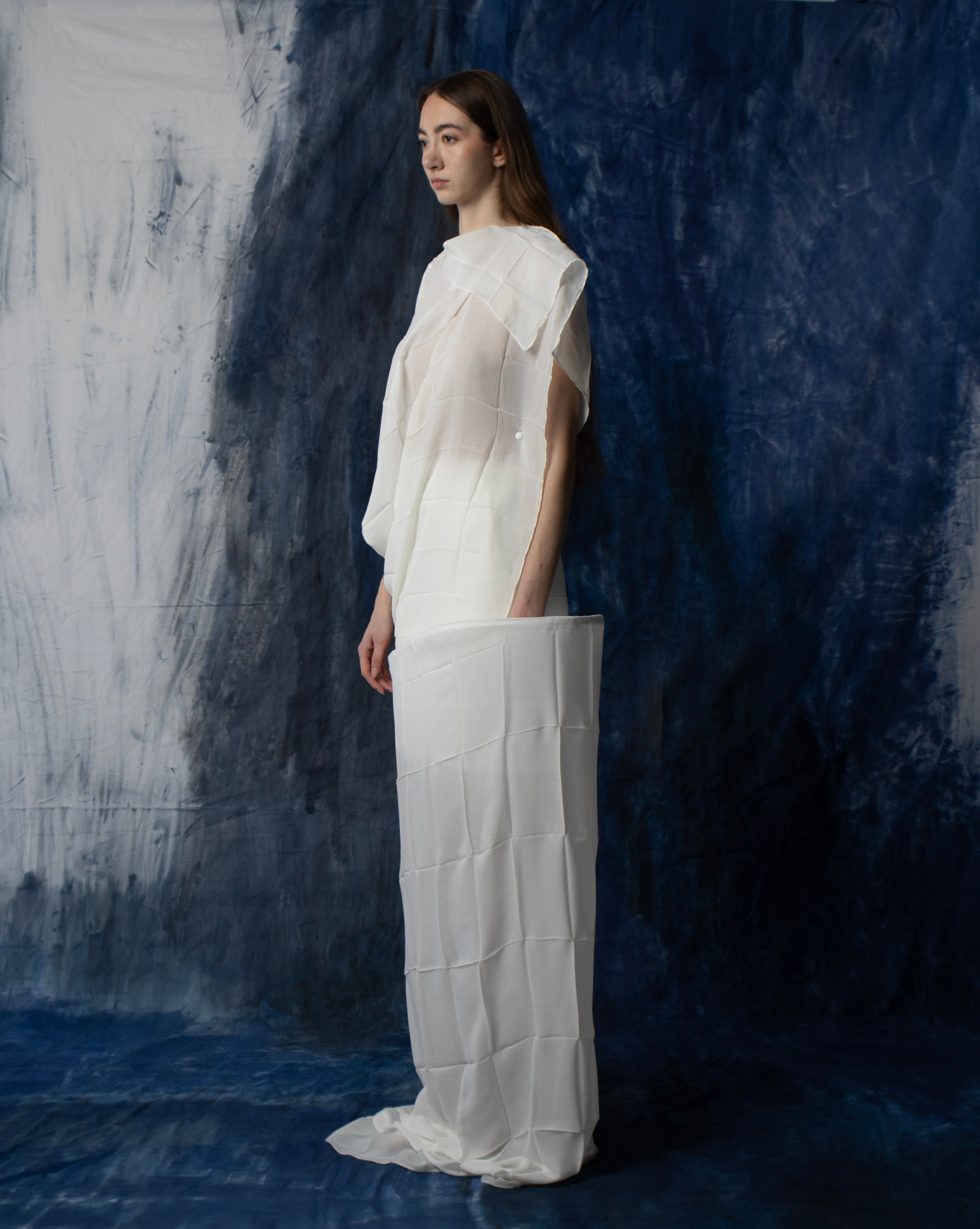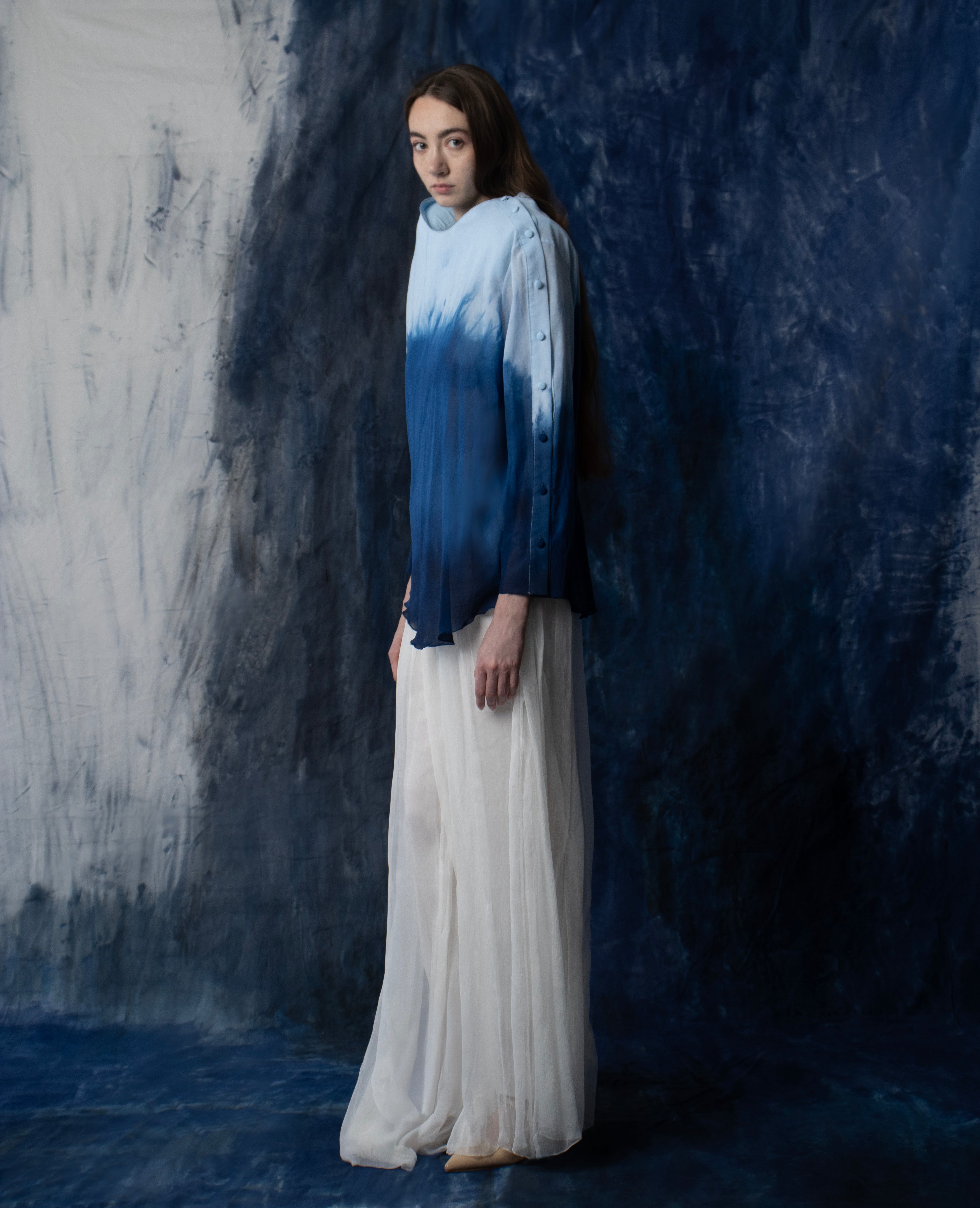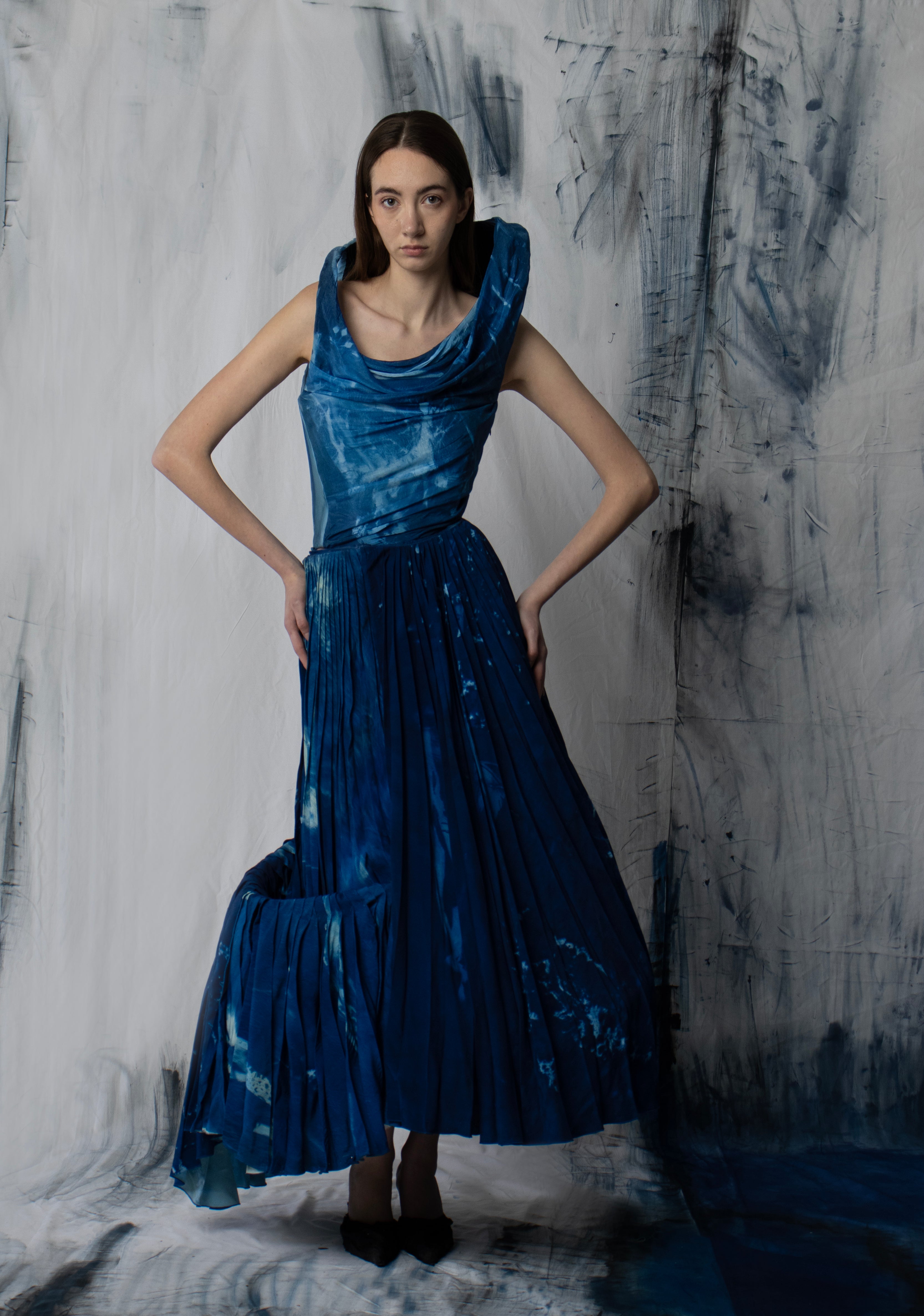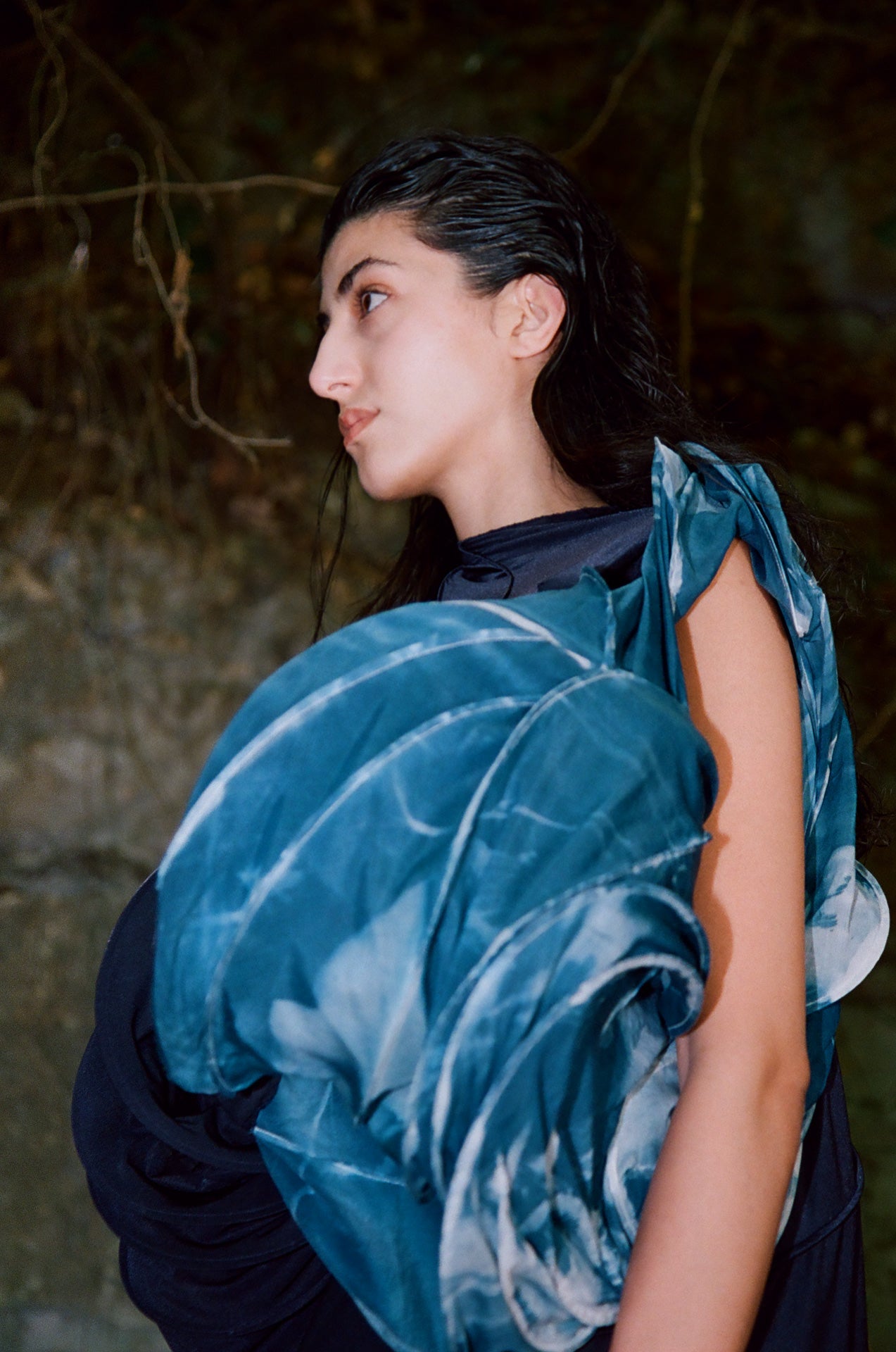 Drawing on Druze philosophy, Vessels likens reincarnation to water adapting to its vessel, with each garment marking a stage in the soul’s journey. Silk, chiffon, organza, cotton, jersey, and voile de coton are pleated, printed, and dyed into a poetic visual language, with handmade folds recalling the Druze Mandeel and cyanotype imprints preserving memory in fabric. Silhouettes shift from veiled forms to freer shapes, while repeated pleats and Shibori patterns echo cycles of rebirth.