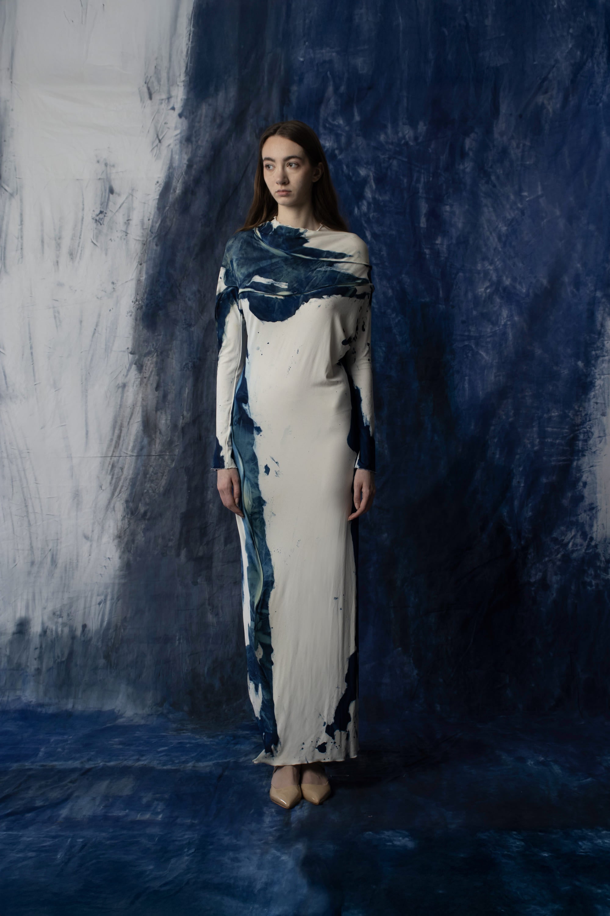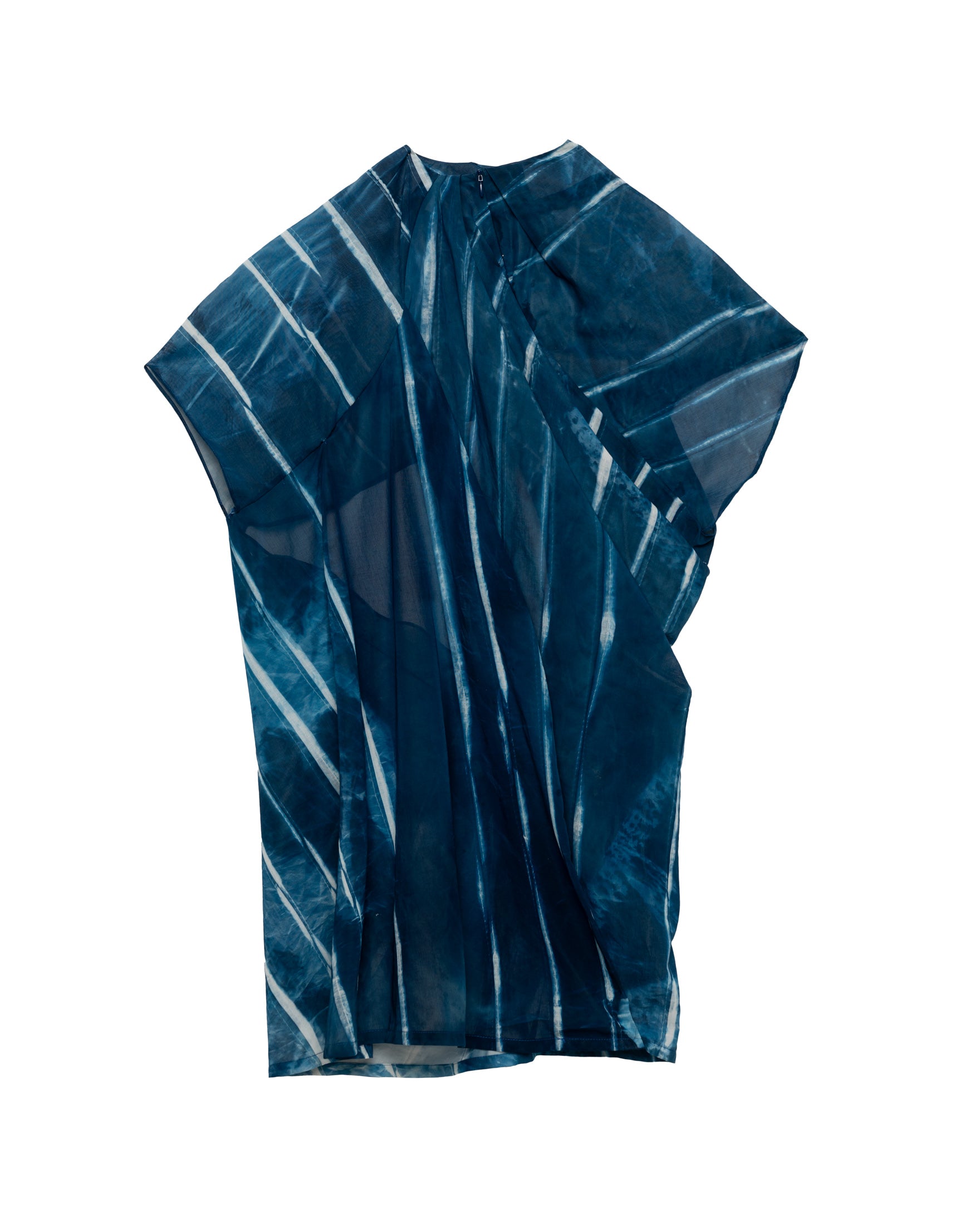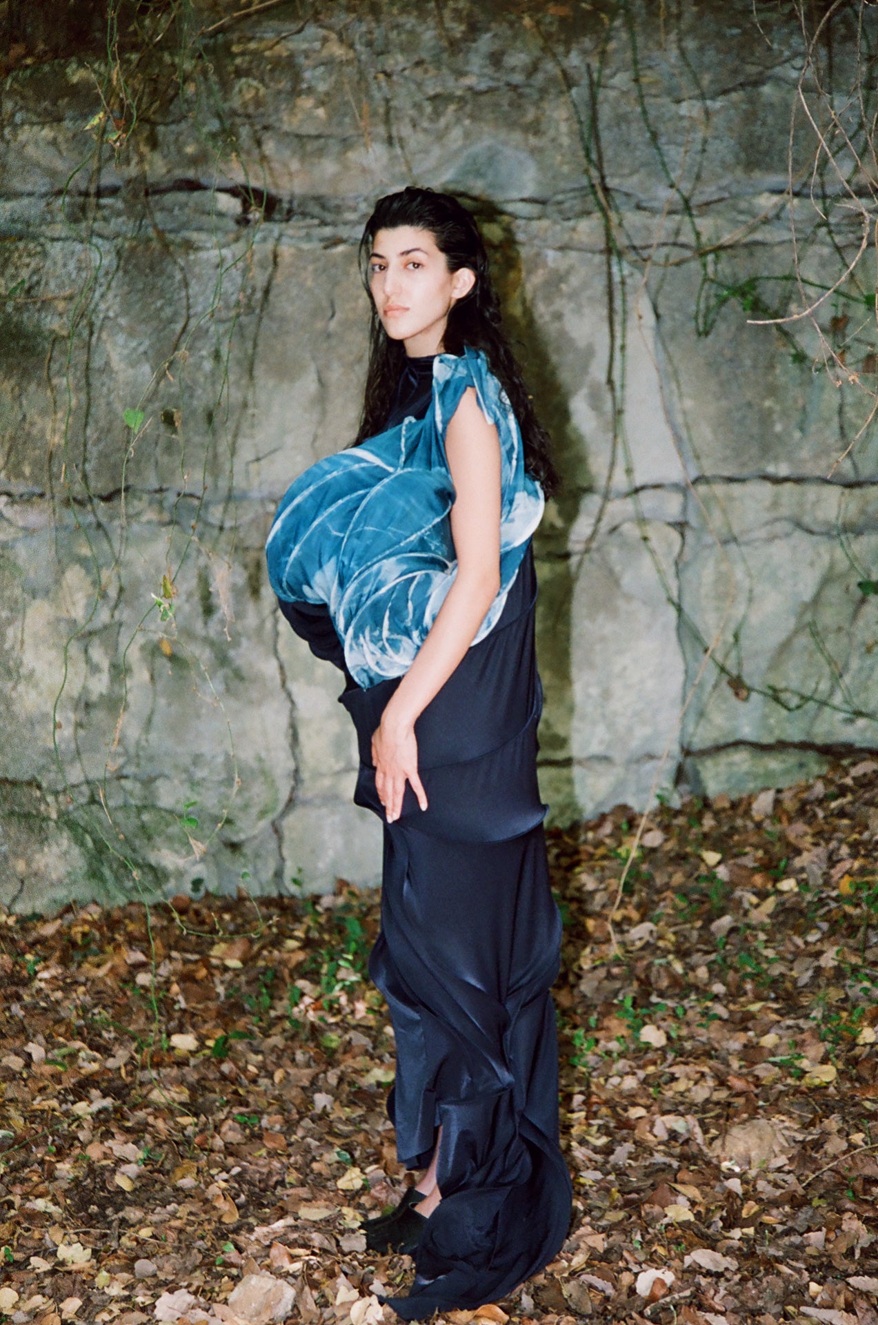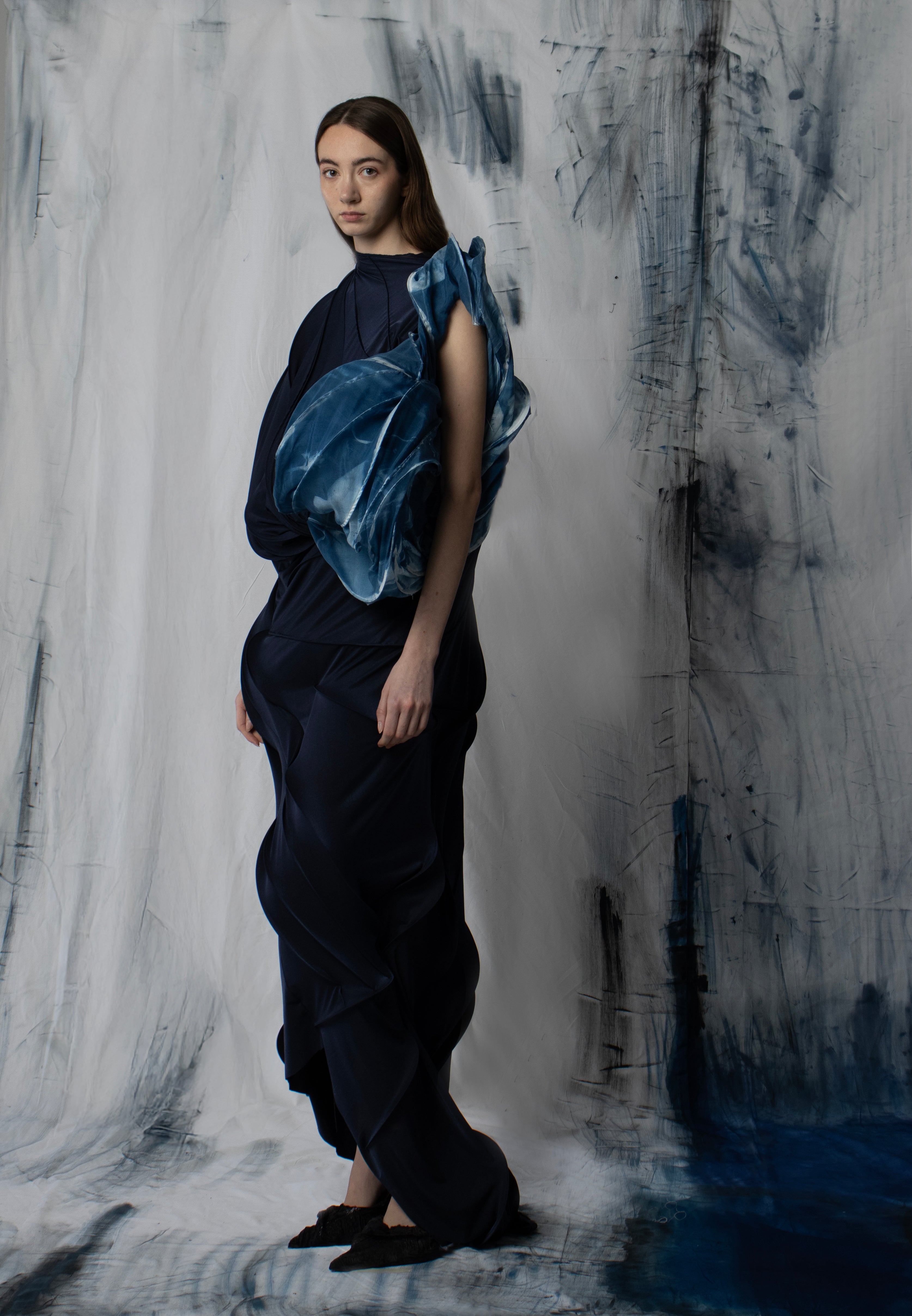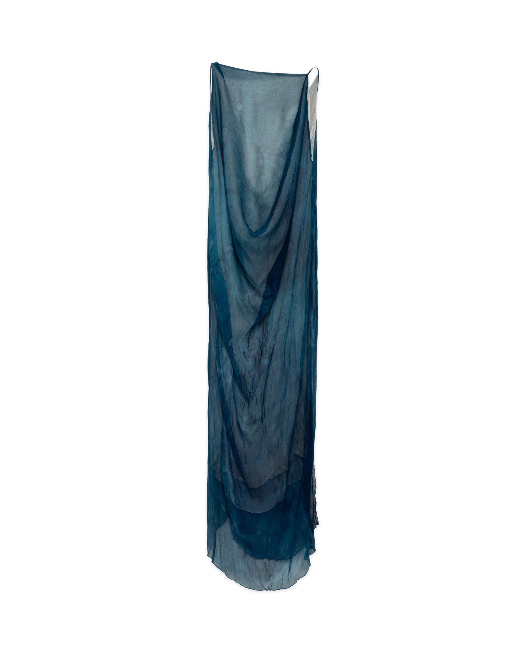 Drawing on Druze philosophy, Vessels likens reincarnation to water adapting to its vessel, with each garment marking a stage in the soul’s journey. Silk, chiffon, organza, cotton, jersey, and voile de coton are pleated, printed, and dyed into a poetic visual language, with handmade folds recalling the Druze Mandeel and cyanotype imprints preserving memory in fabric. Silhouettes shift from veiled forms to freer shapes, while repeated pleats and Shibori patterns echo cycles of rebirth.