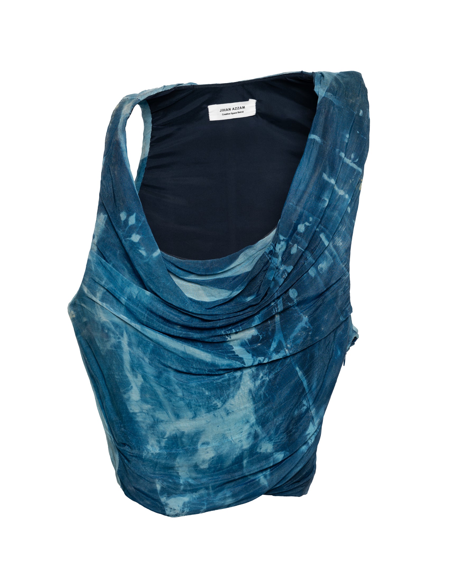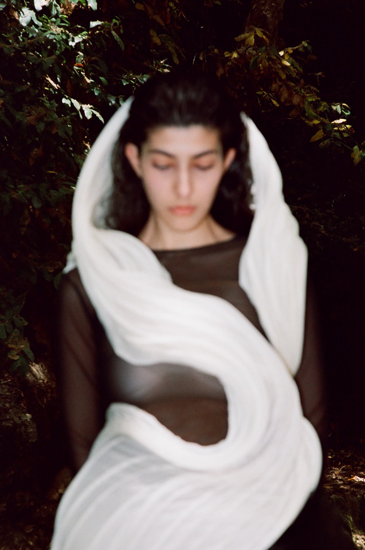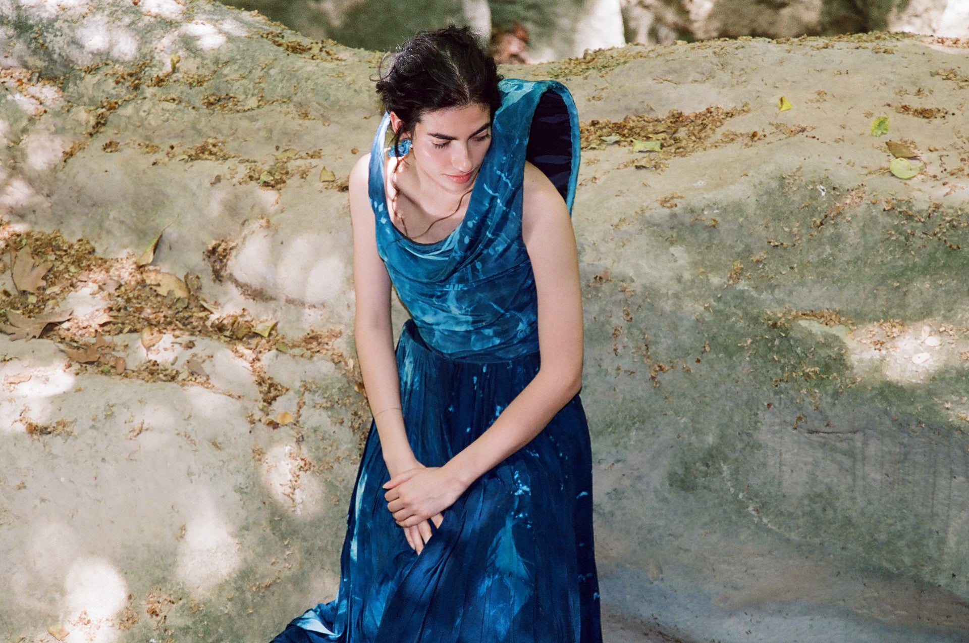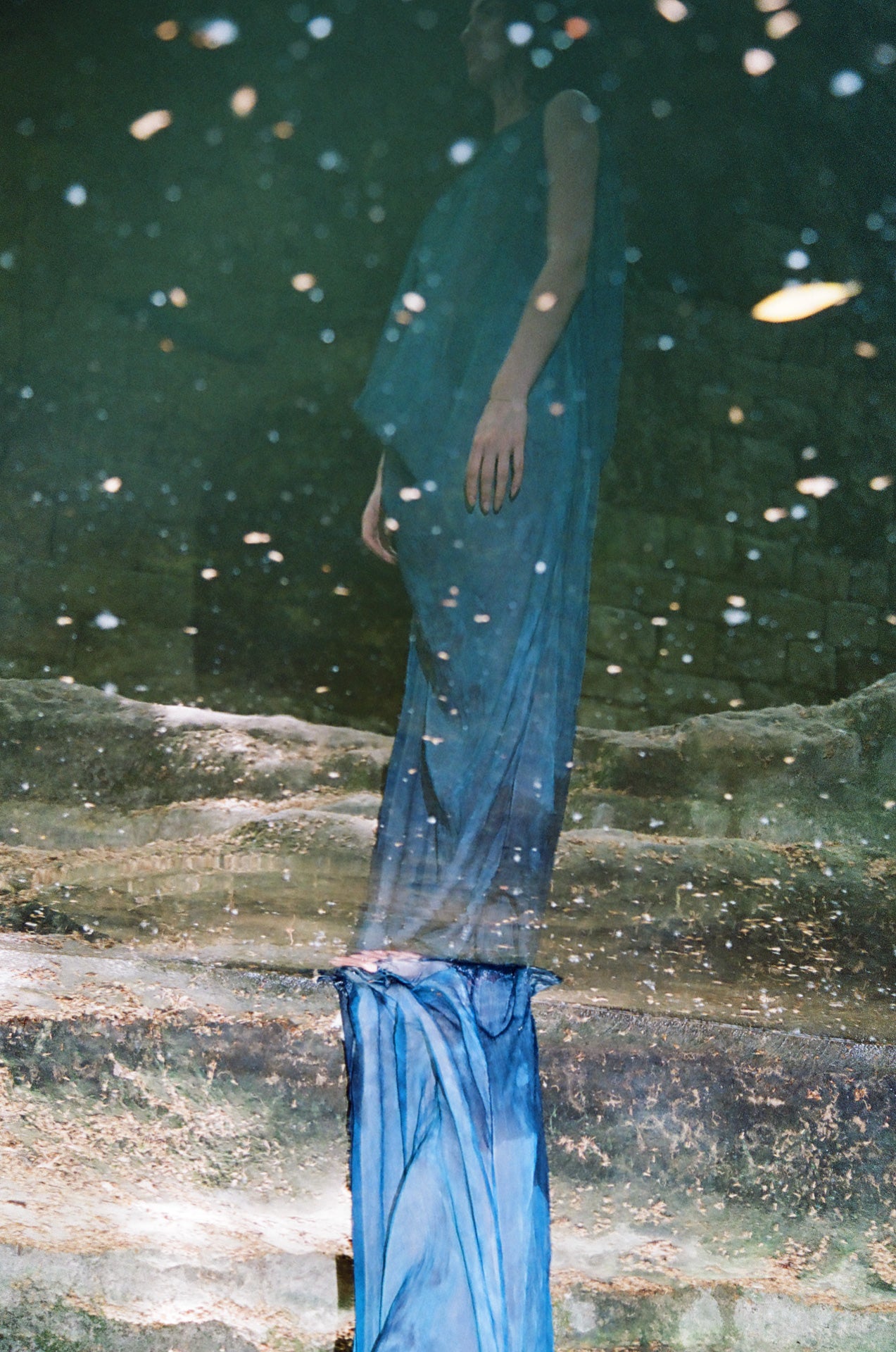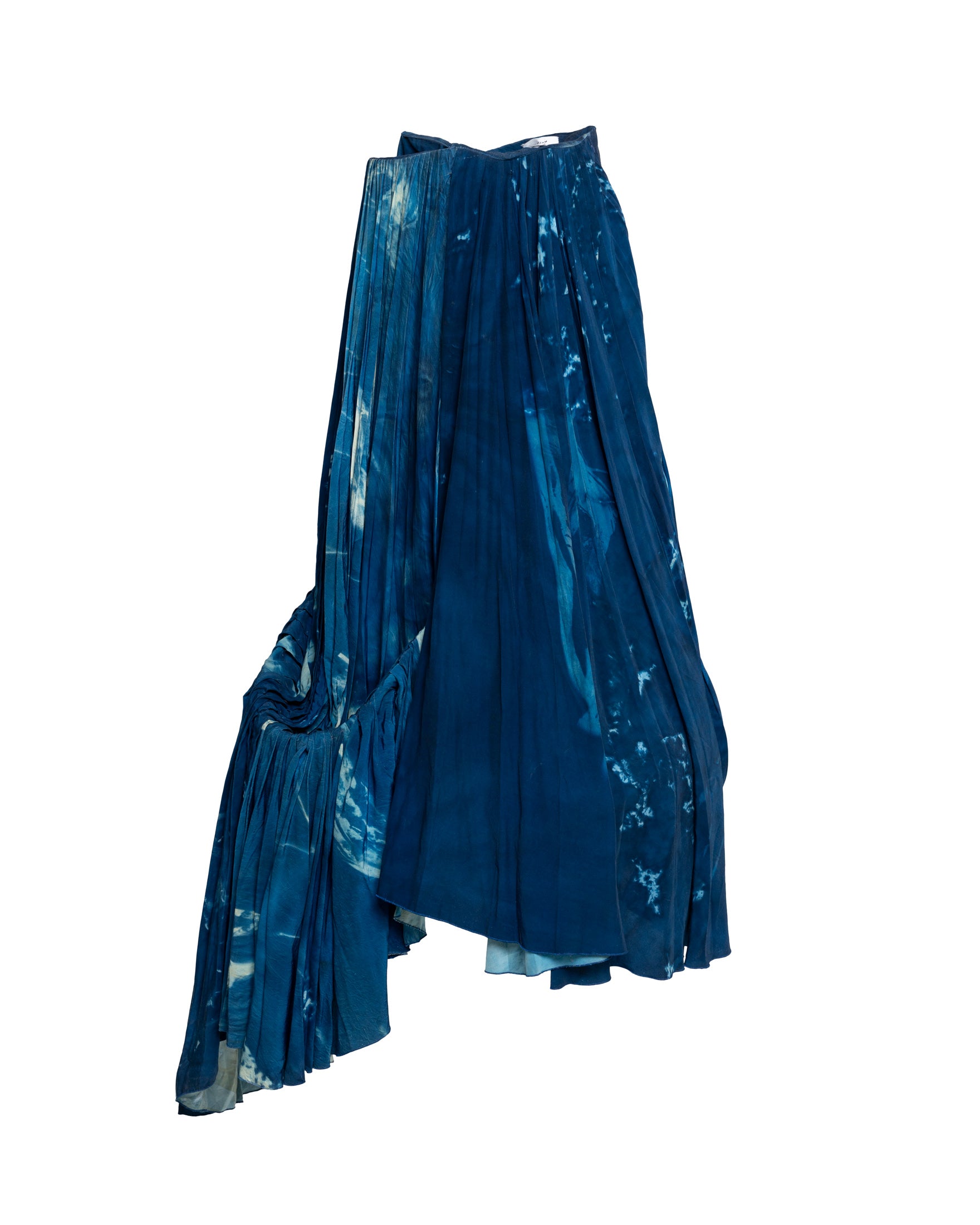 Drawing on Druze philosophy, Vessels likens reincarnation to water adapting to its vessel, with each garment marking a stage in the soul’s journey. Silk, chiffon, organza, cotton, jersey, and voile de coton are pleated, printed, and dyed into a poetic visual language, with handmade folds recalling the Druze Mandeel and cyanotype imprints preserving memory in fabric. Silhouettes shift from veiled forms to freer shapes, while repeated pleats and Shibori patterns echo cycles of rebirth.