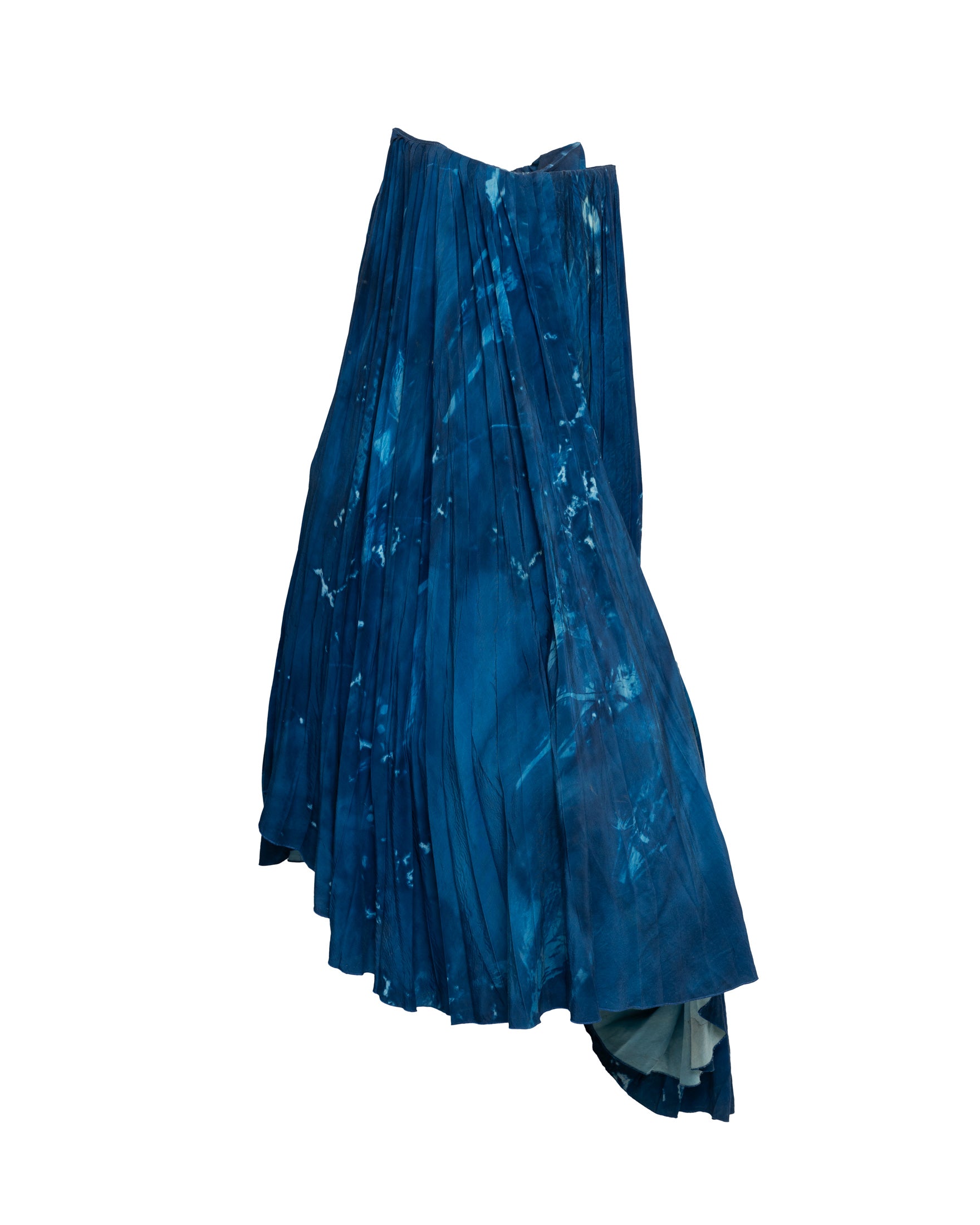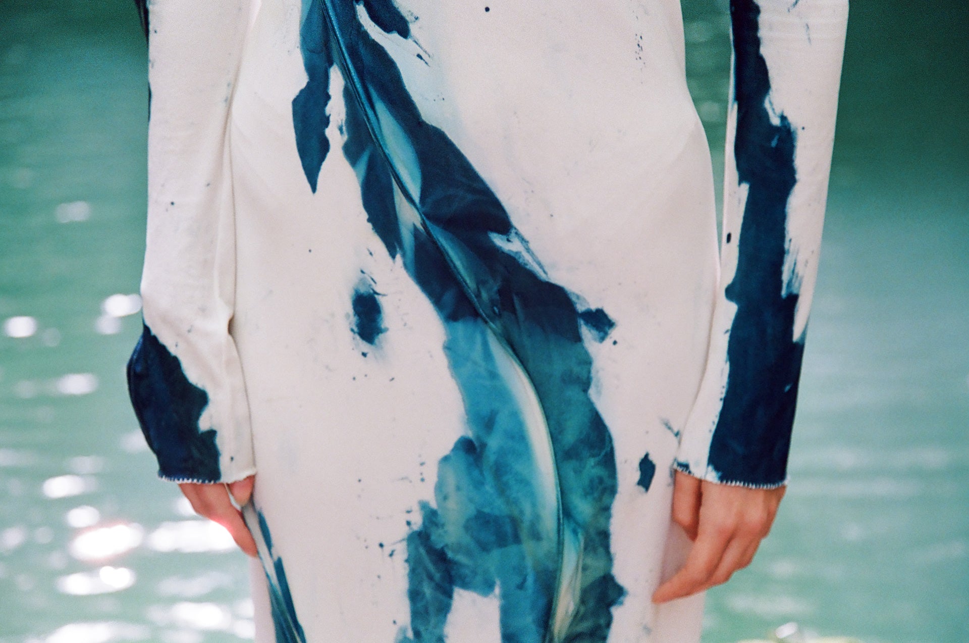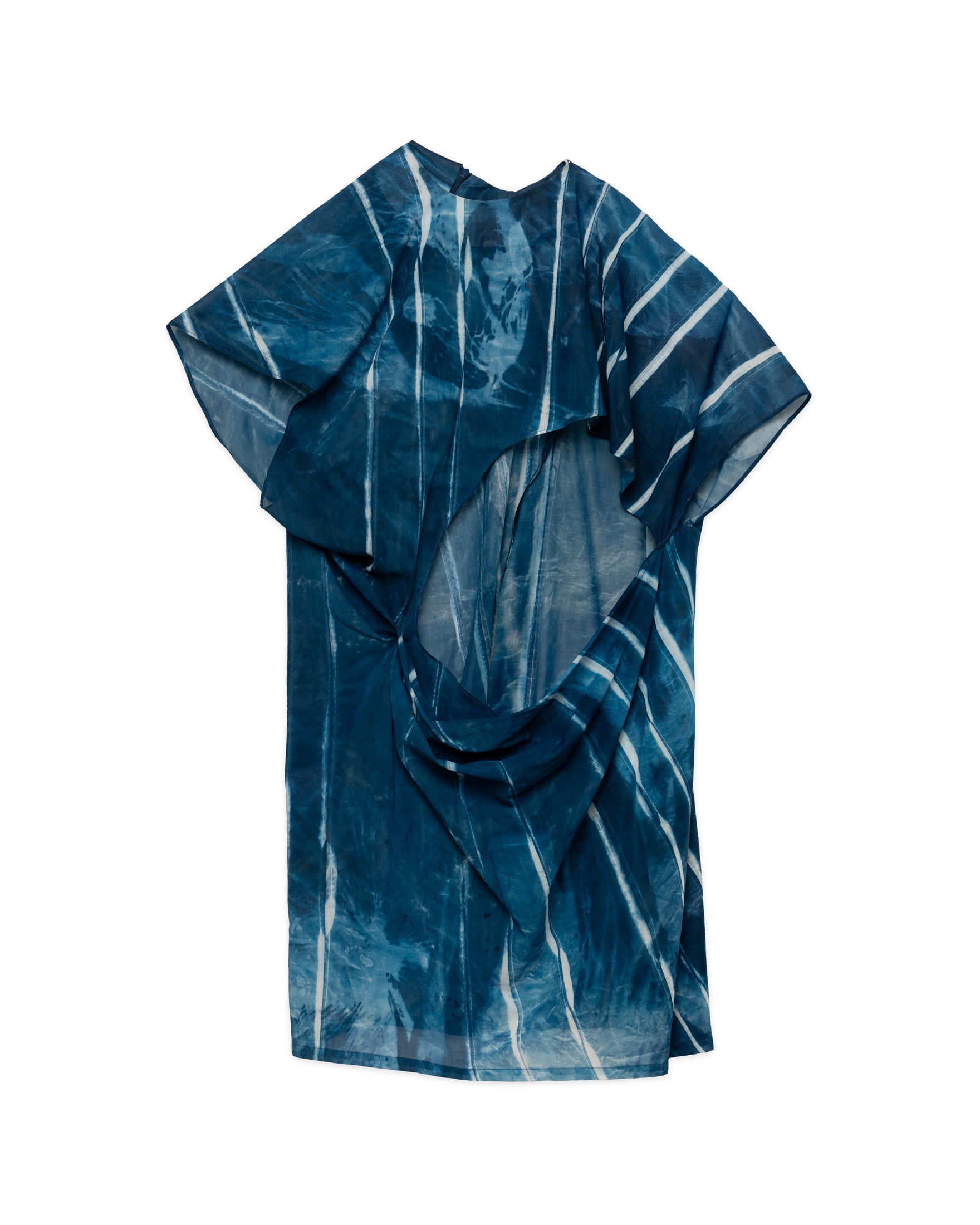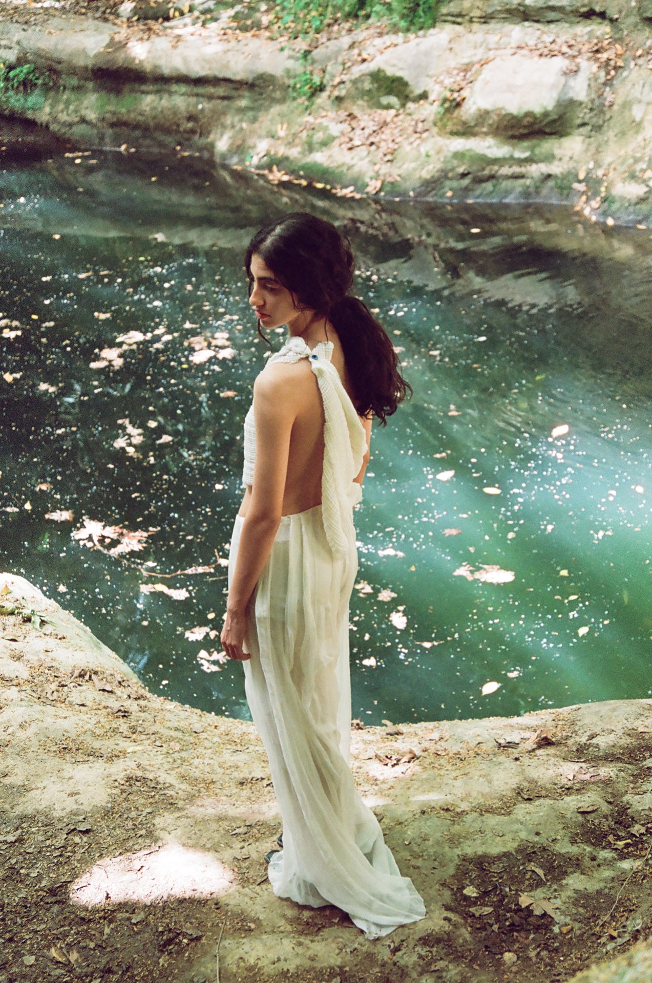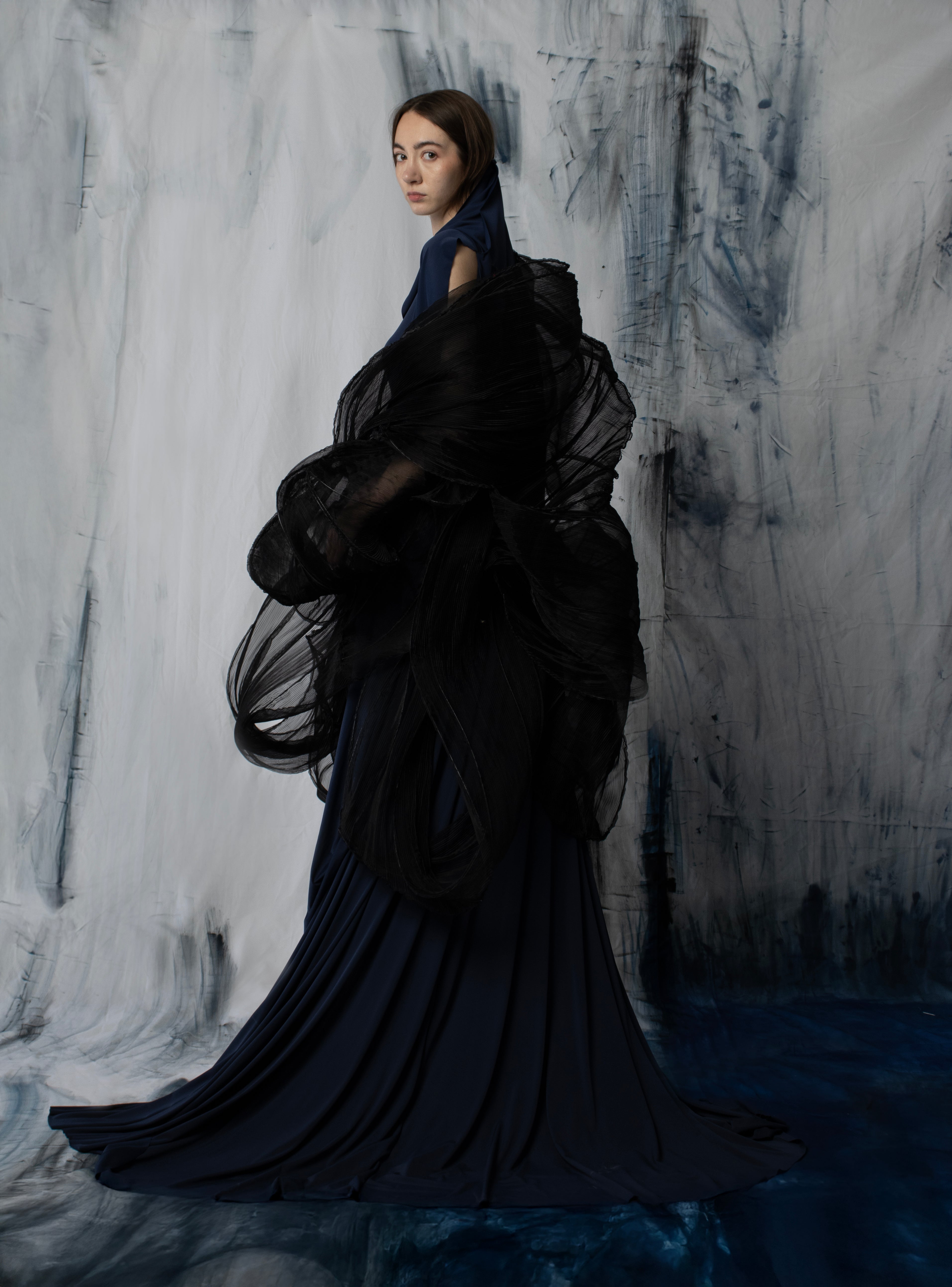 Drawing on Druze philosophy, Vessels likens reincarnation to water adapting to its vessel, with each garment marking a stage in the soul’s journey. Silk, chiffon, organza, cotton, jersey, and voile de coton are pleated, printed, and dyed into a poetic visual language, with handmade folds recalling the Druze Mandeel and cyanotype imprints preserving memory in fabric. Silhouettes shift from veiled forms to freer shapes, while repeated pleats and Shibori patterns echo cycles of rebirth.