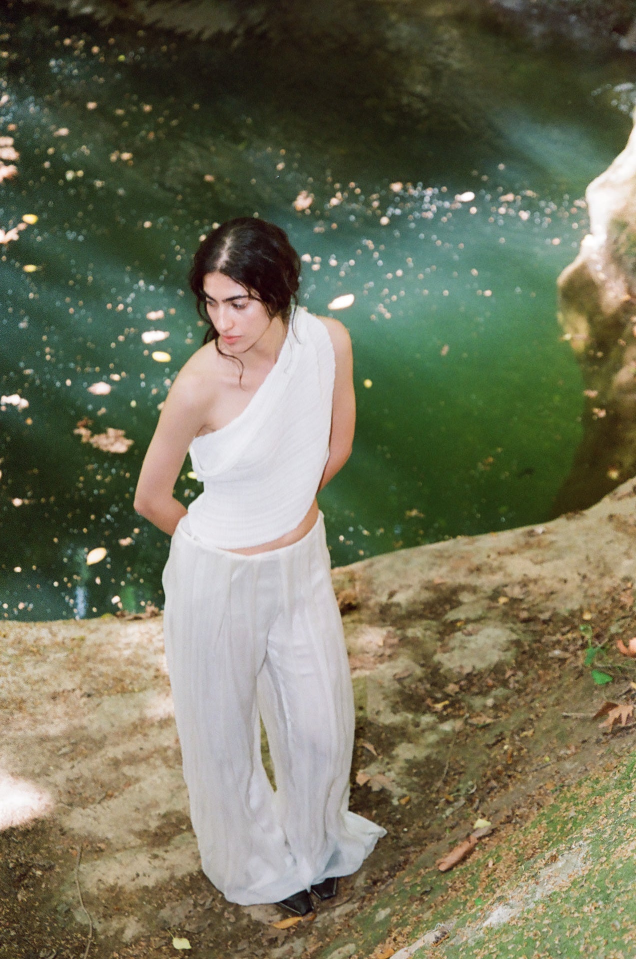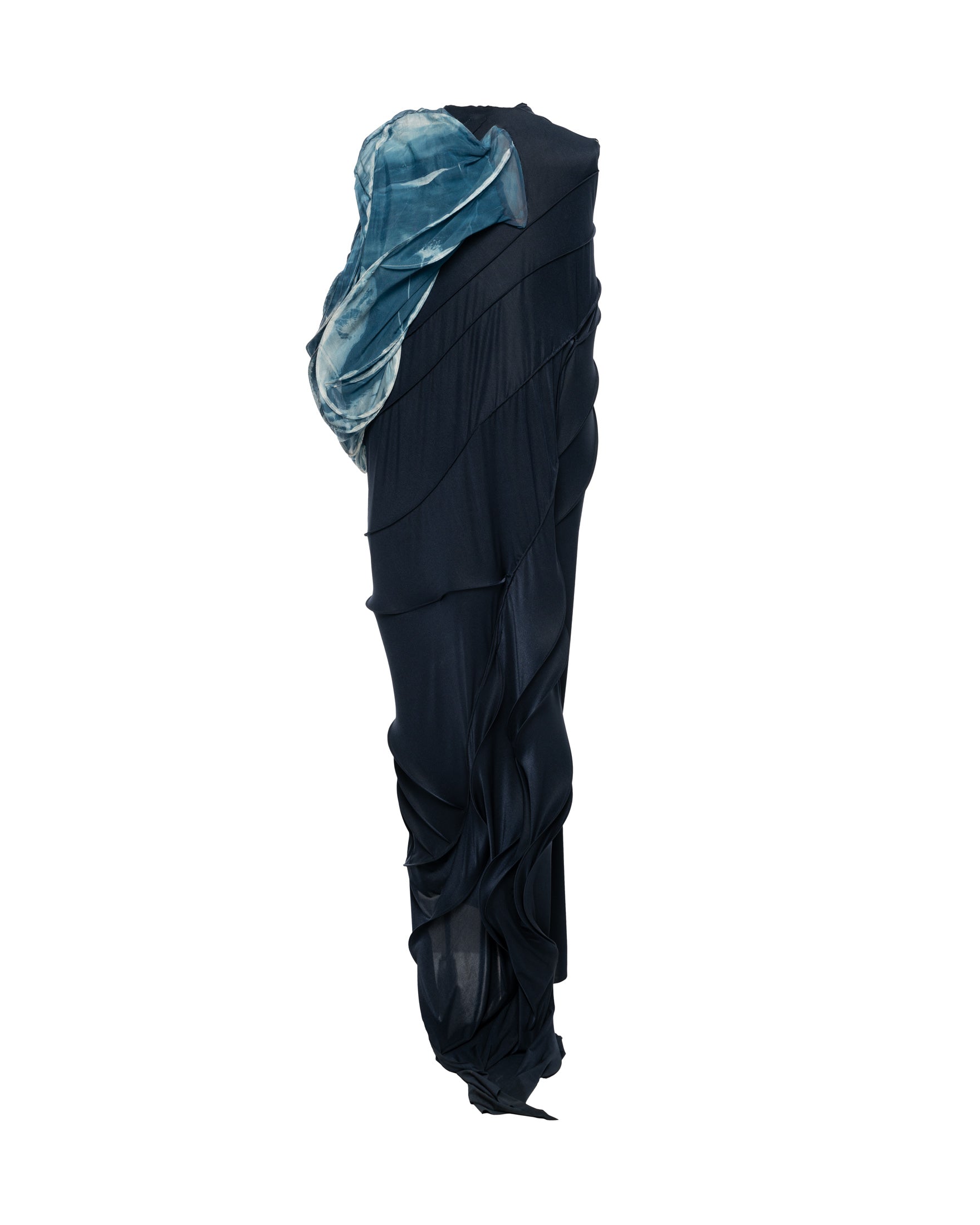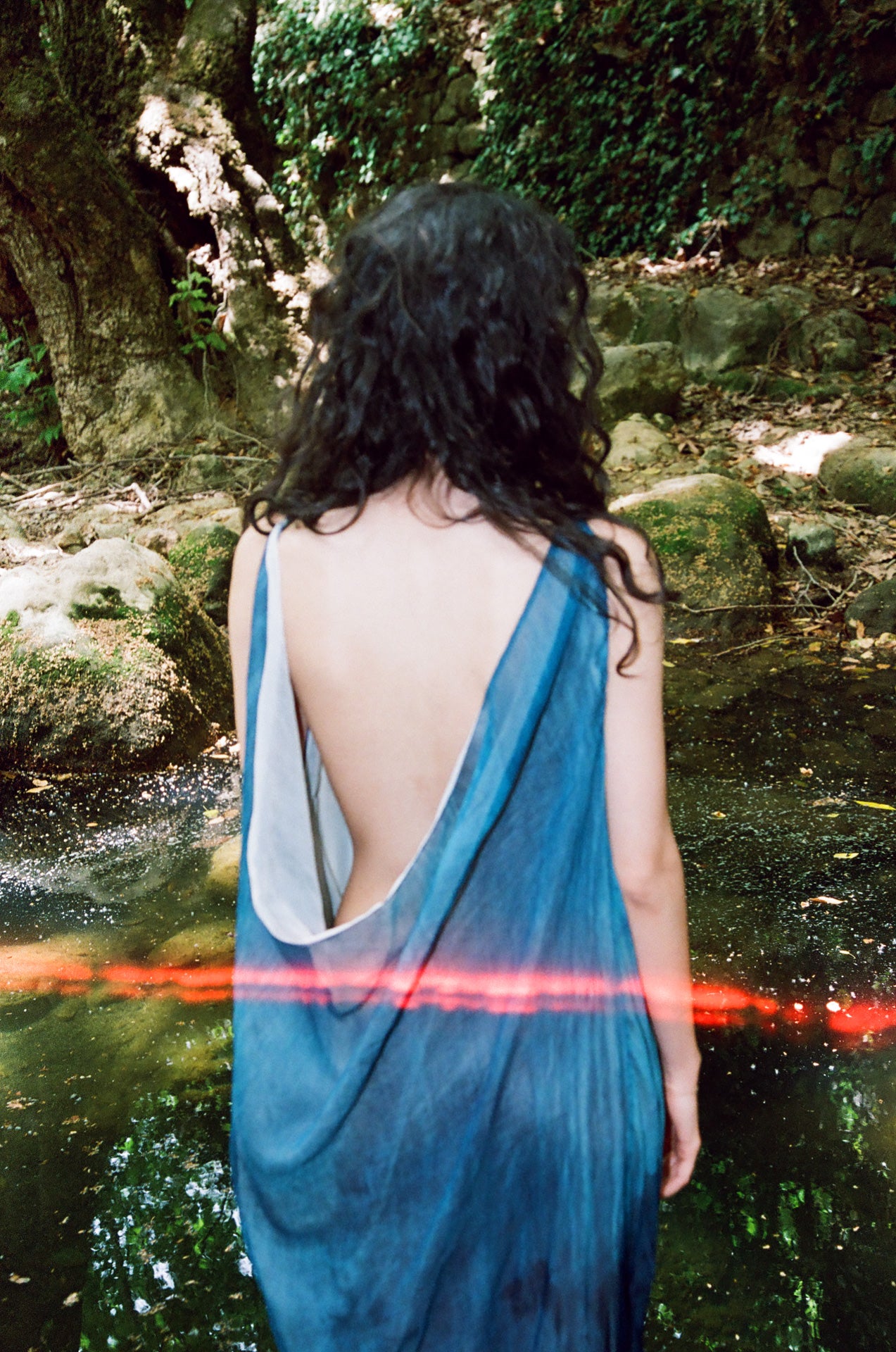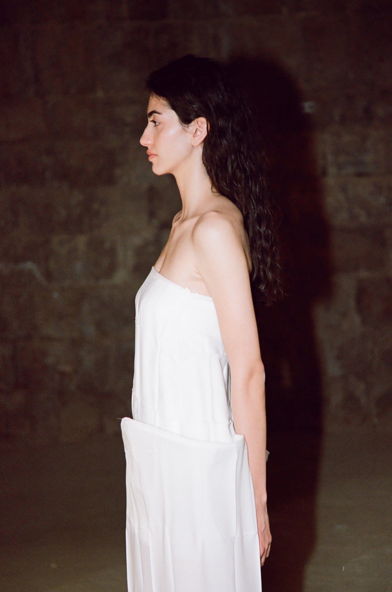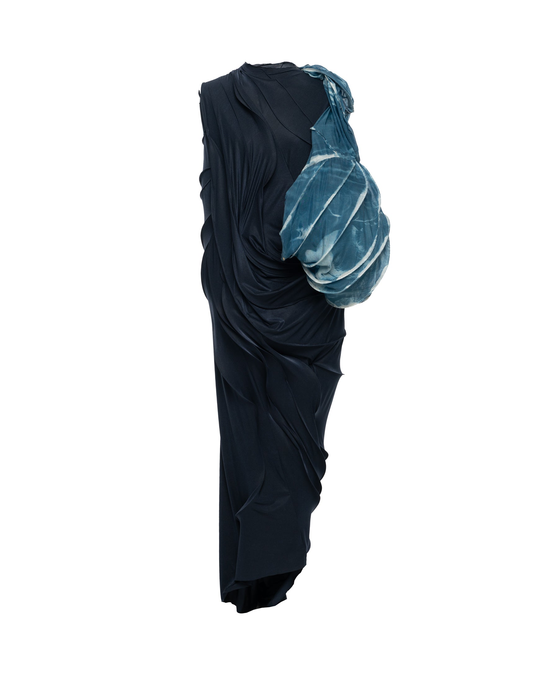 Drawing on Druze philosophy, Vessels likens reincarnation to water adapting to its vessel, with each garment marking a stage in the soul’s journey. Silk, chiffon, organza, cotton, jersey, and voile de coton are pleated, printed, and dyed into a poetic visual language, with handmade folds recalling the Druze Mandeel and cyanotype imprints preserving memory in fabric. Silhouettes shift from veiled forms to freer shapes, while repeated pleats and Shibori patterns echo cycles of rebirth.
