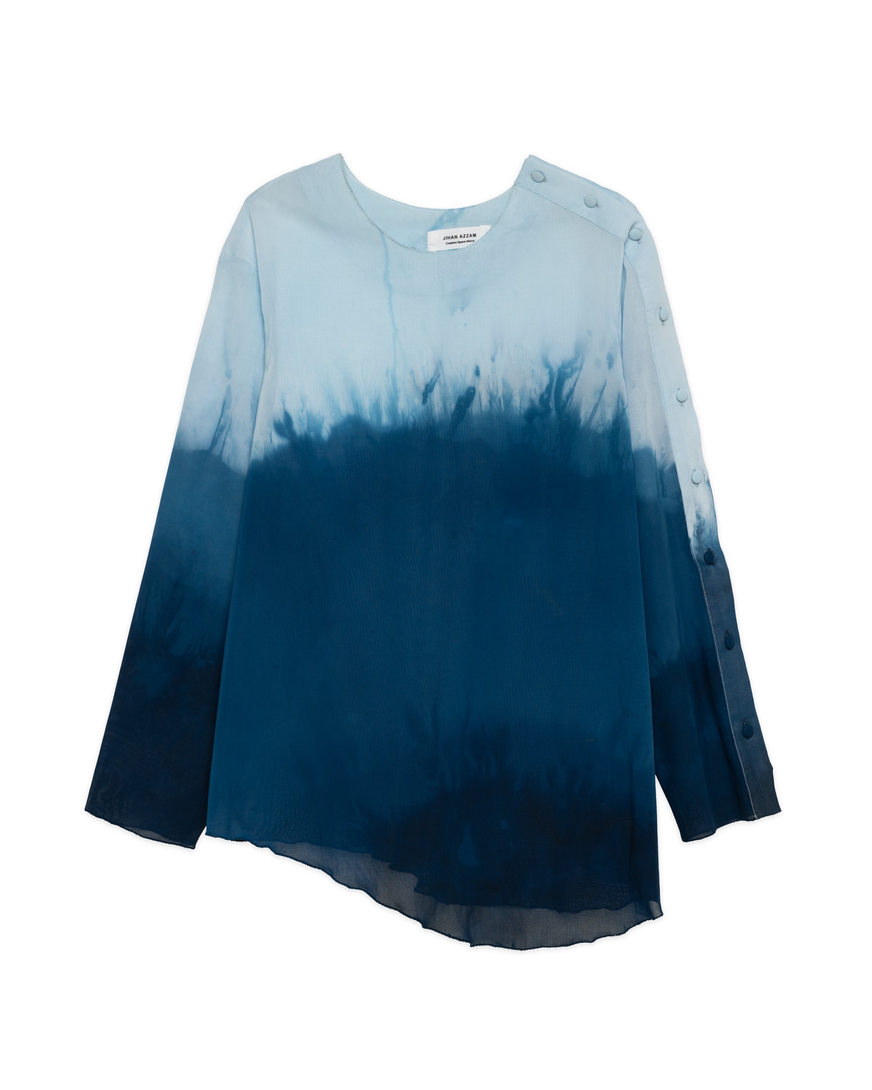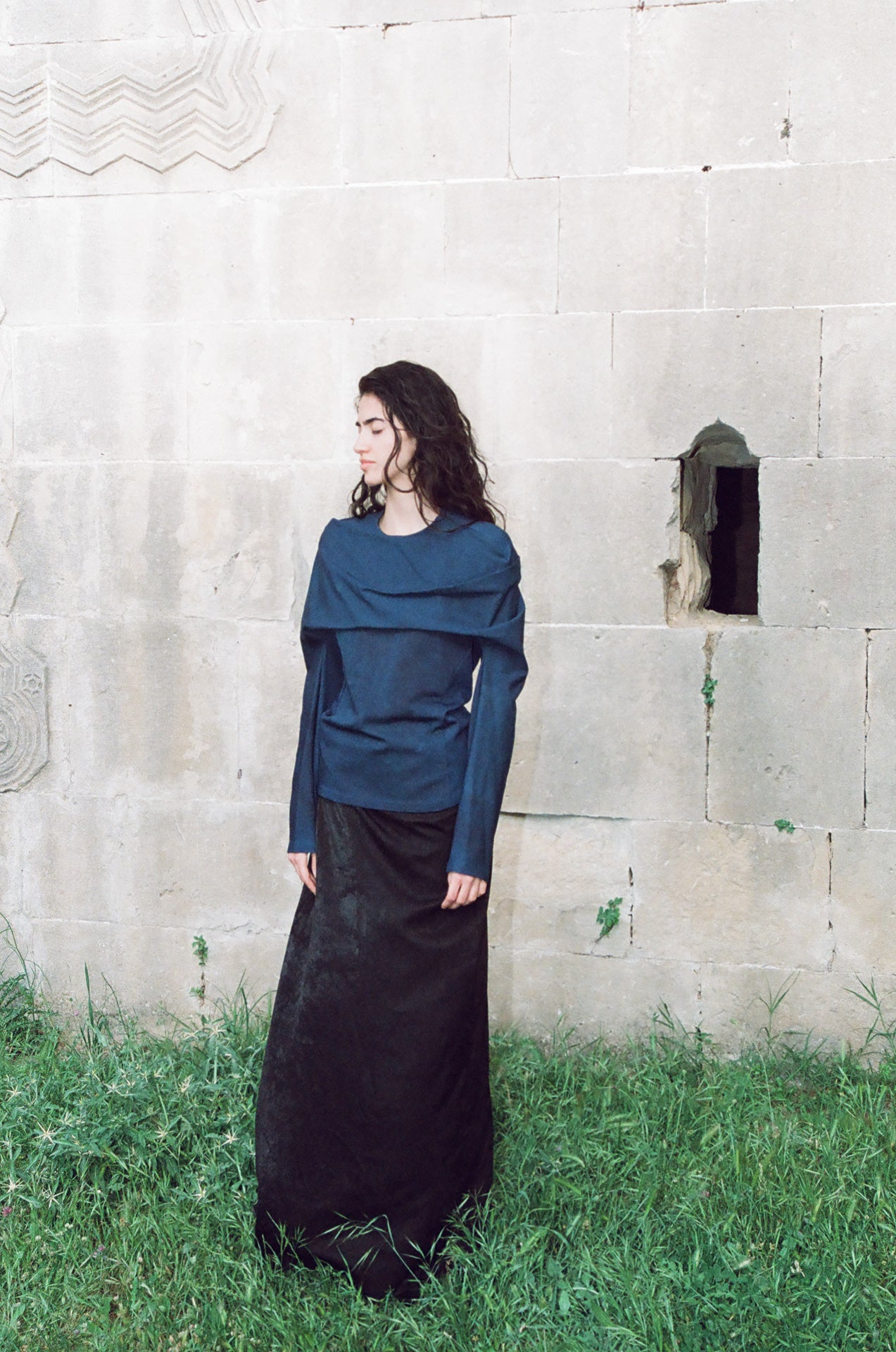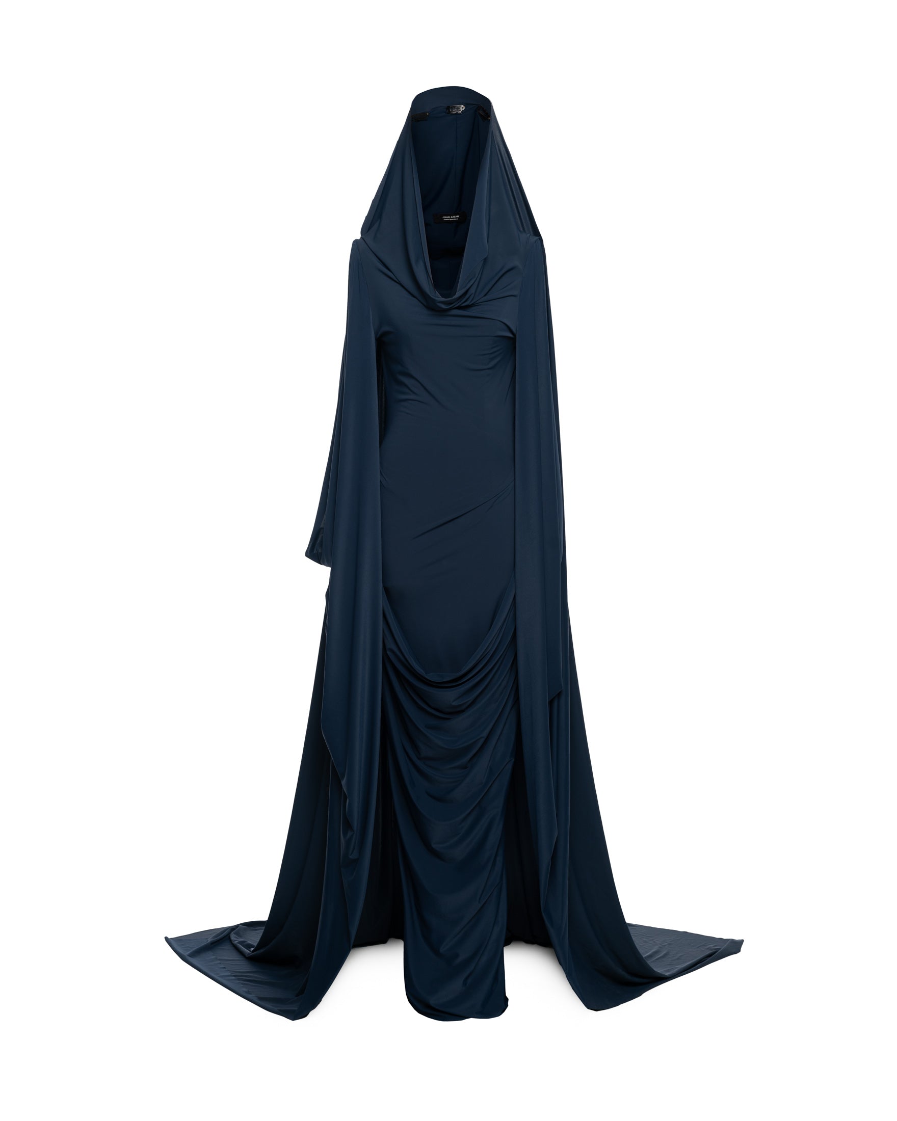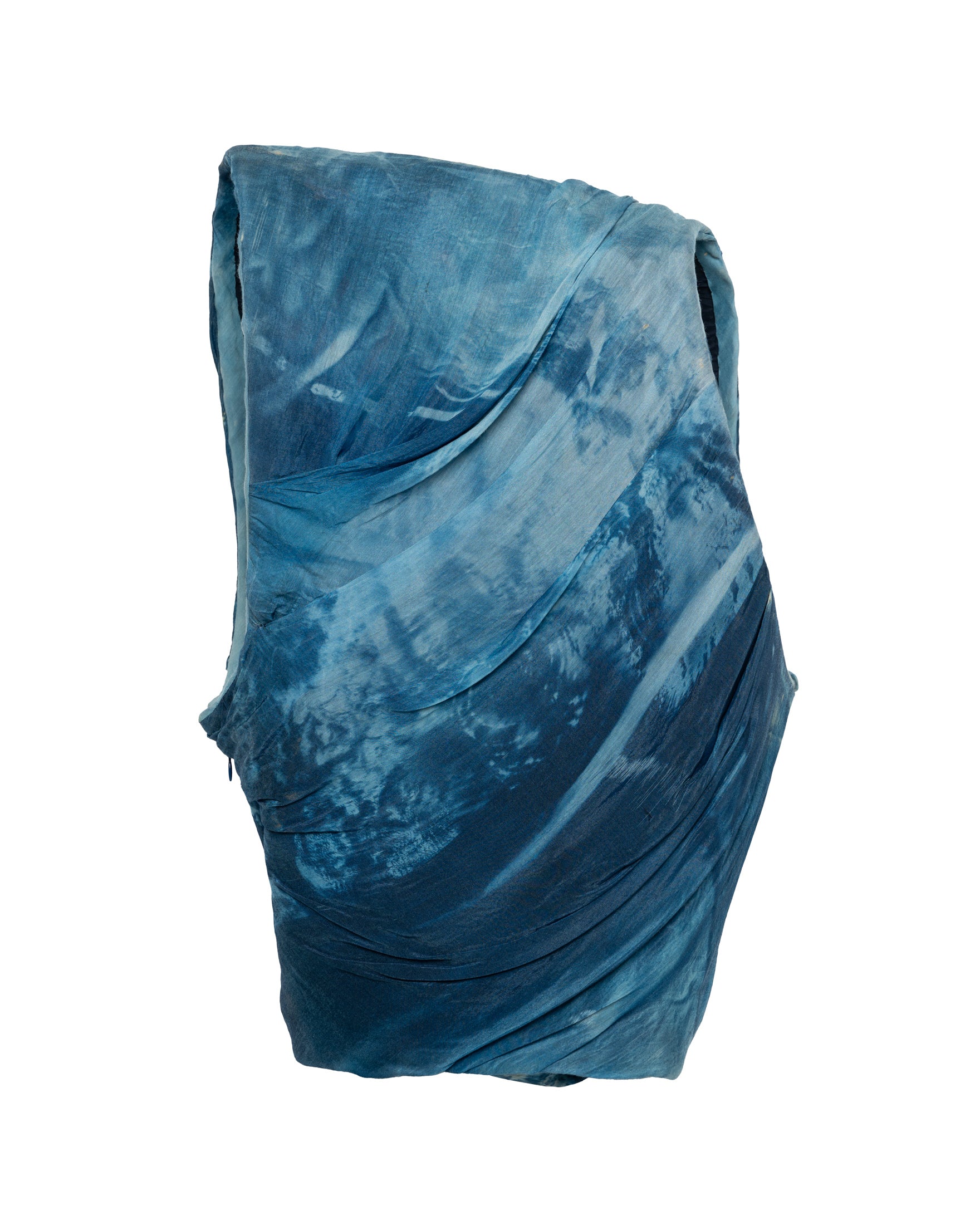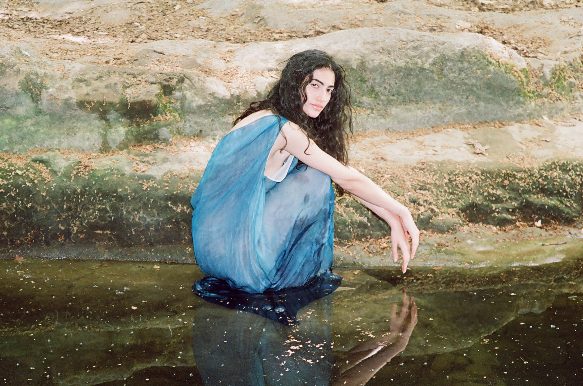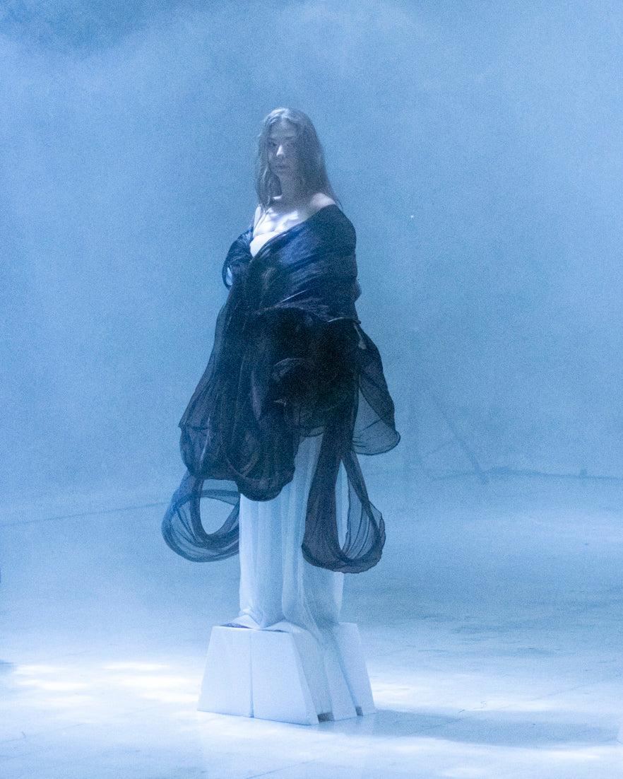 Drawing on Druze philosophy, Vessels likens reincarnation to water adapting to its vessel, with each garment marking a stage in the soul’s journey. Silk, chiffon, organza, cotton, jersey, and voile de coton are pleated, printed, and dyed into a poetic visual language, with handmade folds recalling the Druze Mandeel and cyanotype imprints preserving memory in fabric. Silhouettes shift from veiled forms to freer shapes, while repeated pleats and Shibori patterns echo cycles of rebirth.