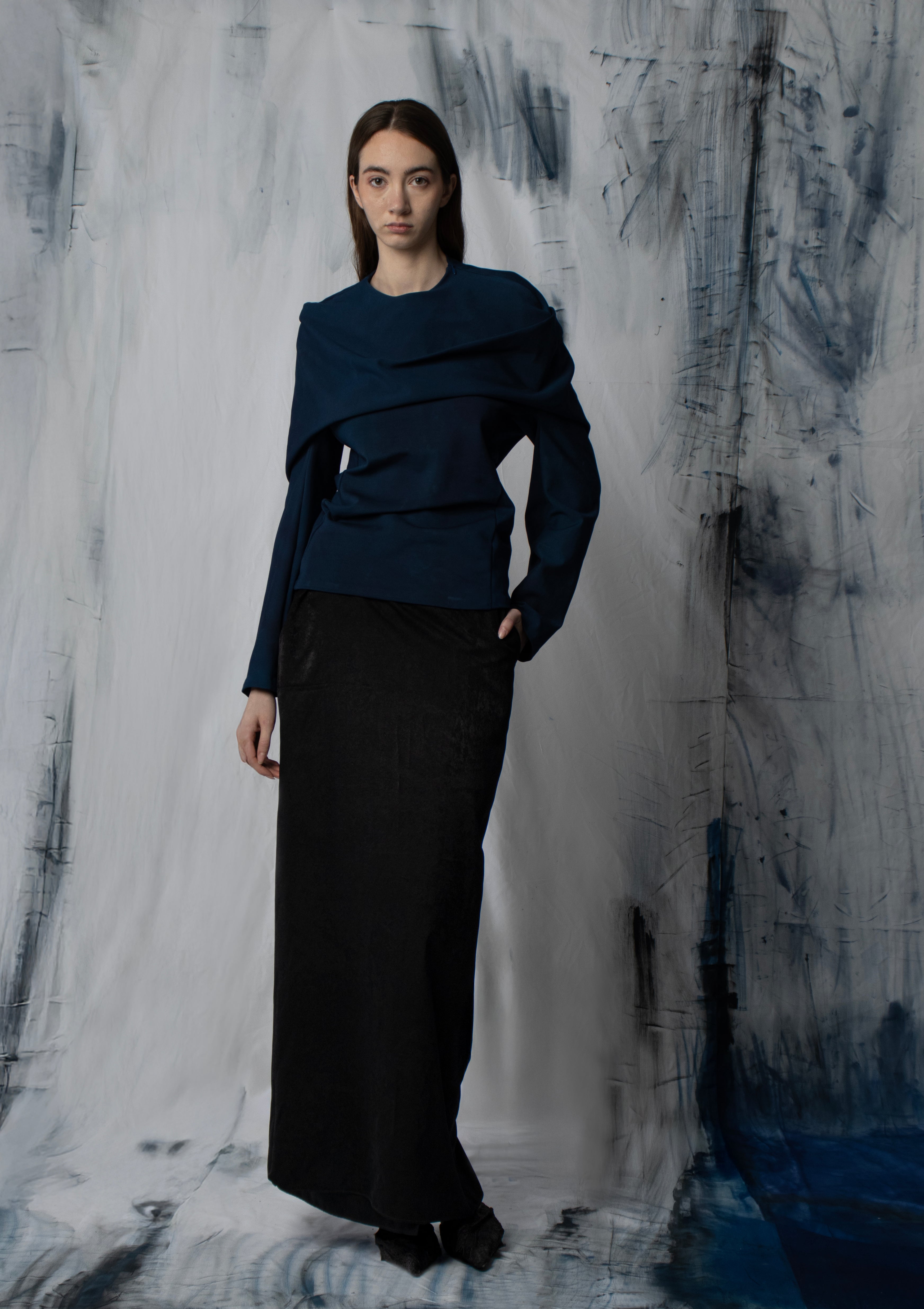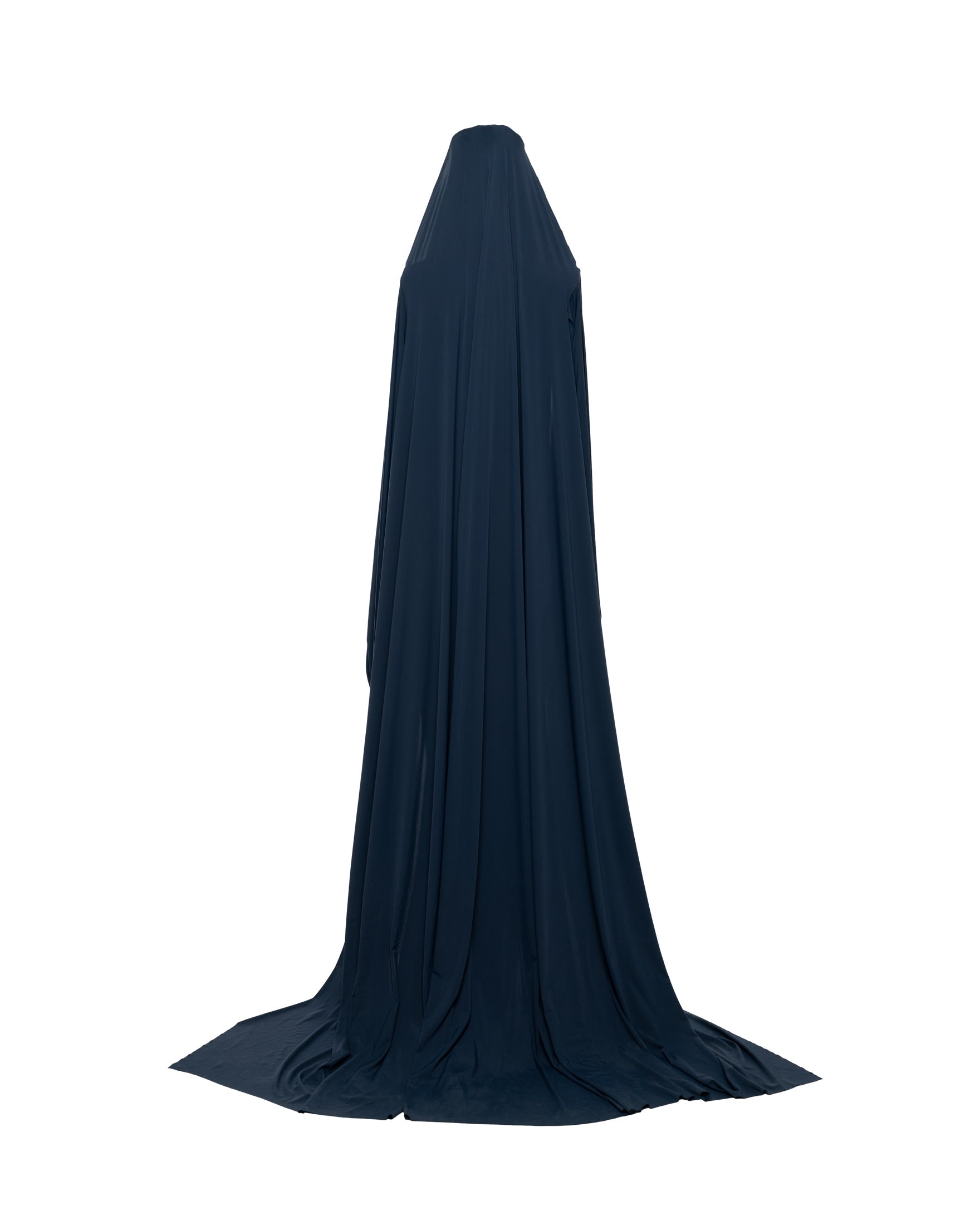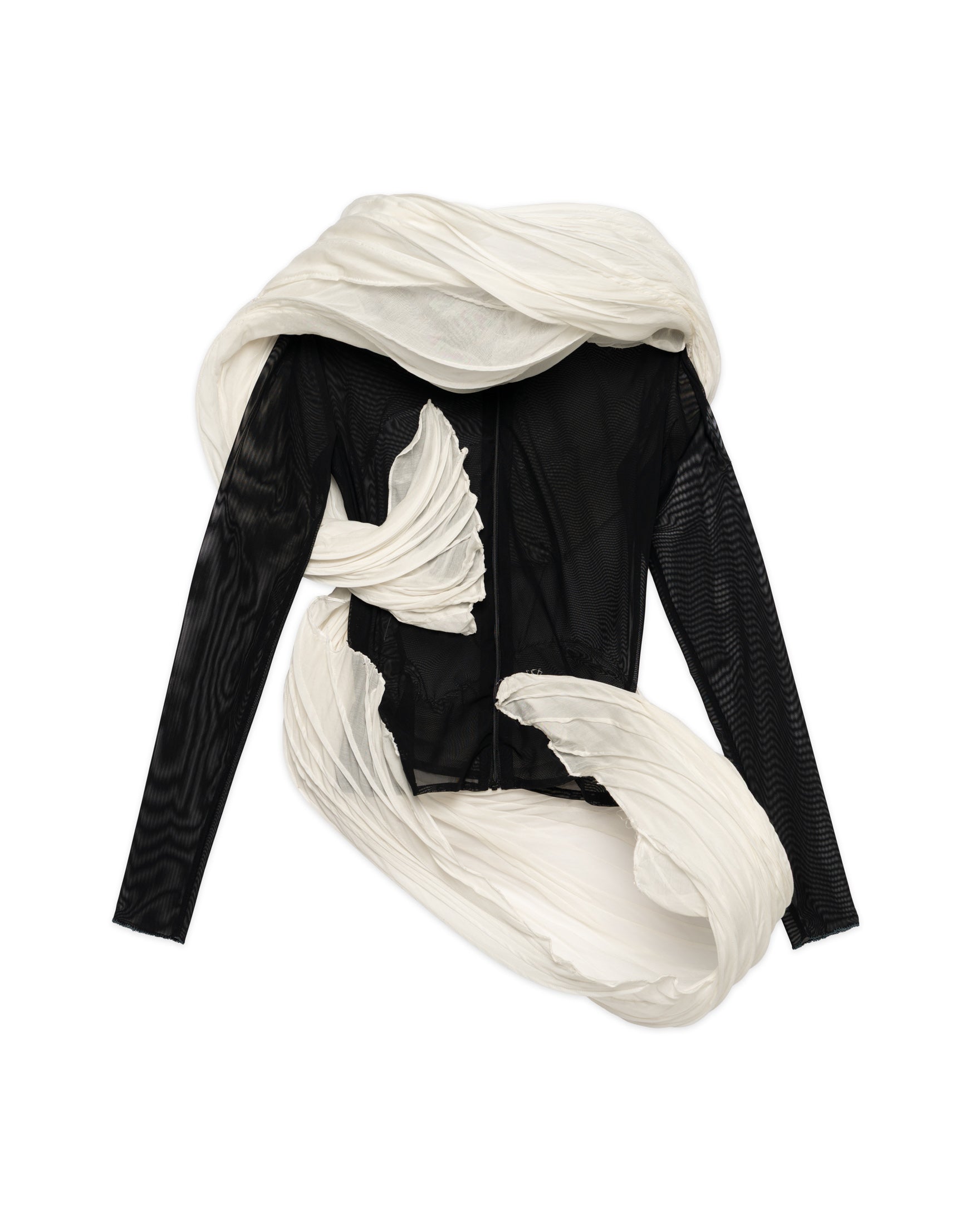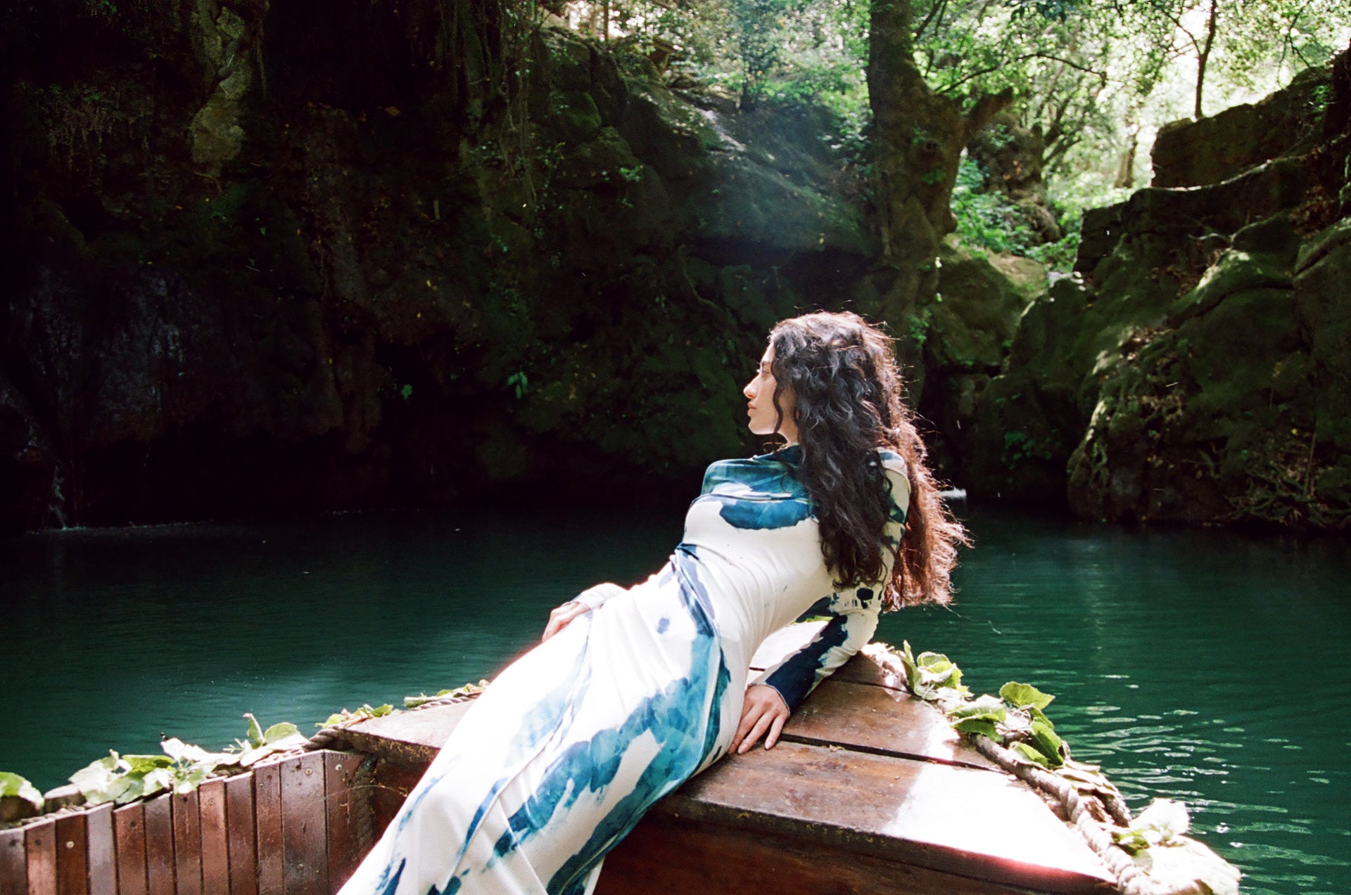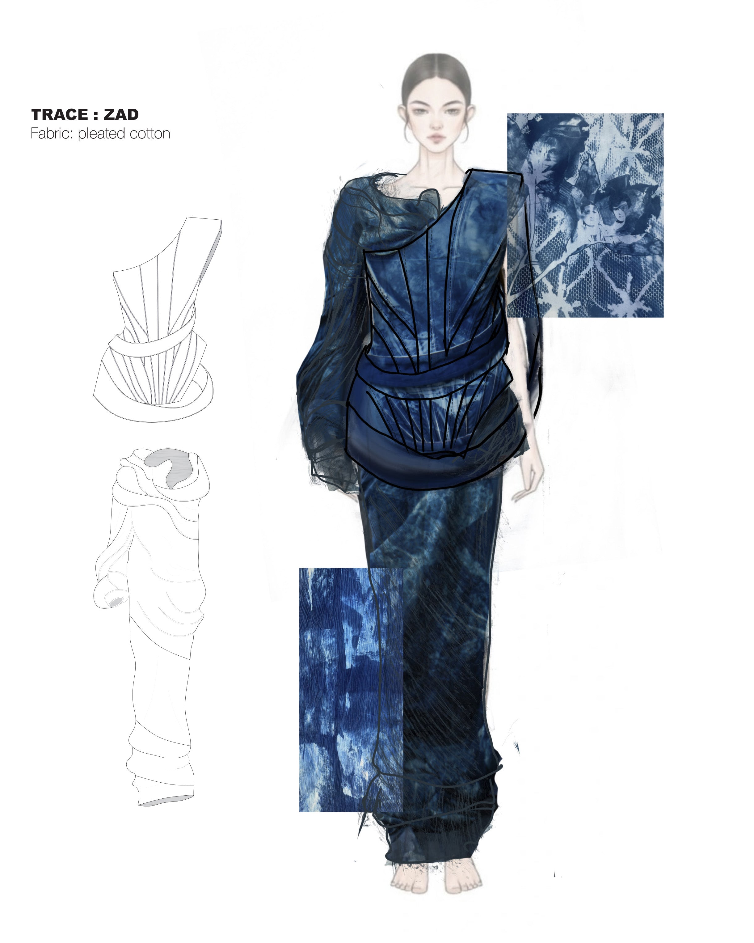 Drawing on Druze philosophy, Vessels likens reincarnation to water adapting to its vessel, with each garment marking a stage in the soul’s journey. Silk, chiffon, organza, cotton, jersey, and voile de coton are pleated, printed, and dyed into a poetic visual language, with handmade folds recalling the Druze Mandeel and cyanotype imprints preserving memory in fabric. Silhouettes shift from veiled forms to freer shapes, while repeated pleats and Shibori patterns echo cycles of rebirth.