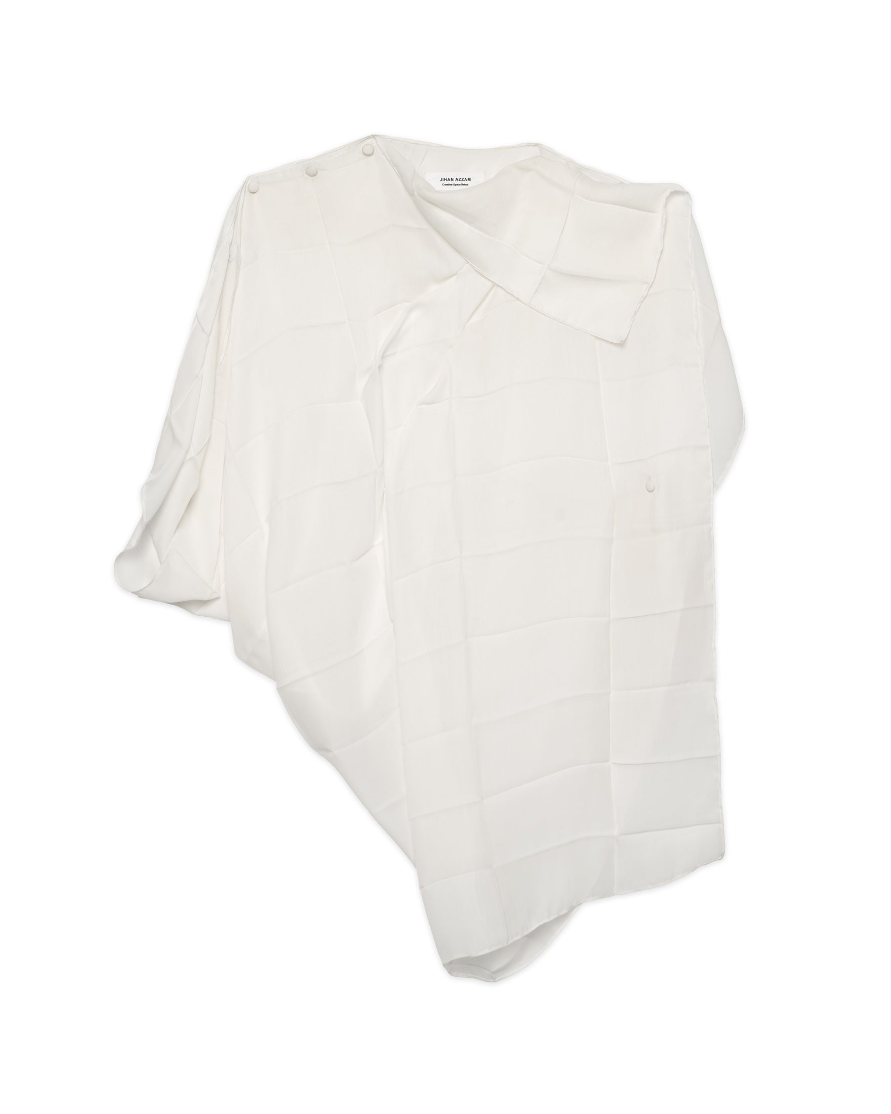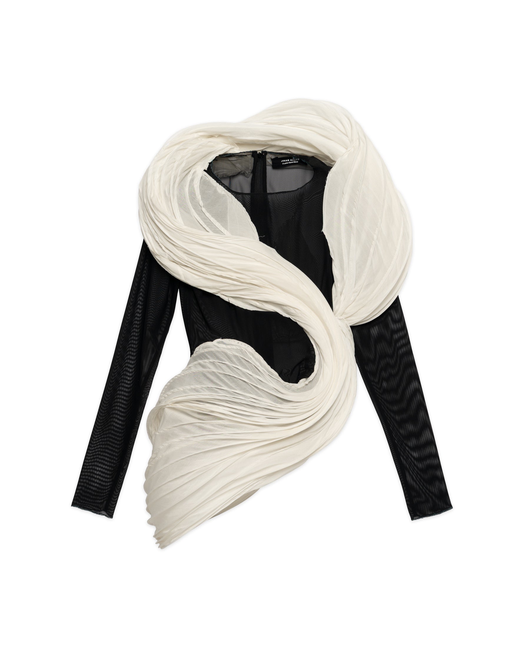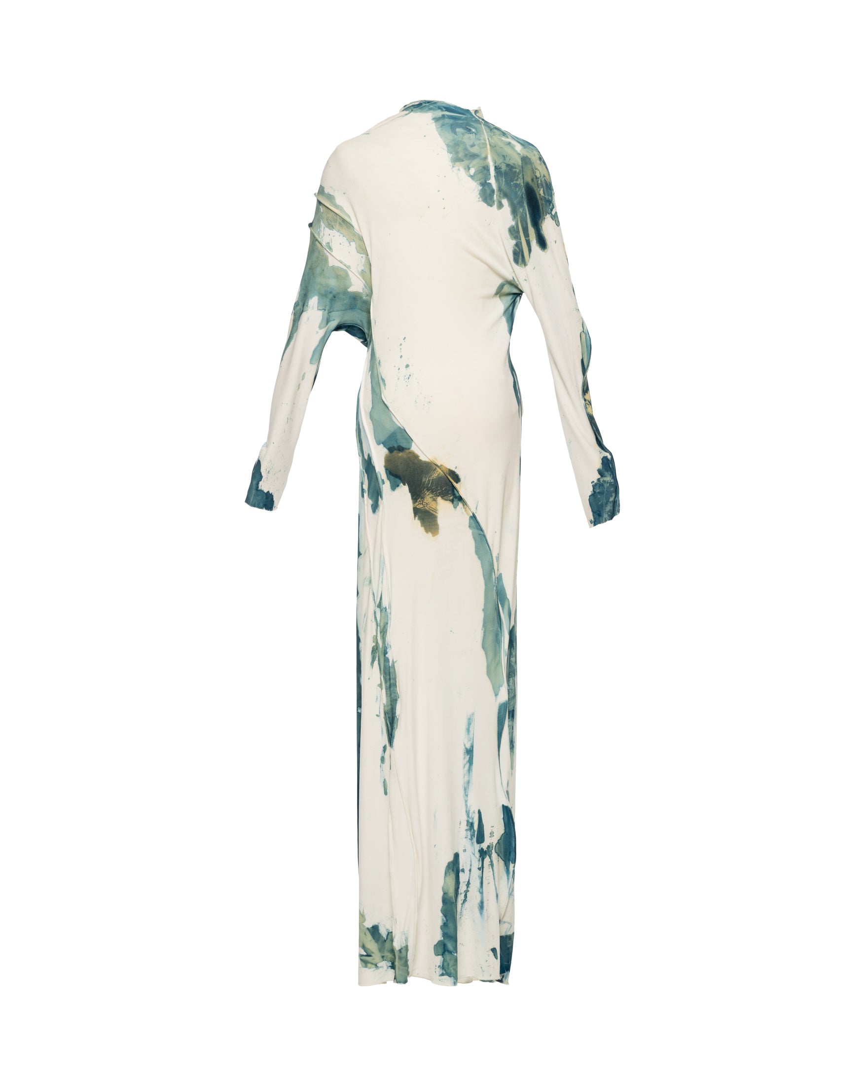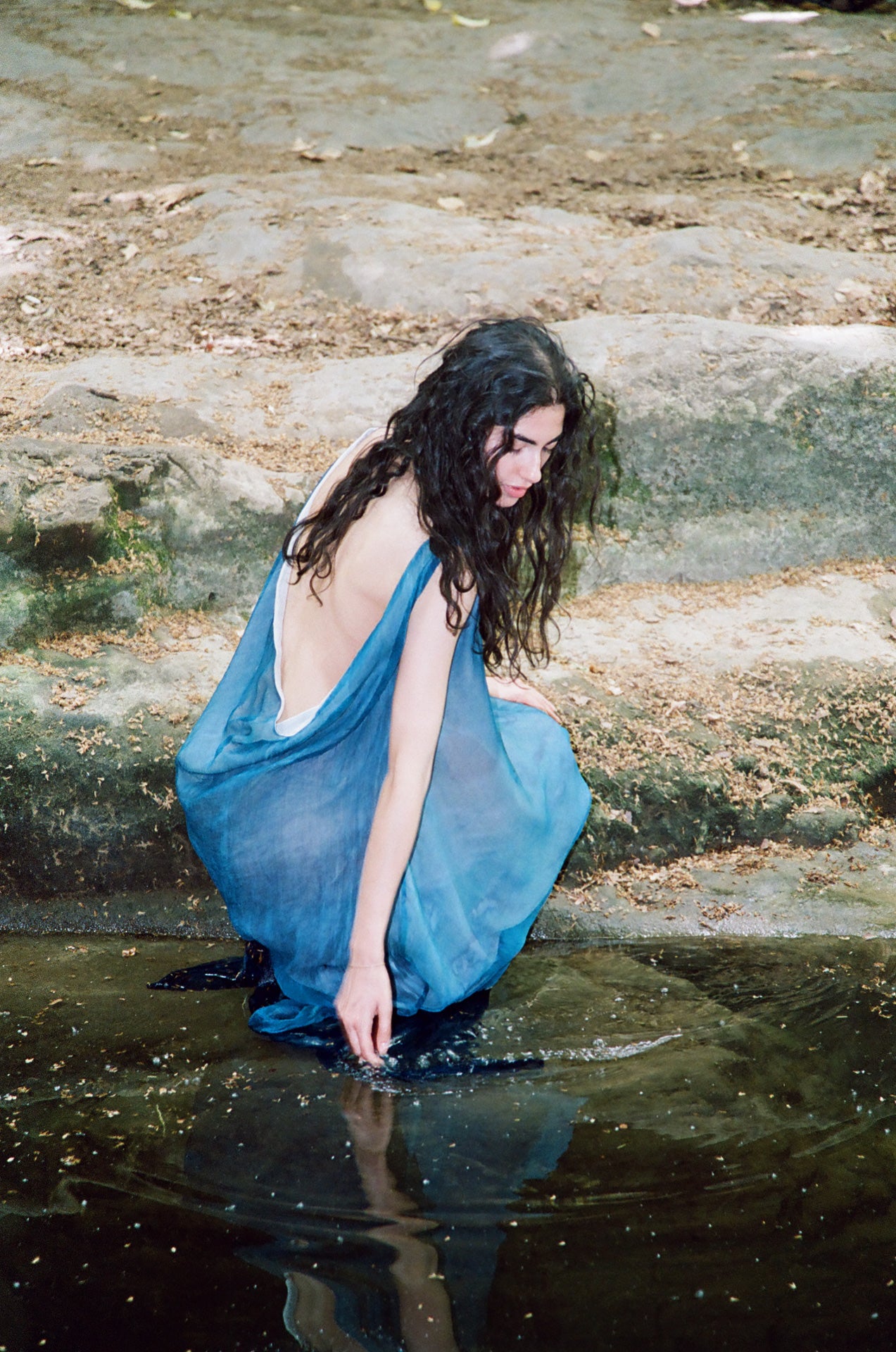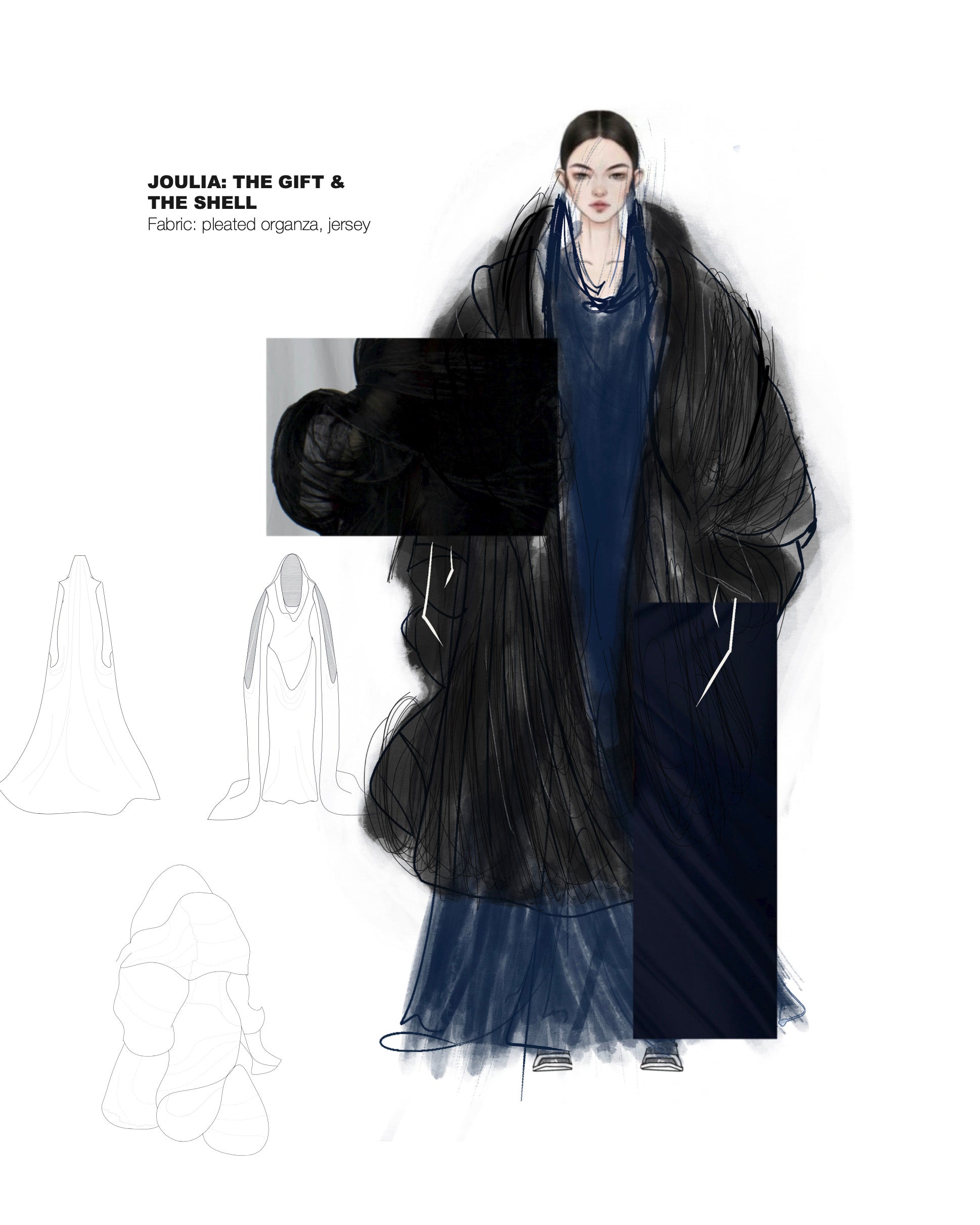 Drawing on Druze philosophy, Vessels likens reincarnation to water adapting to its vessel, with each garment marking a stage in the soul’s journey. Silk, chiffon, organza, cotton, jersey, and voile de coton are pleated, printed, and dyed into a poetic visual language, with handmade folds recalling the Druze Mandeel and cyanotype imprints preserving memory in fabric. Silhouettes shift from veiled forms to freer shapes, while repeated pleats and Shibori patterns echo cycles of rebirth.