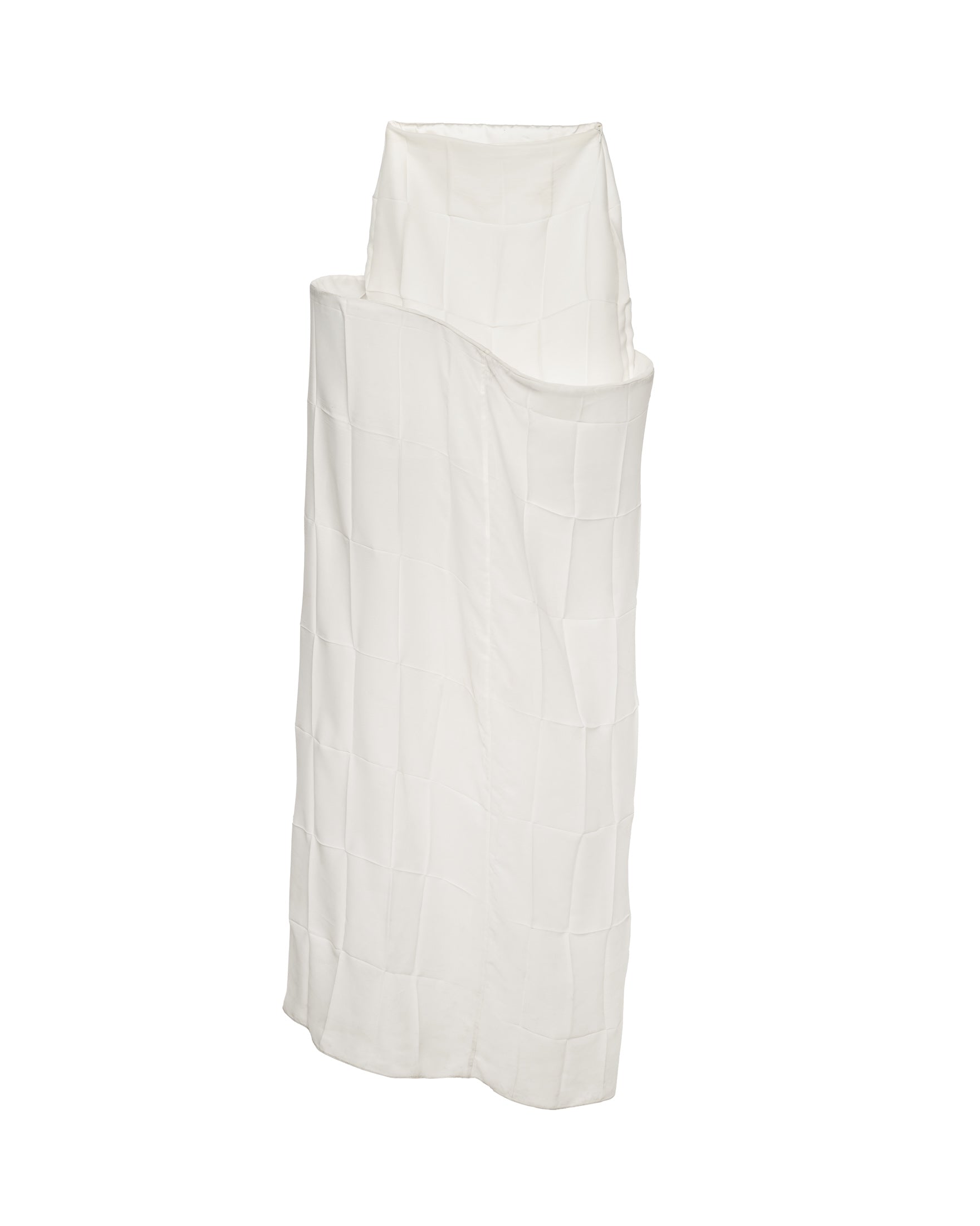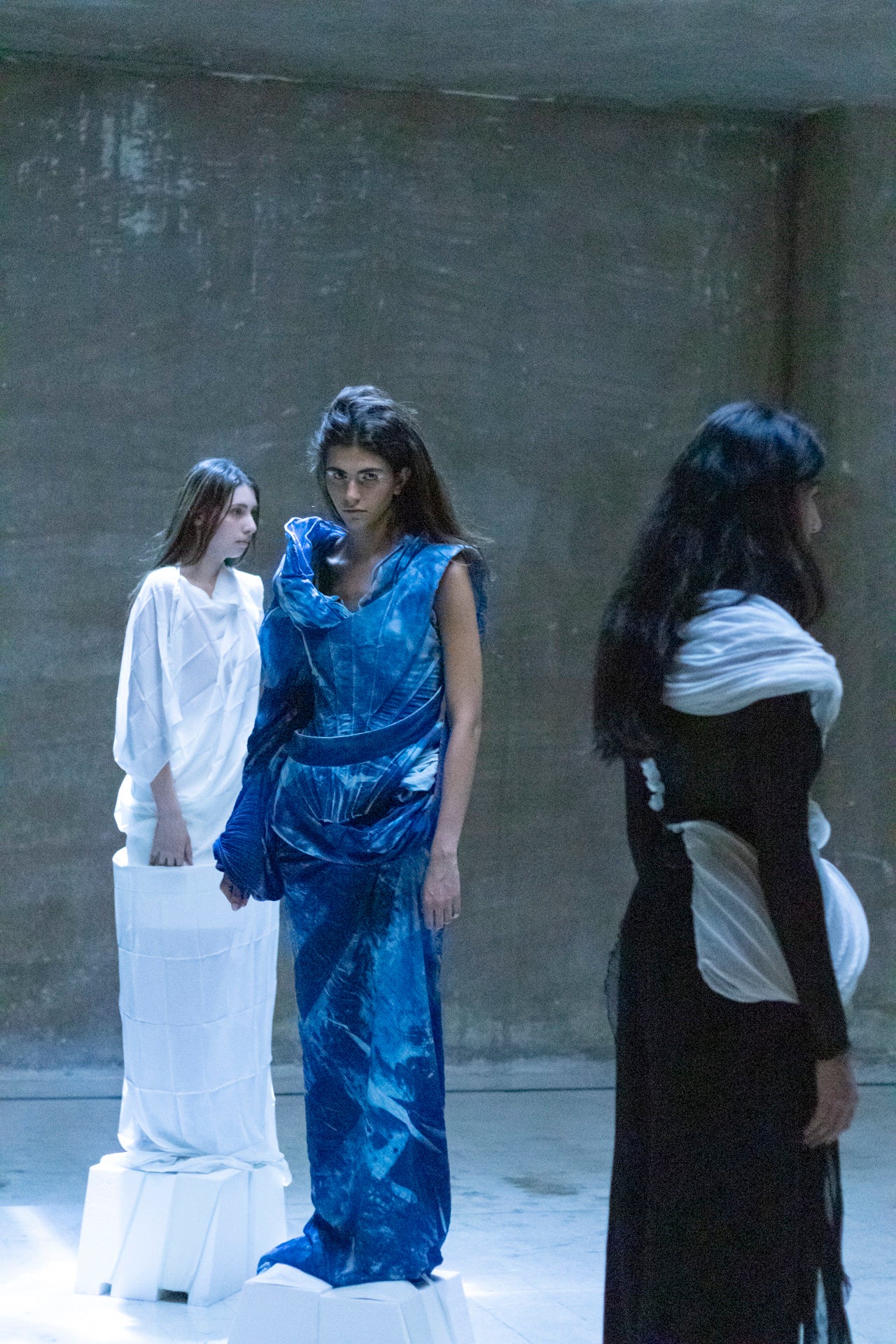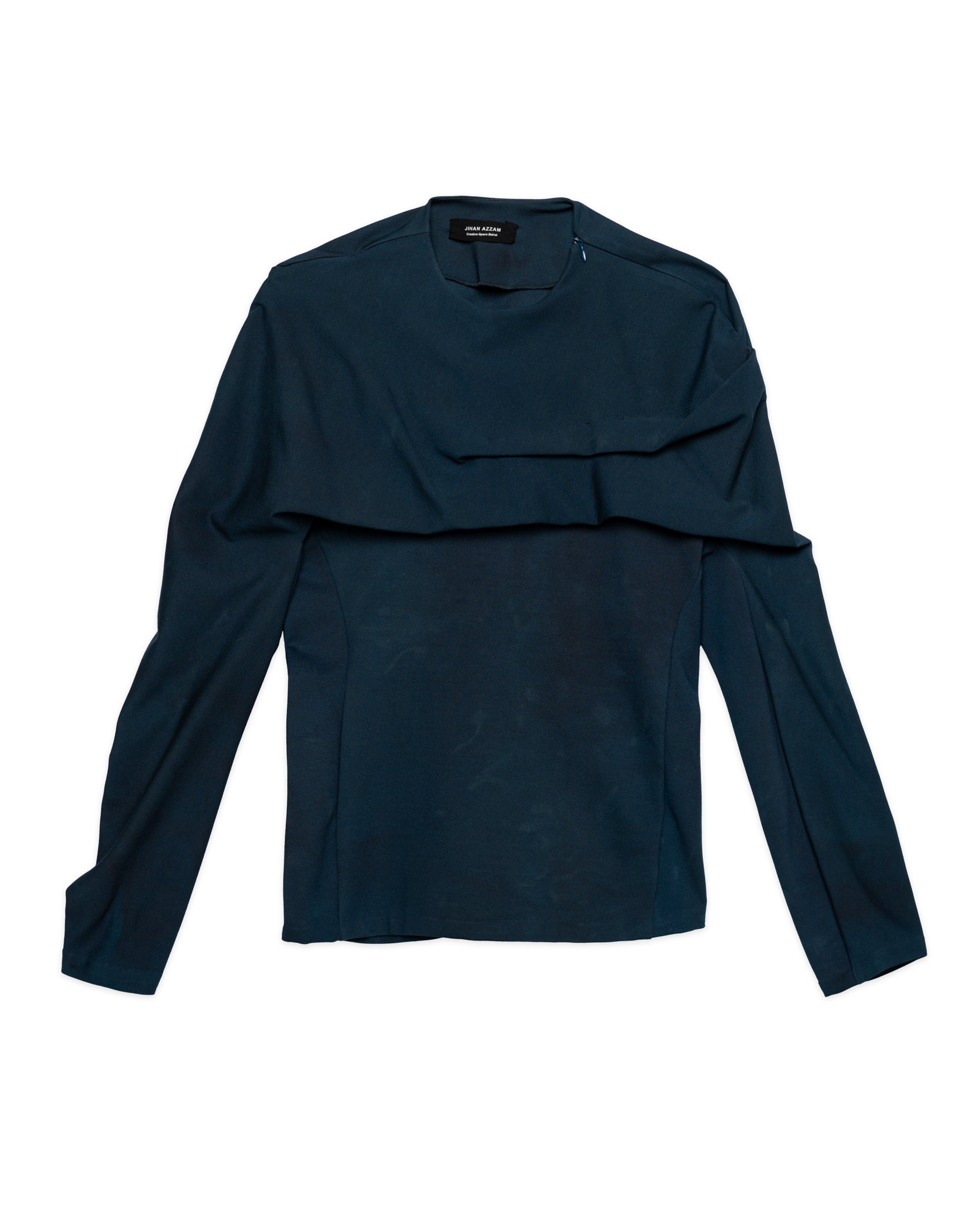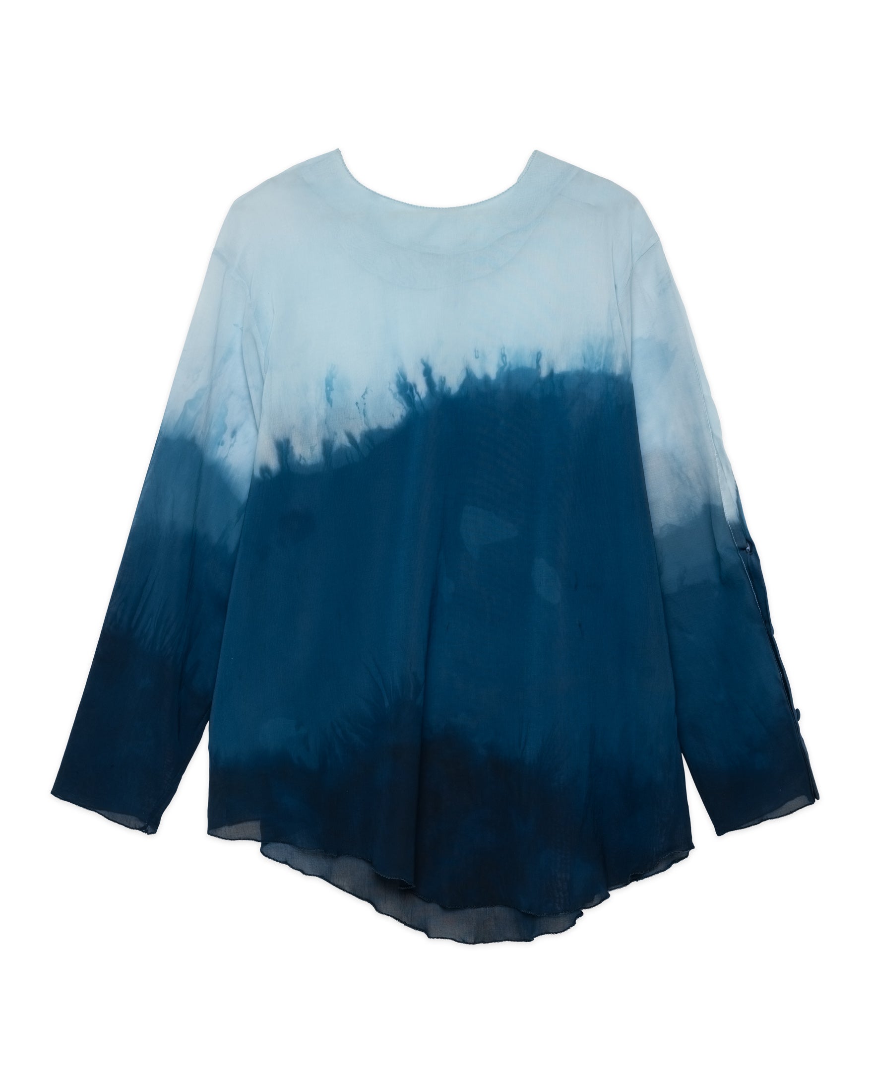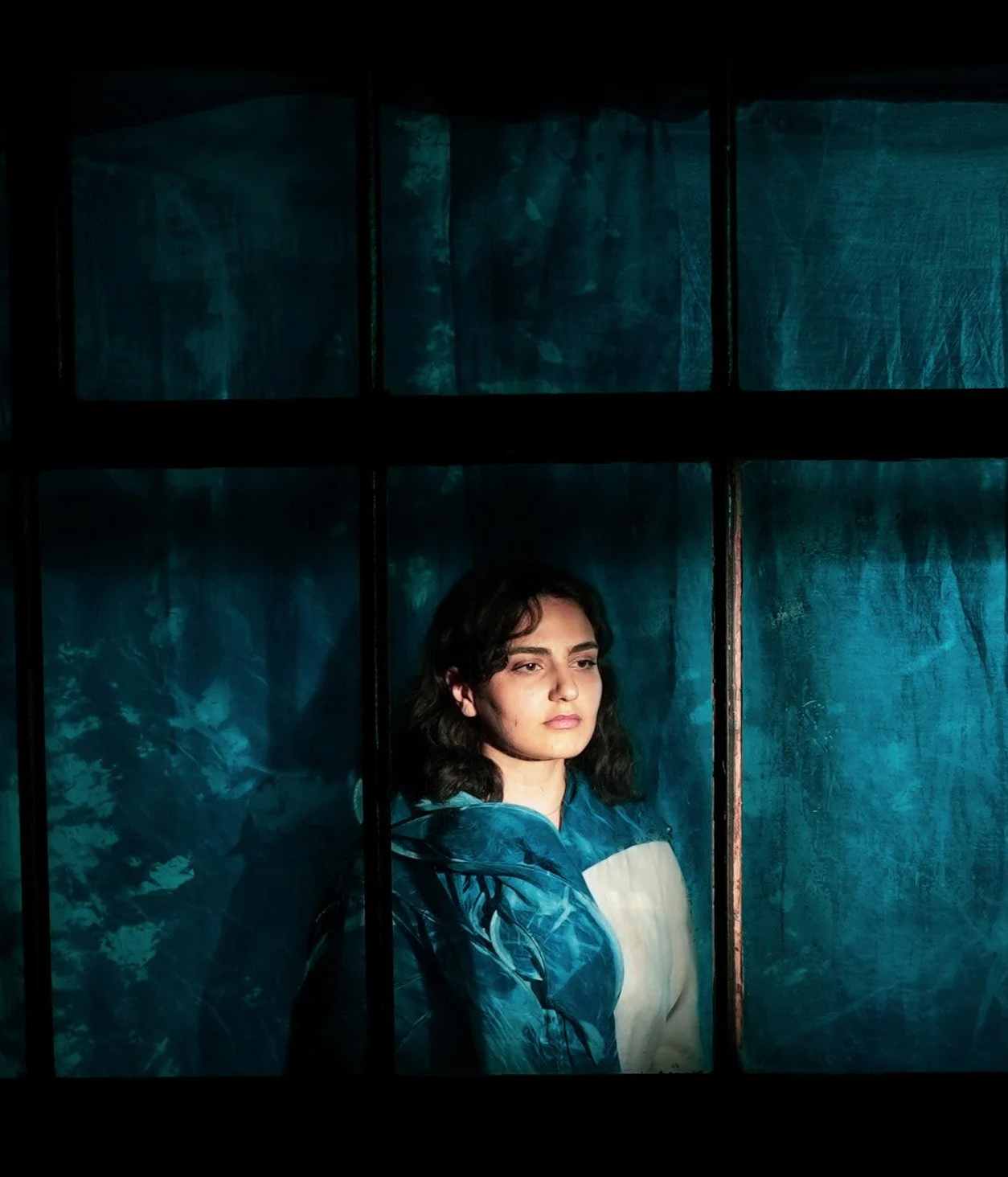 Drawing on Druze philosophy, Vessels likens reincarnation to water adapting to its vessel, with each garment marking a stage in the soul’s journey. Silk, chiffon, organza, cotton, jersey, and voile de coton are pleated, printed, and dyed into a poetic visual language, with handmade folds recalling the Druze Mandeel and cyanotype imprints preserving memory in fabric. Silhouettes shift from veiled forms to freer shapes, while repeated pleats and Shibori patterns echo cycles of rebirth.