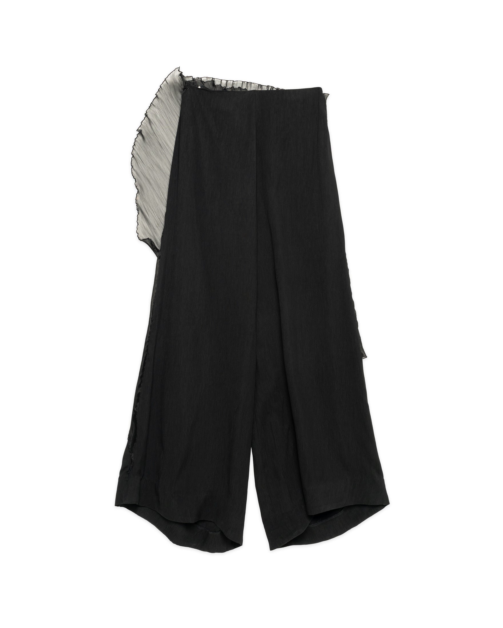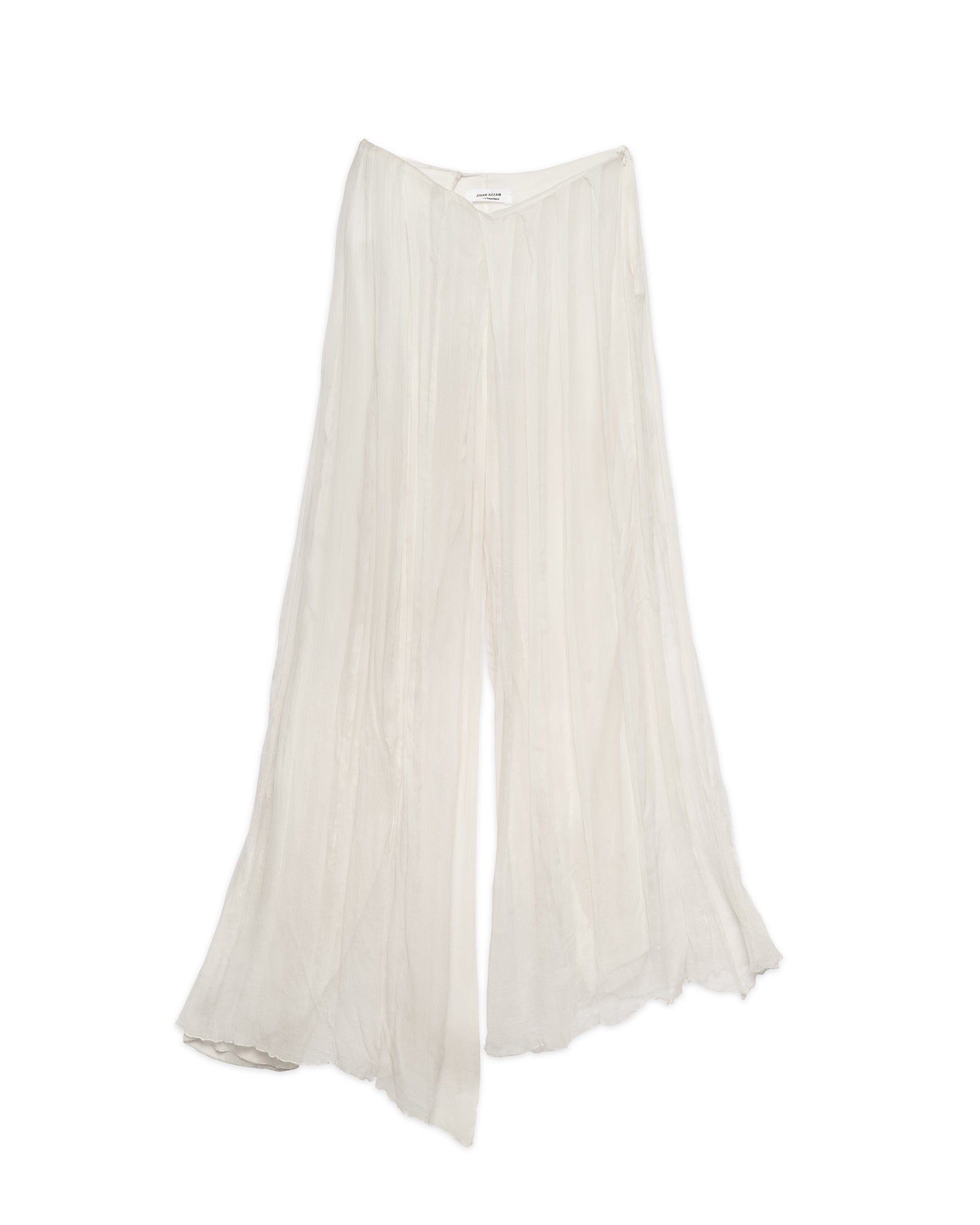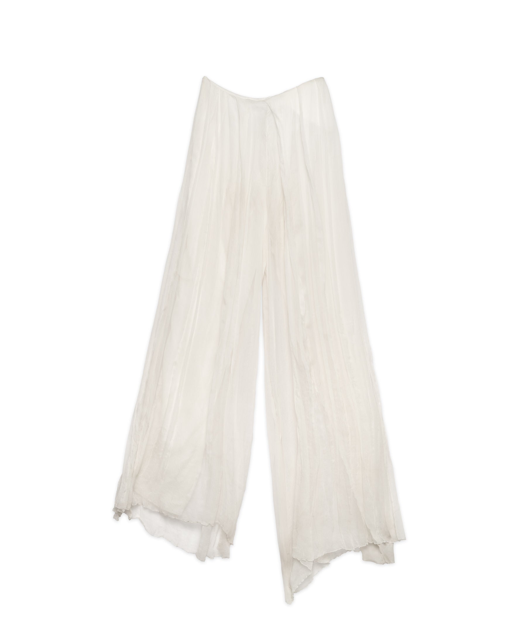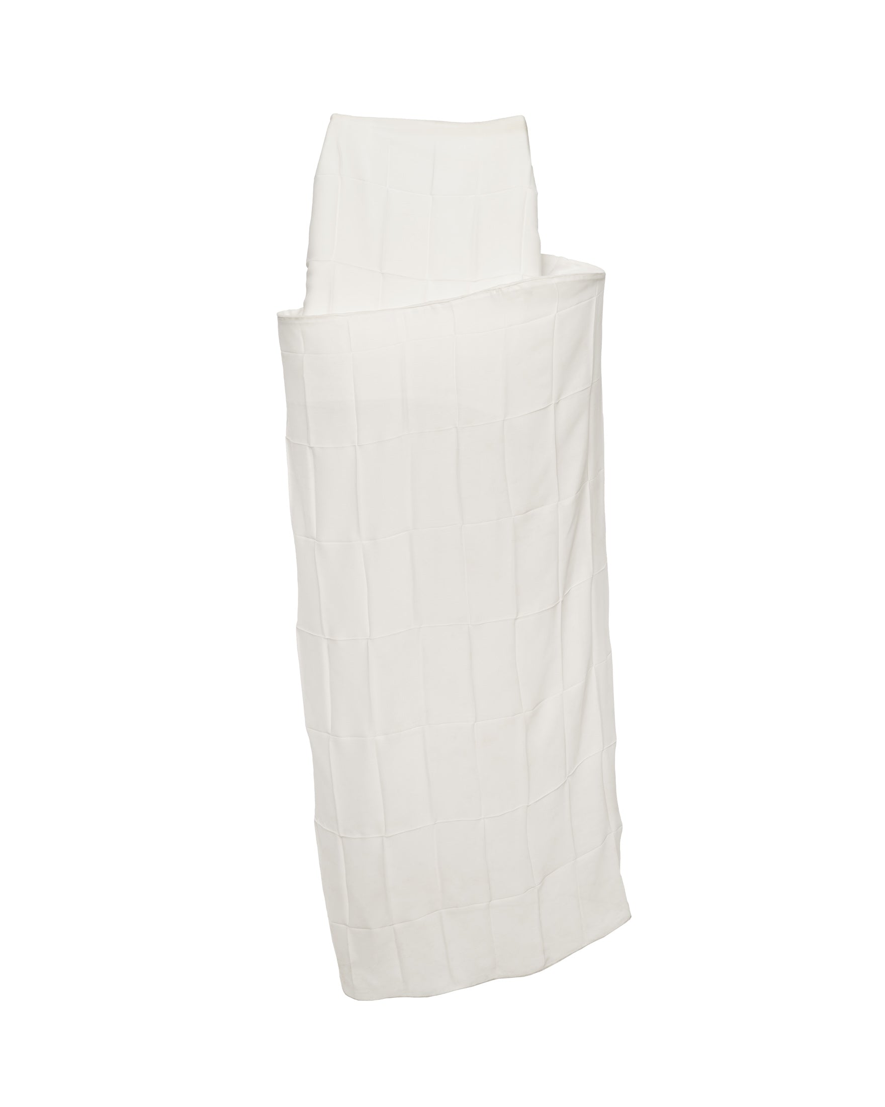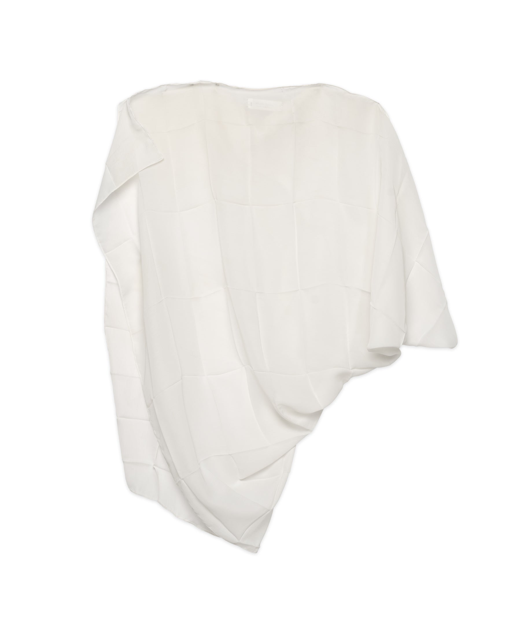 Drawing on Druze philosophy, Vessels likens reincarnation to water adapting to its vessel, with each garment marking a stage in the soul’s journey. Silk, chiffon, organza, cotton, jersey, and voile de coton are pleated, printed, and dyed into a poetic visual language, with handmade folds recalling the Druze Mandeel and cyanotype imprints preserving memory in fabric. Silhouettes shift from veiled forms to freer shapes, while repeated pleats and Shibori patterns echo cycles of rebirth.