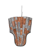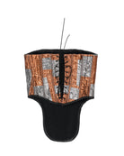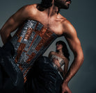 A shining, long corset made from a patchwork of metal, muslin, and cotton base fabric.
