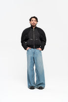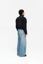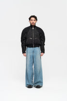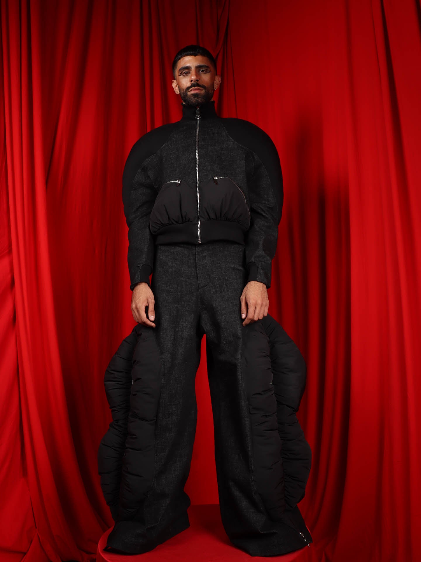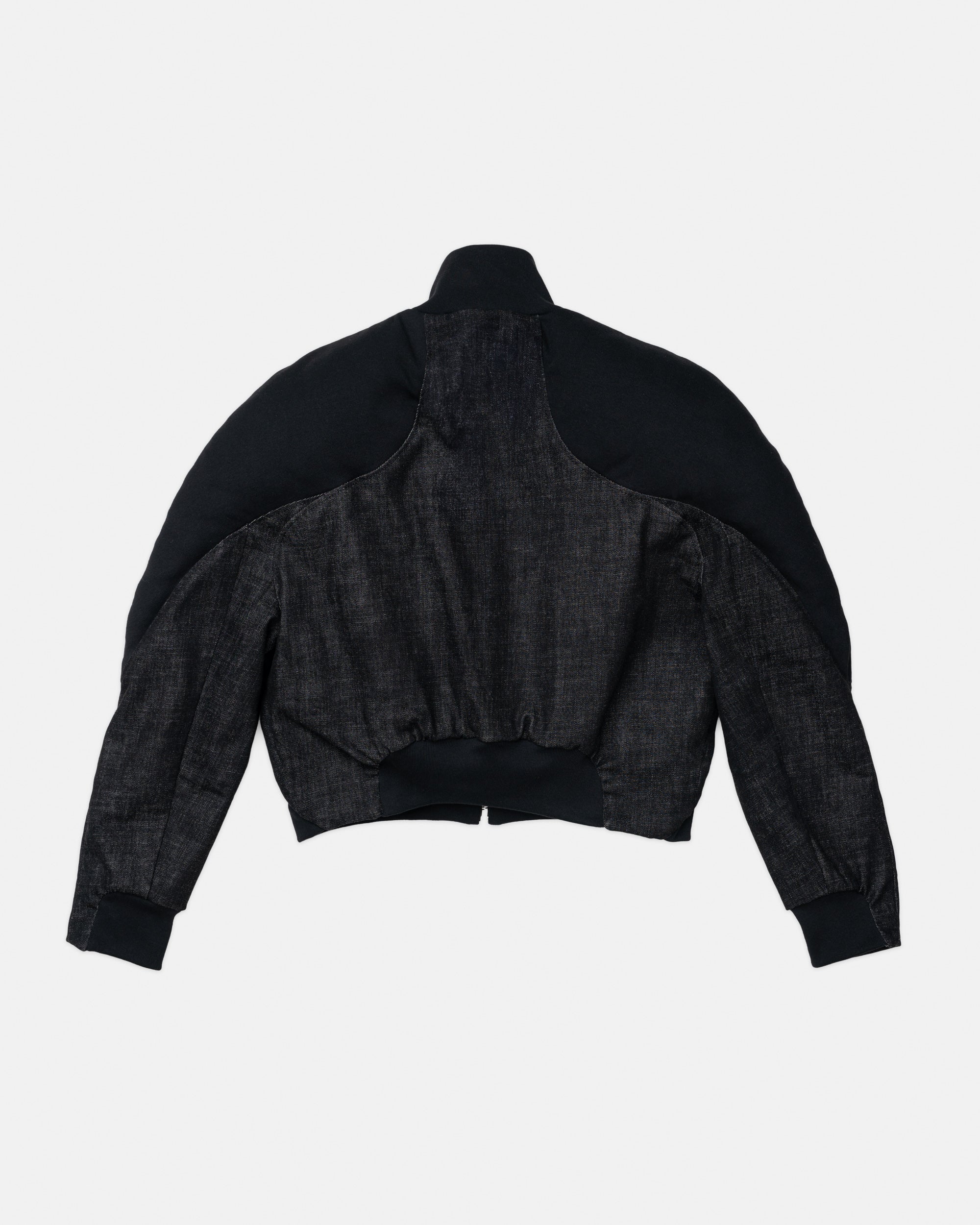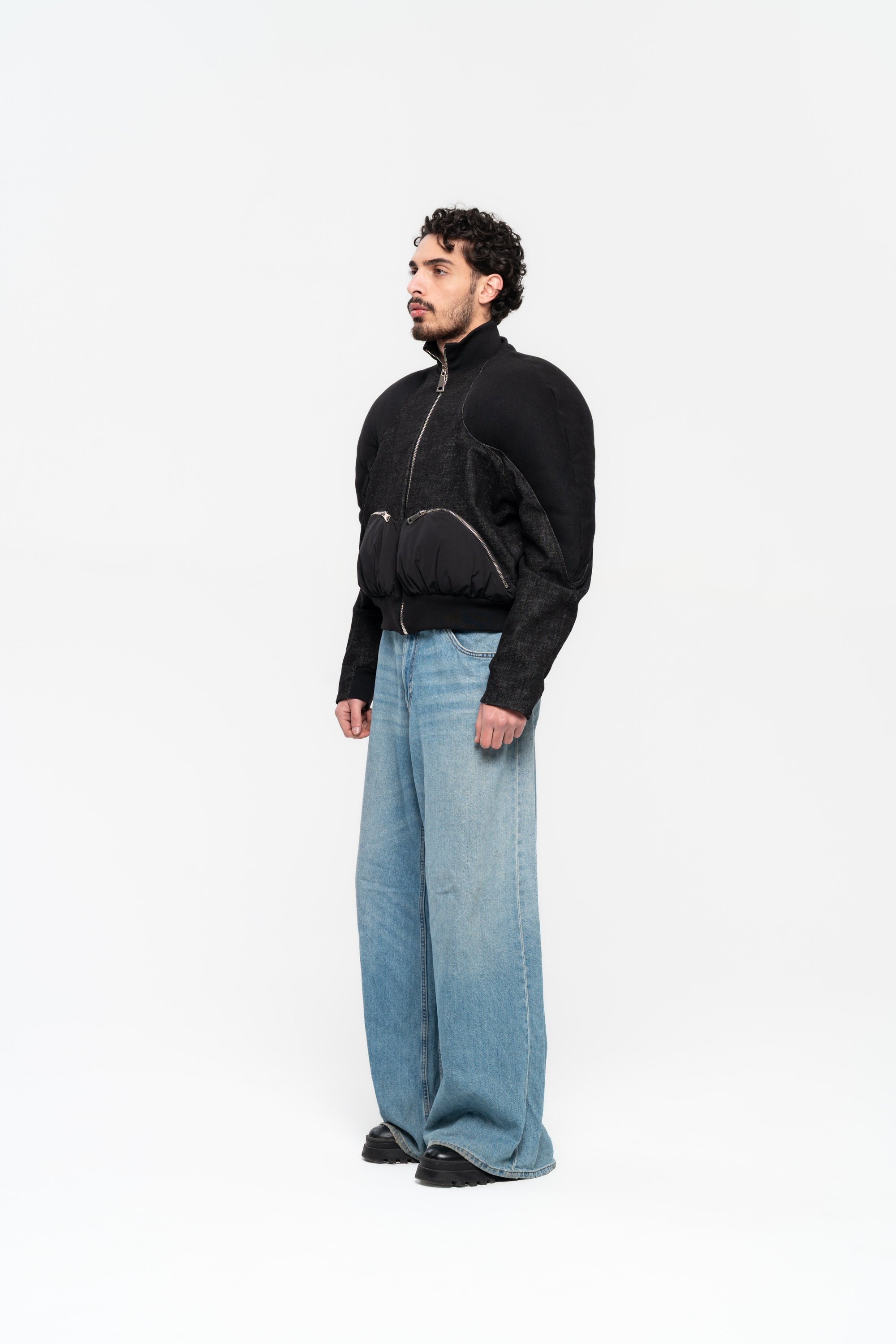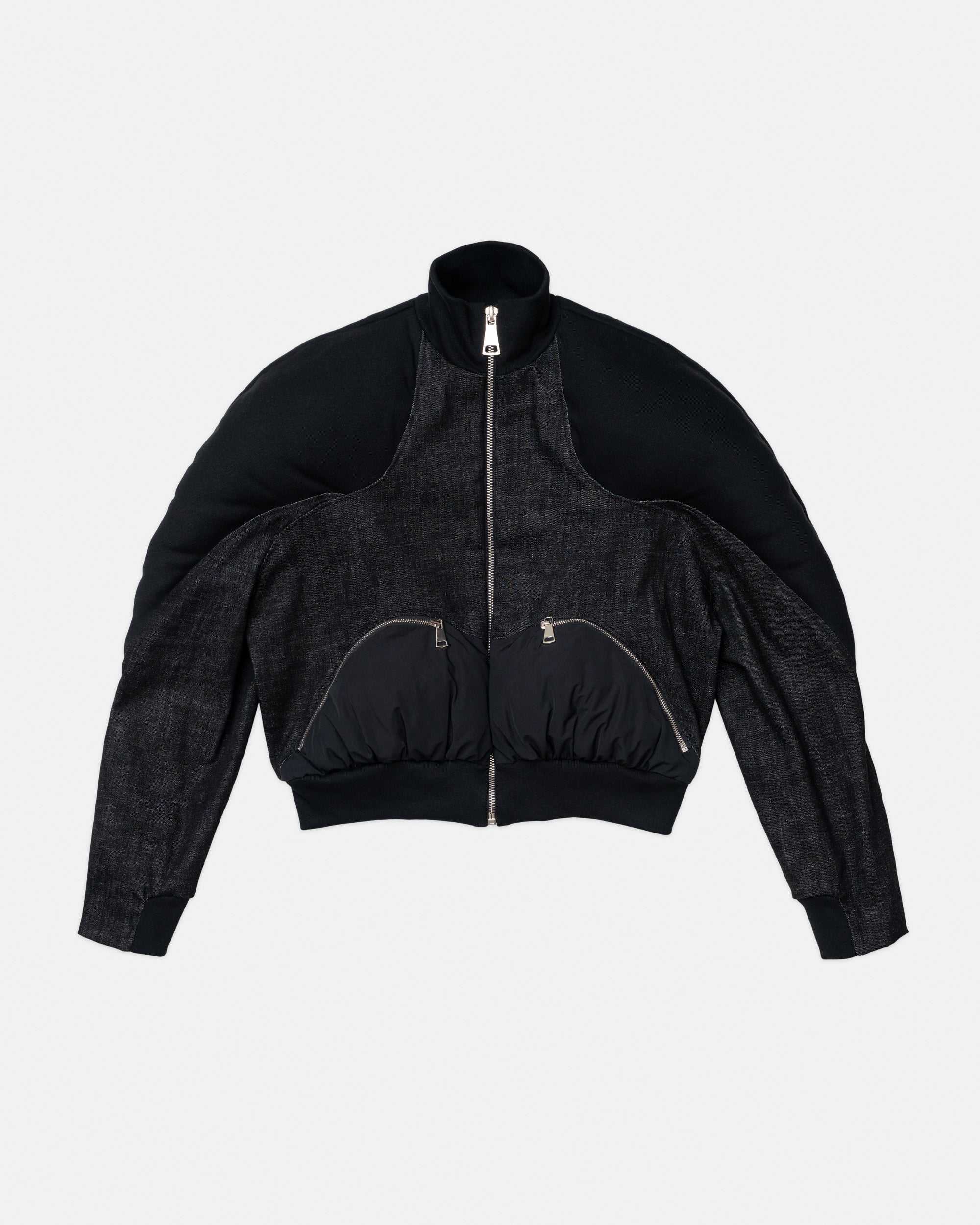 Black denim turtleneck jacket with puffed lip shoulders and pockets and zippers on the waist.