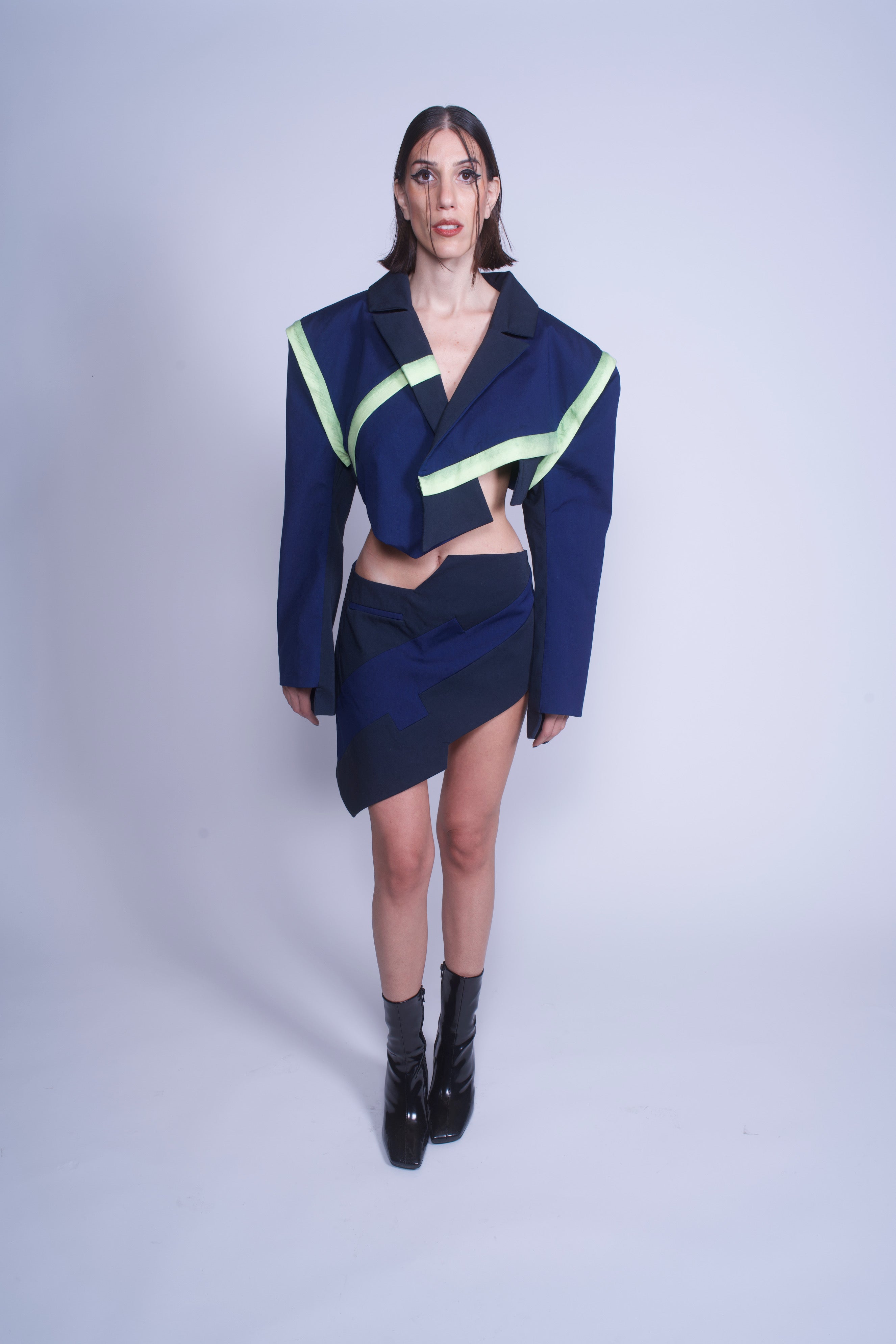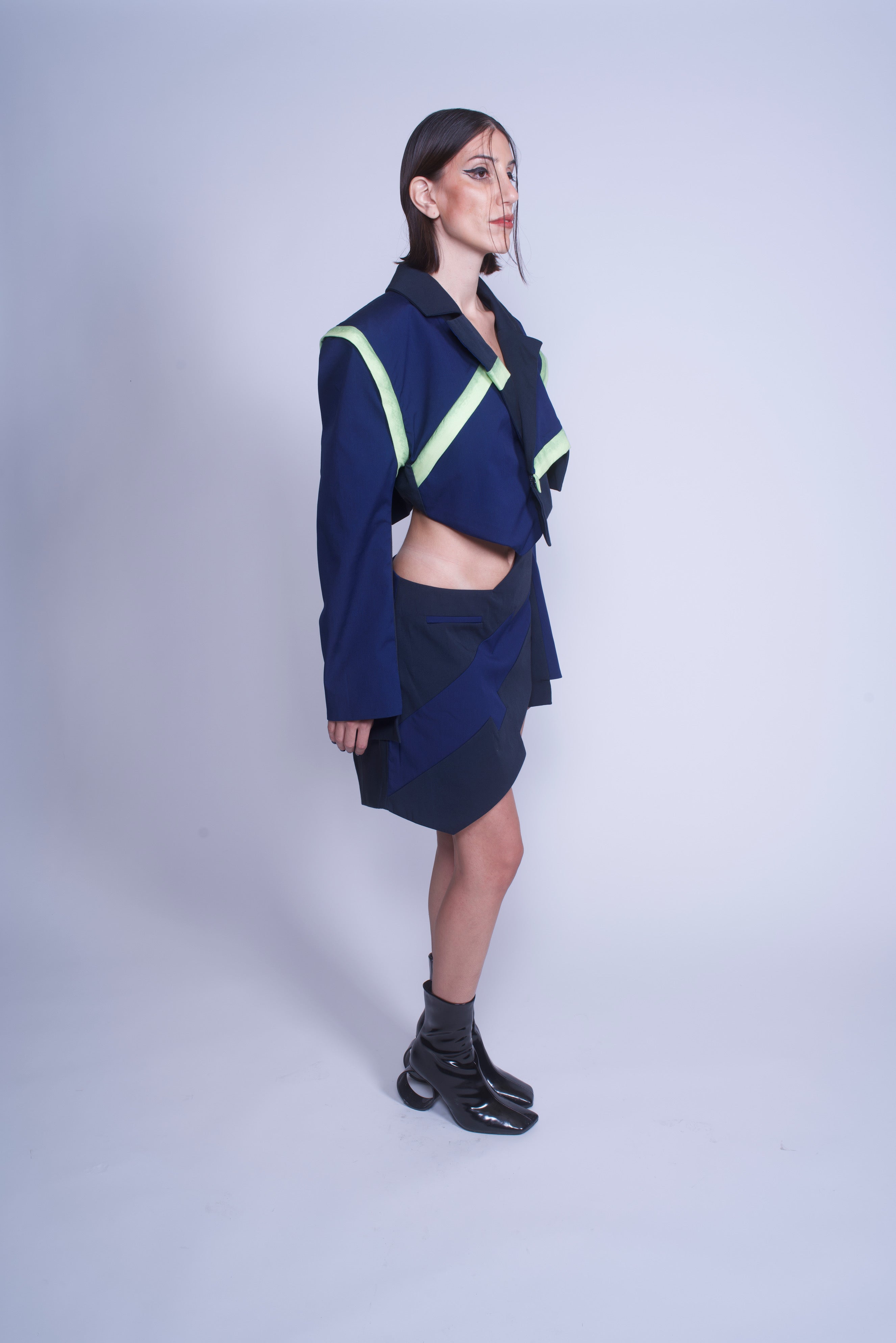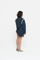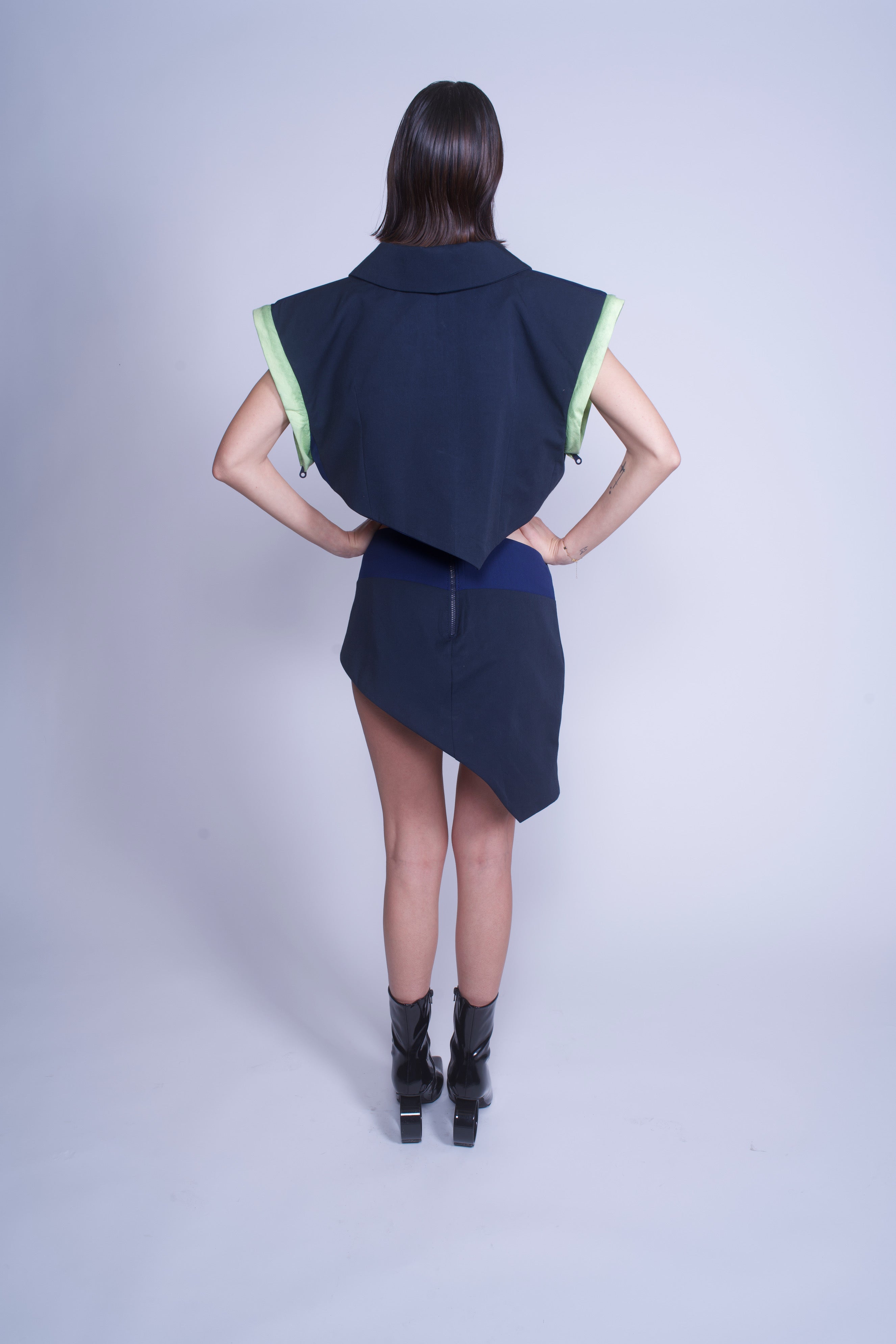 Asymmetrical hem puzzle detailed jacket with hidden zippers on armholes for removable sleeves, hidden pocket, and hand painted green poplin cuts for neon line effect.